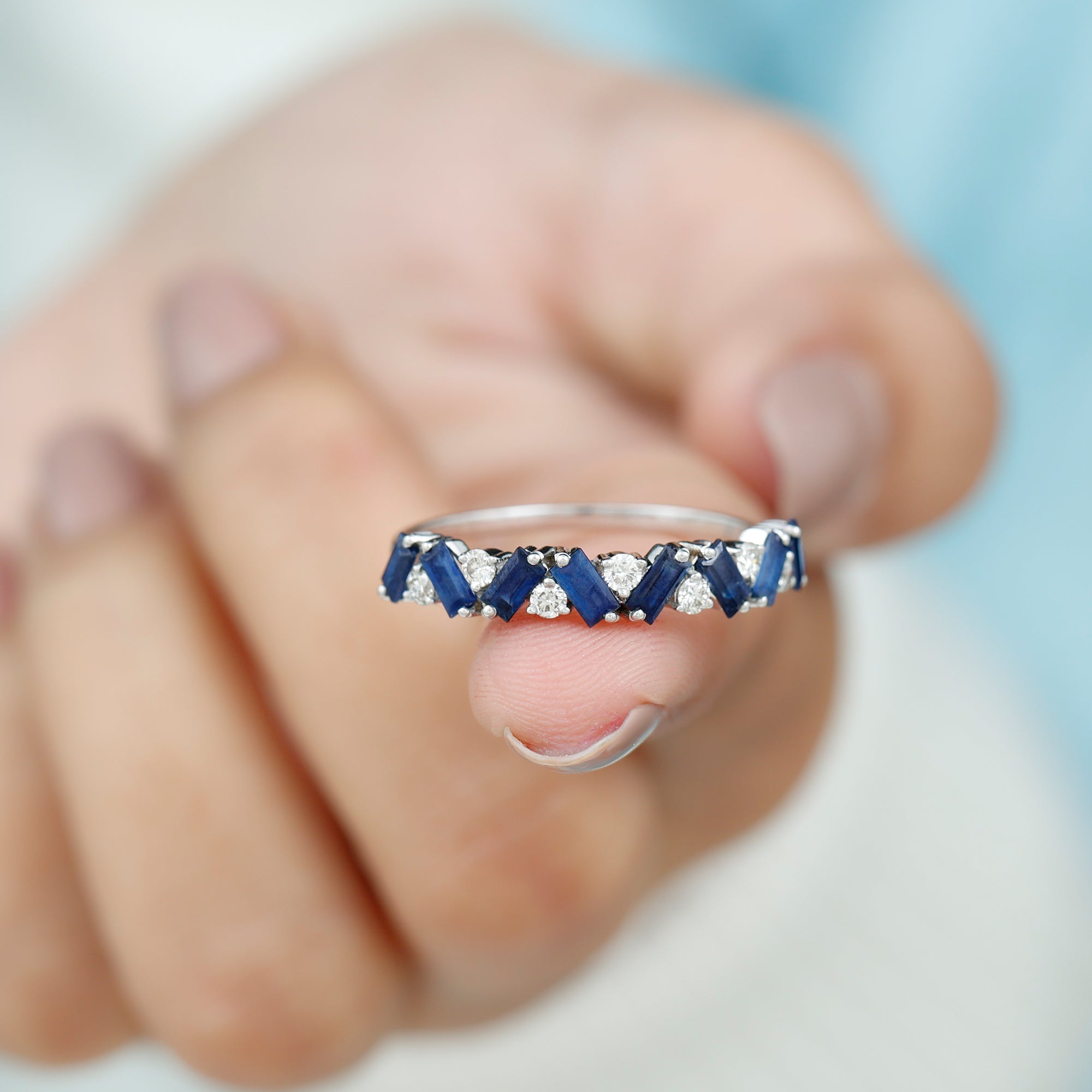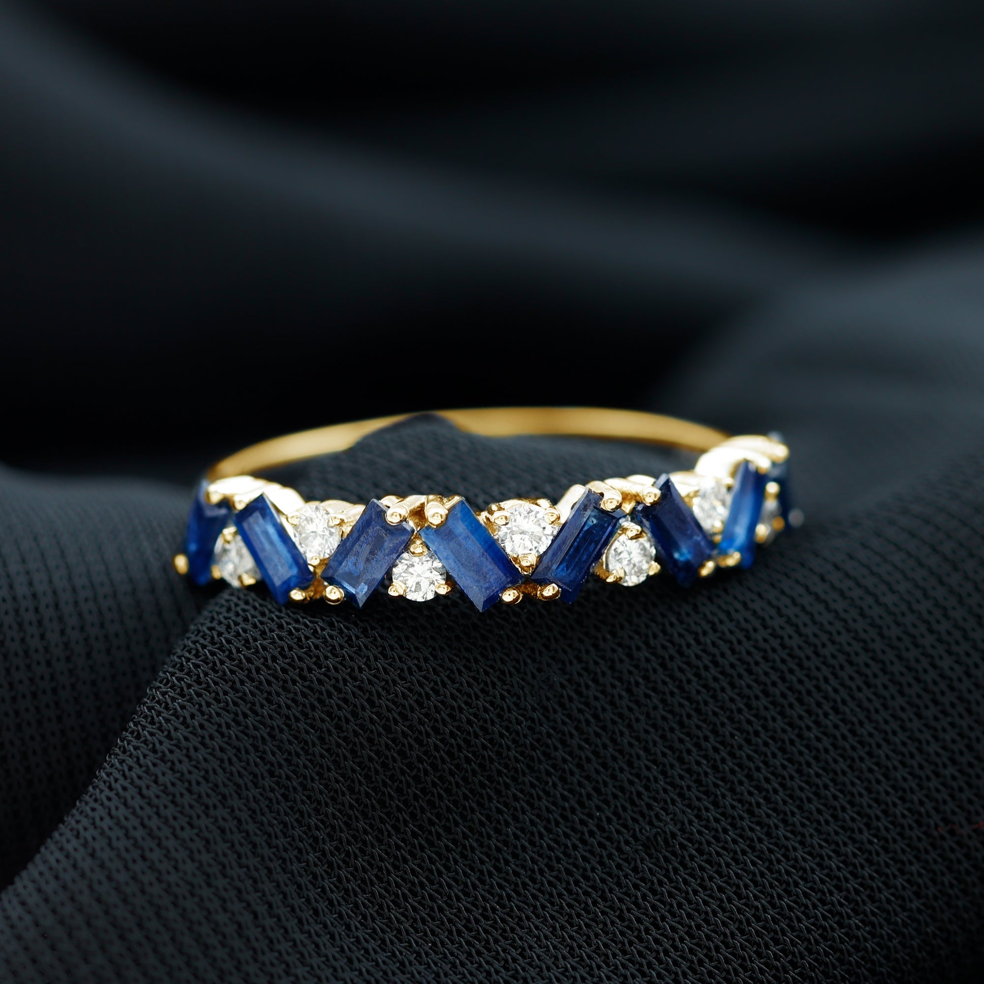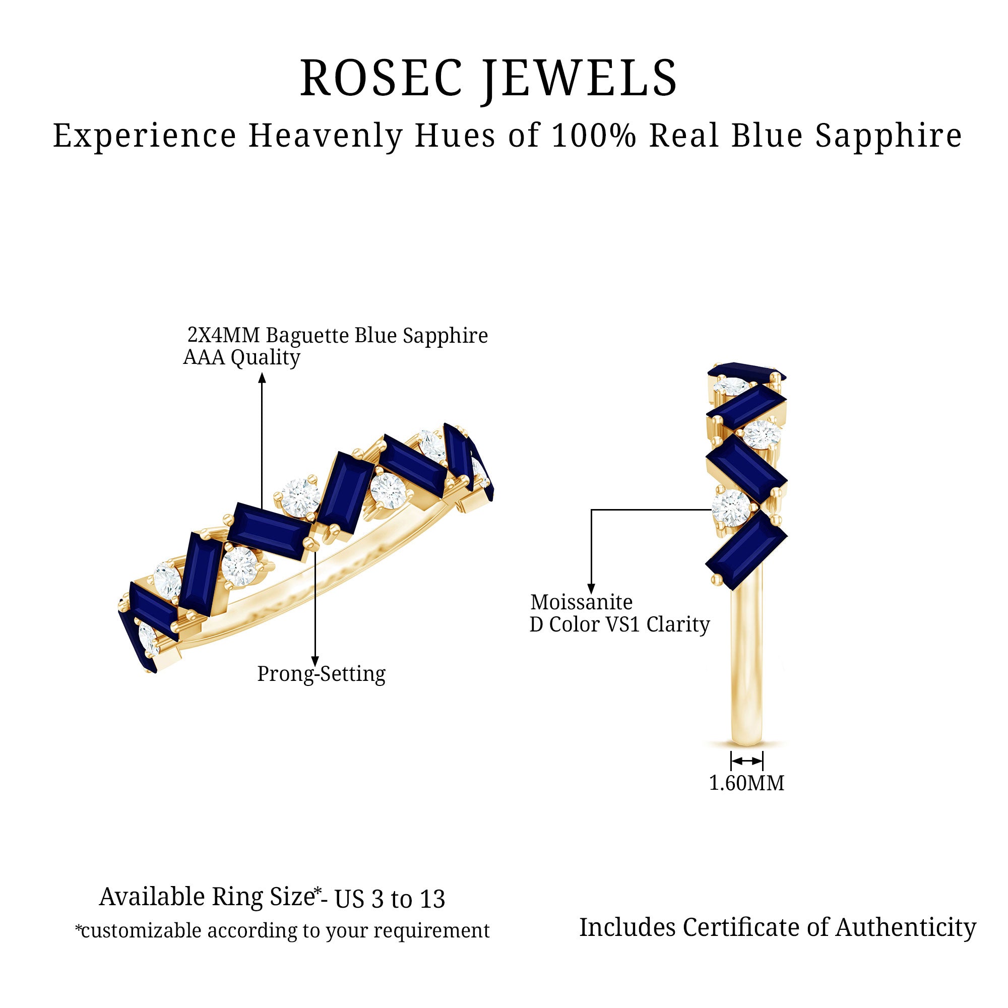 Turn heads while you flaunt this stunning Blue Sapphire Eternity Ring in your gorgeous hands. The Half Eternity Ring showcases Baguette Cut Blue Sapphire Gemstones and Round Cut moissanite stones set in a zig zag pattern in prong setting. Mesmerizing Solid Gold Build makes this Eternity Ring for Women a perfect gift for surprising your precious one on valentines day.