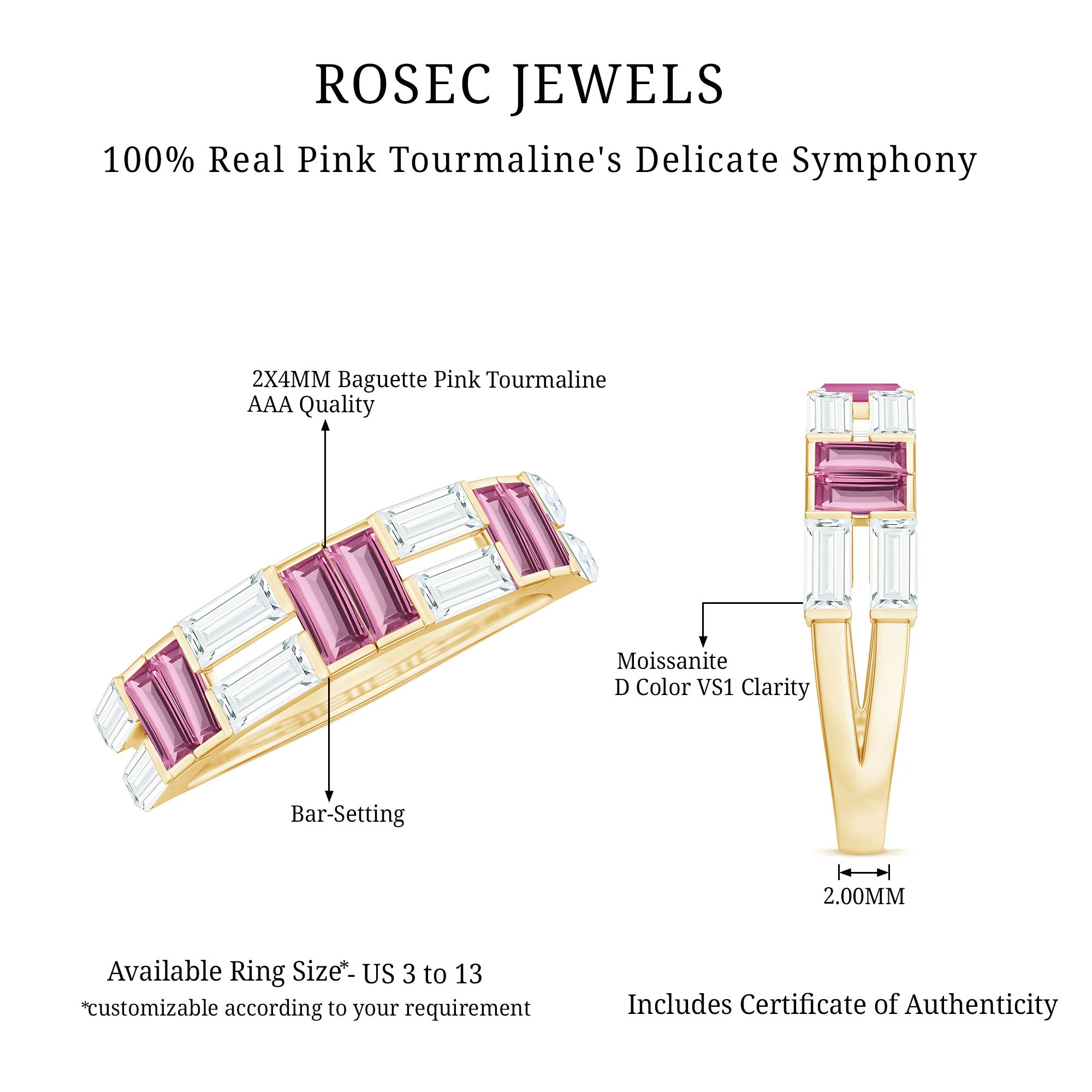 Elevate your style with this Half Eternity Ring adorned with Baguette Shape Pink Tourmaline alternate with brilliant Moissanite gemstones, creating a mesmerizing symphony of colors and sparkle. The chic and contemporary design exudes elegance and grace, perfect for those with a taste for unique beauty.
