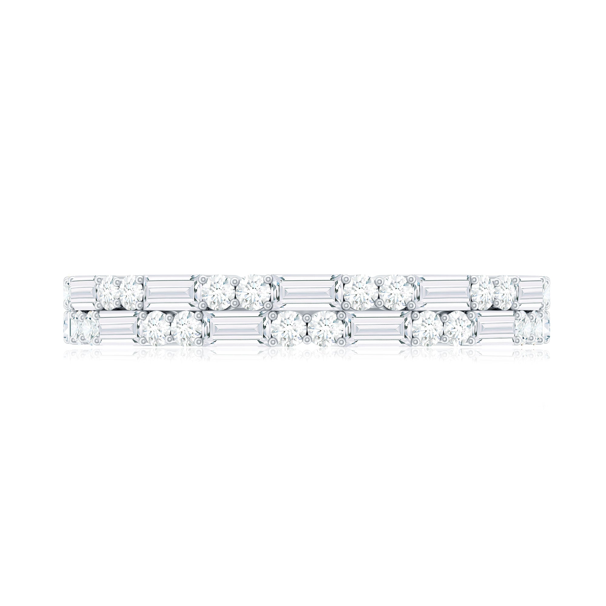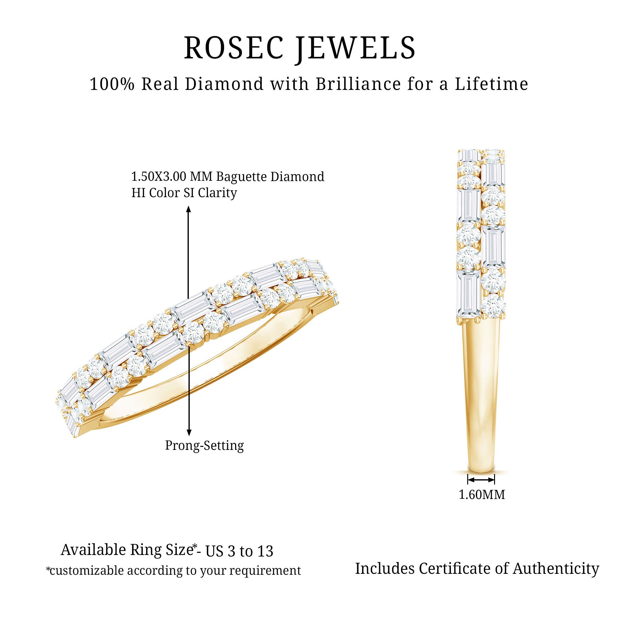 Your love is forever, and this baguette diamond half eternity ring is the perfect way to symbolize it. The ring features small sparkling baguette diamonds arranged in a half eternity band along with round shape shimmering Diamonds, representing your everlasting love. The prong setting ensures the safety and durability of the stones. This ring is sure to get more attention and make a statement, wherever you go.