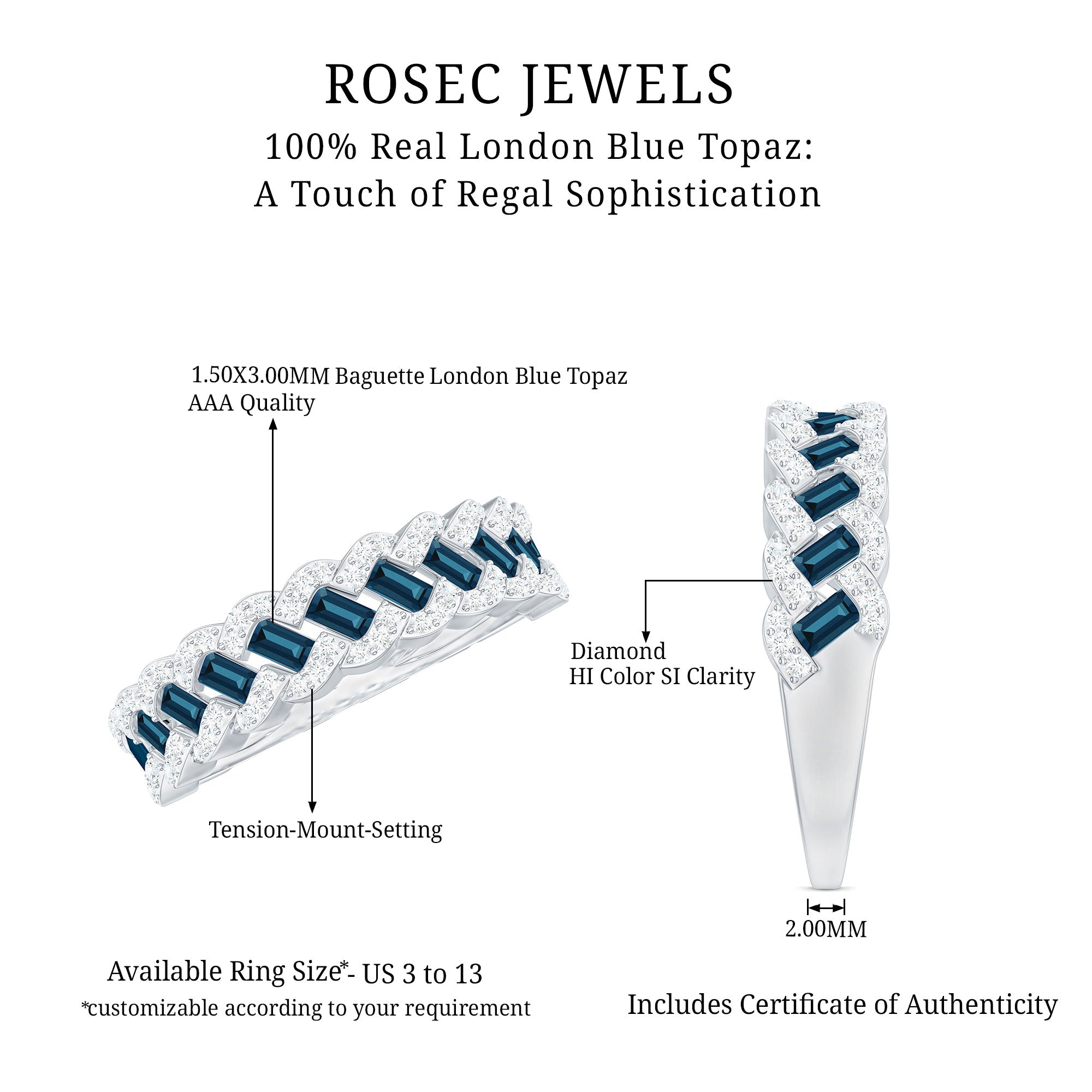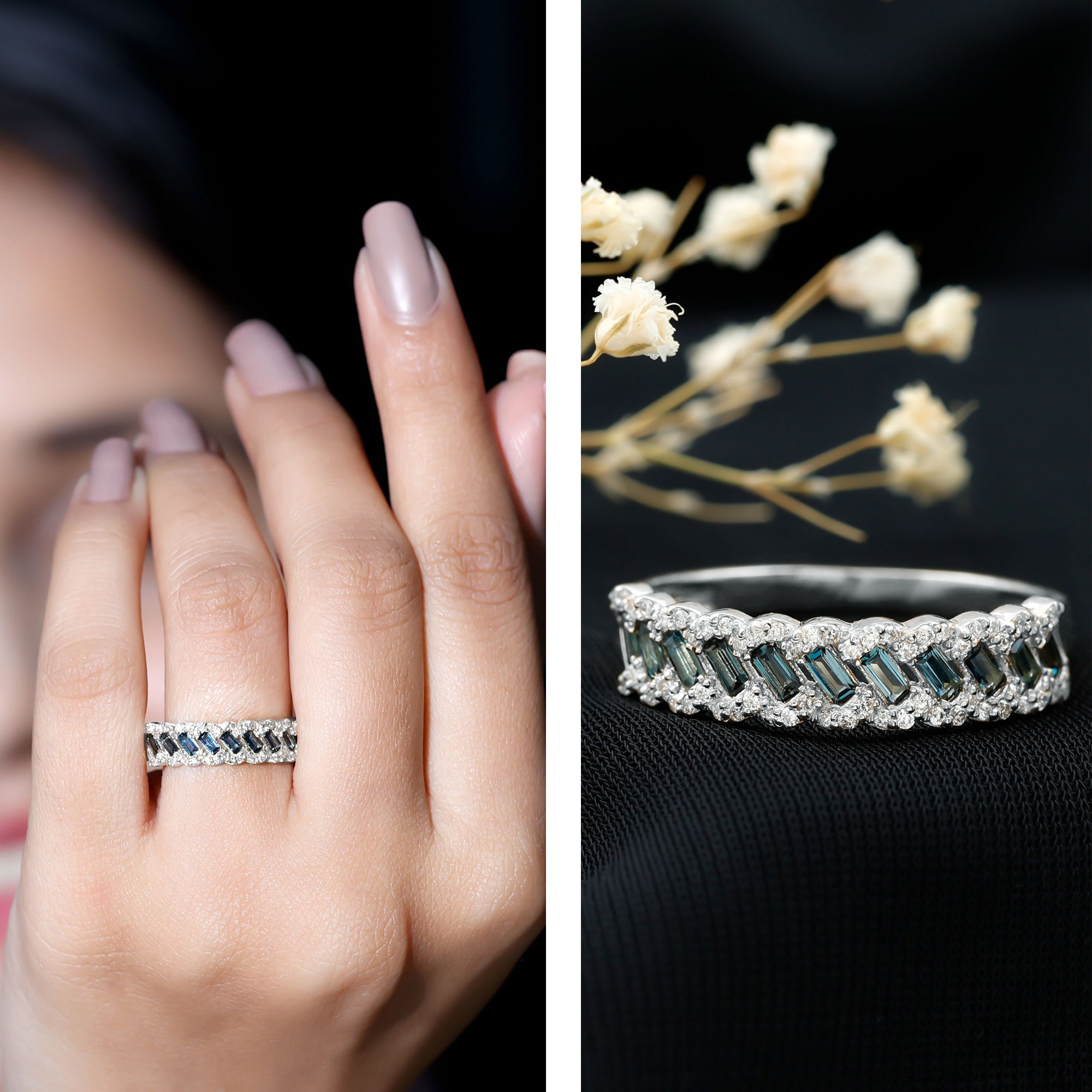 Discover a novel interpretation of the classic London Blue Topaz Ring, crafted to make a remarkable impression and ensure you are noticed in any environment. This enchanting piece showcases a radiant Baguette London Blue Topaz positioned at an angle, complemented by glittering Diamonds on a twisted shank, representing infinite possibilities. Embark on your new adventure with this Half Eternity Ring, which beautifully embodies the spirit of vibrant, unforgettable moments. This sophisticated and feminine Blue Topaz and Diamond Ring delivers a striking impact when worn alone. With its lasting and romantic charm, it is the ideal selection for celebrating life’s treasured milestones. Express your uniqueness with this stunning Topaz Wedding Band that is guaranteed to attract admiration from everyone around. Ideal for significant occasions, this Wide Eternity Ring can be worn individually to make a bold fashion statement or combined with other rings to achieve a layered appearance. It serves as a lovely option for anniversaries, celebrations, or simply to infuse a hint of timeless elegance into your daily attire. Crafted from AAA quality London Blue Topaz, the ring is built to endure and preserve its breathtaking look for many years ahead. Whether you are indulging yourself or looking for a meaningful gift, this Wedding Anniversary Band offers a combination of sophistication and classic allure to any jewelry collection.
