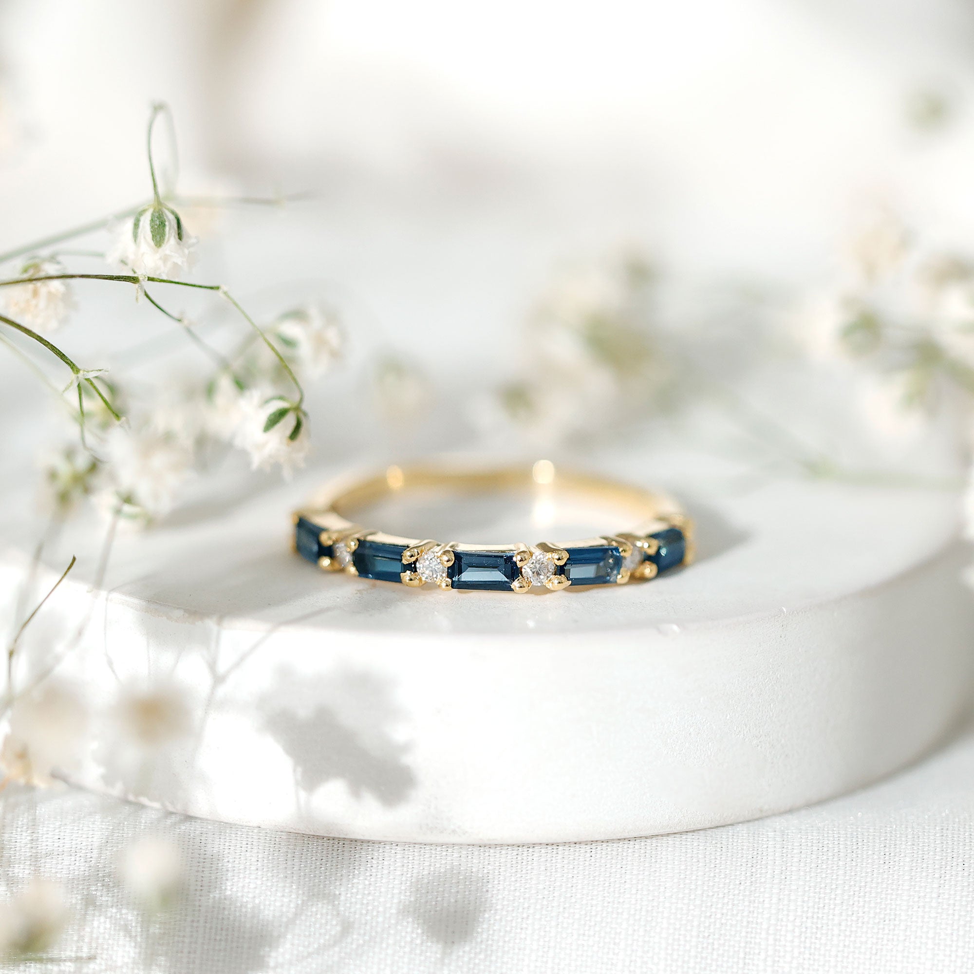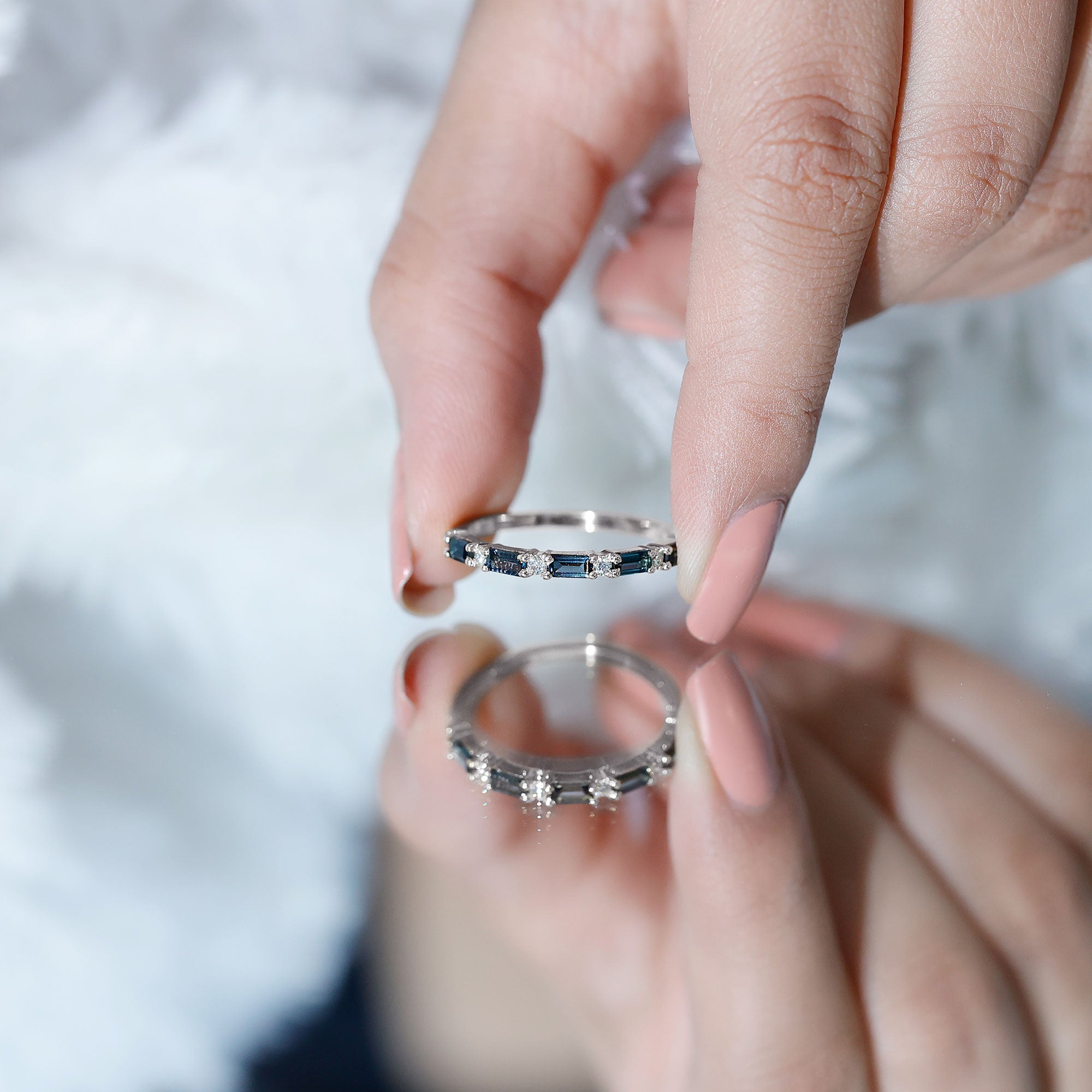 Sleek and petite, this London Blue Topaz Ring allows you to indulge in its mesmerizing allure, which is a stunning combination of sophistication and style. The Baguette Cut Blue Topaz, set in an East West Prong Setting, along with the Diamond set in a continuous band, radiates elegance and charm. Capture everyones attention with this exquisite Half Eternity Ring, a true reflection of enduring style, ideal for those who appreciate sophistication and wish to leave a lasting impression. This December Birthstone Ring can be worn alone for a minimalist appearance or combined with other rings for a more striking look. It guarantees the AAA Quality of London Blue Topaz and Hi-Si Diamond, ensuring that the gemstones are certified. Embrace timeless elegance and captivating beauty with this Half Eternity Ring. Whether it enhances an engagement ring or serves as a wedding band, this Baguette Cut Eternity Band signifies a new journey filled with love and dedication. Its meaning is profoundly significant when presented as a gift during important moments such as proposals or milestone anniversaries. Offered in a variety of ring sizes, this Stacking Ring guarantees a perfect fit for every hand eager to display everlasting love. Packaged in a signature jewelry box, it is a gift that is sure to leave a lasting impression. Whether for a wedding, anniversary, or any special event, this Topaz Stackable Band conveys love with a brilliance that cannot be overlooked. It combines classic style with a modern twist, making it ideal for those who appreciate their sparkle with a hint of uniqueness.