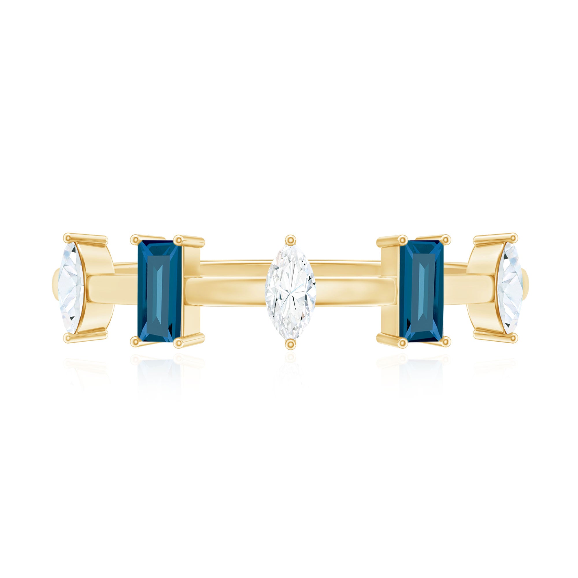 Enhance your appearance with the enchanting allure of this sophisticated Half Eternity Band, features an alternating design of Baguette Cut London Blue Topaz and Marquise Cut Diamonds, resulting in a subtle yet mesmerizing charm. Each London Blue Topaz gemstone boasts AAA quality, recognized for its royal blue hue that imparts a striking yet sophisticated element to the band. This Blue Topaz Wedding Band is crafted to be stackable, allowing for easy pairing with other rings or wearing it solo for a subtle yet impactful statement. Whether you choose it as a wedding band, an anniversary ring, or simply as a unique addition to your collection, its timeless design is appropriate for any occasion. Its captivating blue shade renders it a versatile accessory that enhances numerous outfits and jewelry combinations. This Stackable Eternity Band is ideal for individuals seeking a ring that harmonizes traditional style with contemporary design, while also embodying a personal touch through its potent gemstone. Meticulously crafted with a focus on detail, this Minimal Eternity Band symbolizes enduring elegance and strength. It serves as a meaningful gift for anniversaries, weddings, or any occasion you wish to commemorate with something genuinely special.