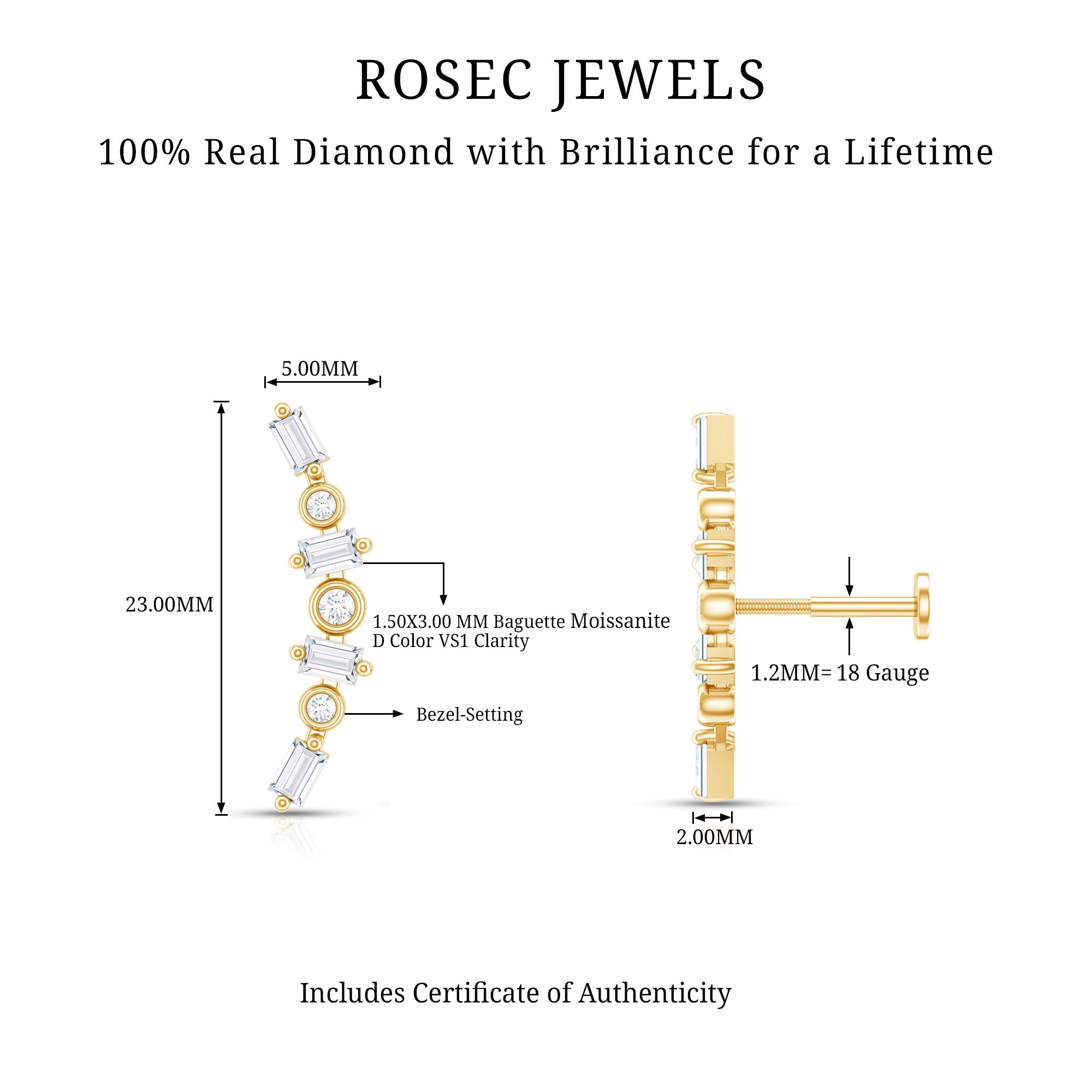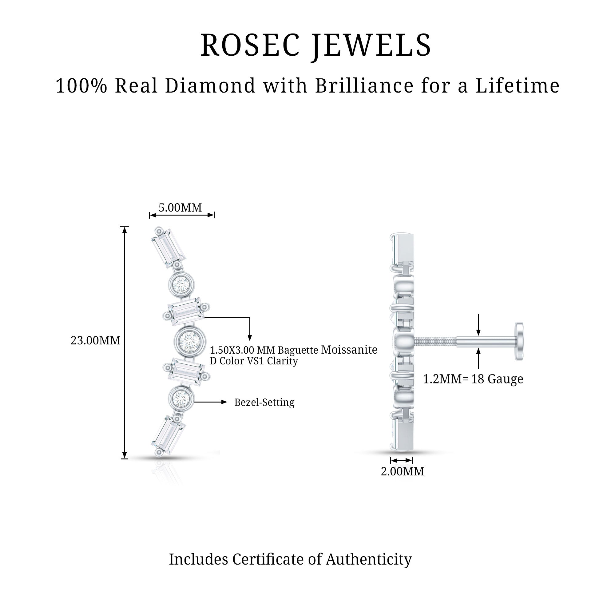 The Curved Climber Earring is decorated with Round and Baguette Moissanite set alternately in Prong and Bezel Setting. Wear these Crawler Earrings on your Helix, Cartilage, or Upper Lobe Piercing. It will make you stand out from the crowd at any event or occasion. Every moissanite is meticulously chosen for its D color and VS1 clarity, resulting in a brilliant shine that elevates your natural grace. The smooth flat back design ensures added comfort, particularly for extended wear, while keeping the earring securely in place. This Moissanite Ear Climber beautifully combines contemporary style with timeless elegance. Its versatile design makes it ideal for both formal and casual outfits, effortlessly enhancing any look. Crafted with attention to detail, it promises durability while offering a lightweight feel for all-day comfort. This Curved Helix Earring is a stylish choice for trendsetters eager to express their uniqueness through sophisticated details. Elegantly packaged in our signature jewelry box, this Curved Earring is a breathtaking addition to any jewelry collection.