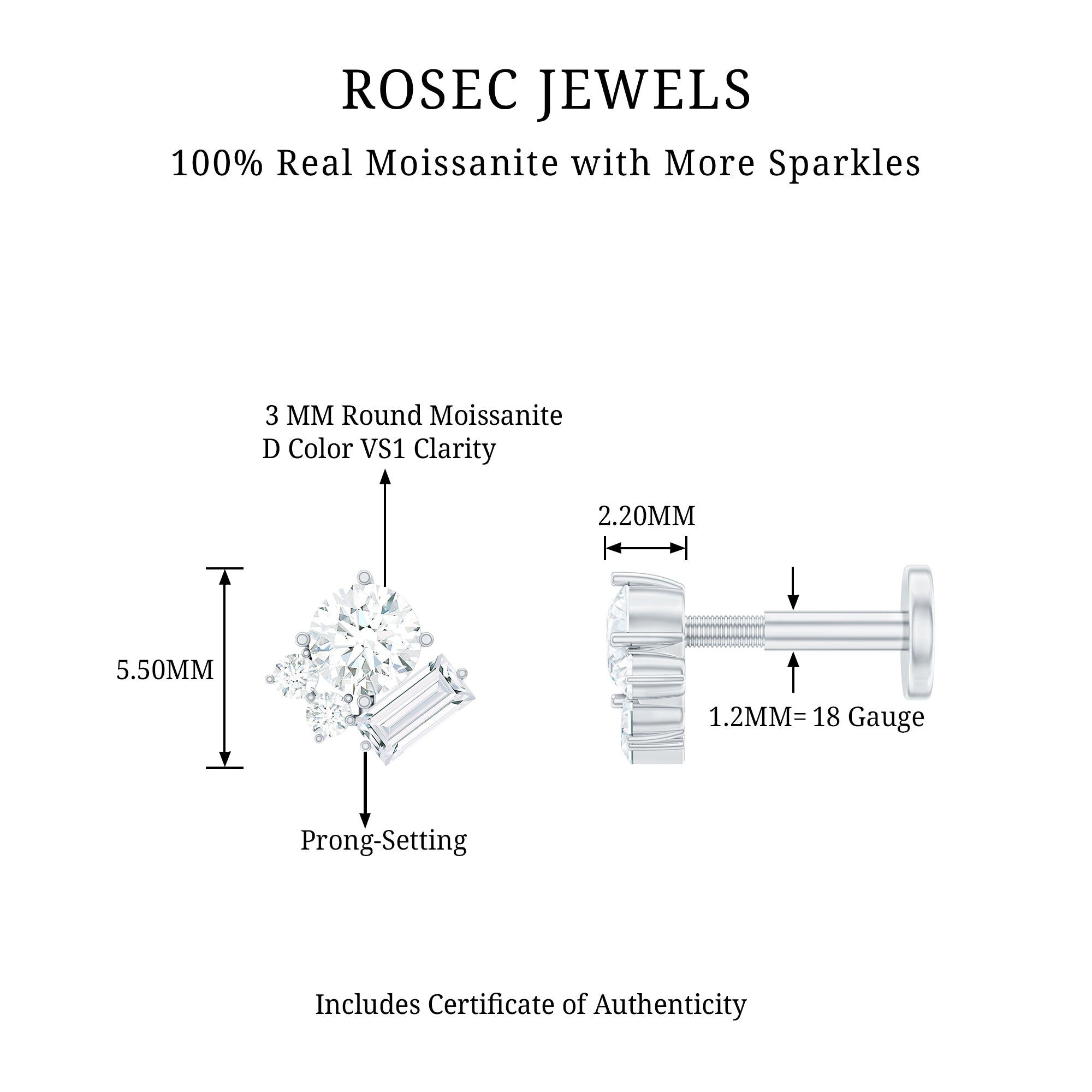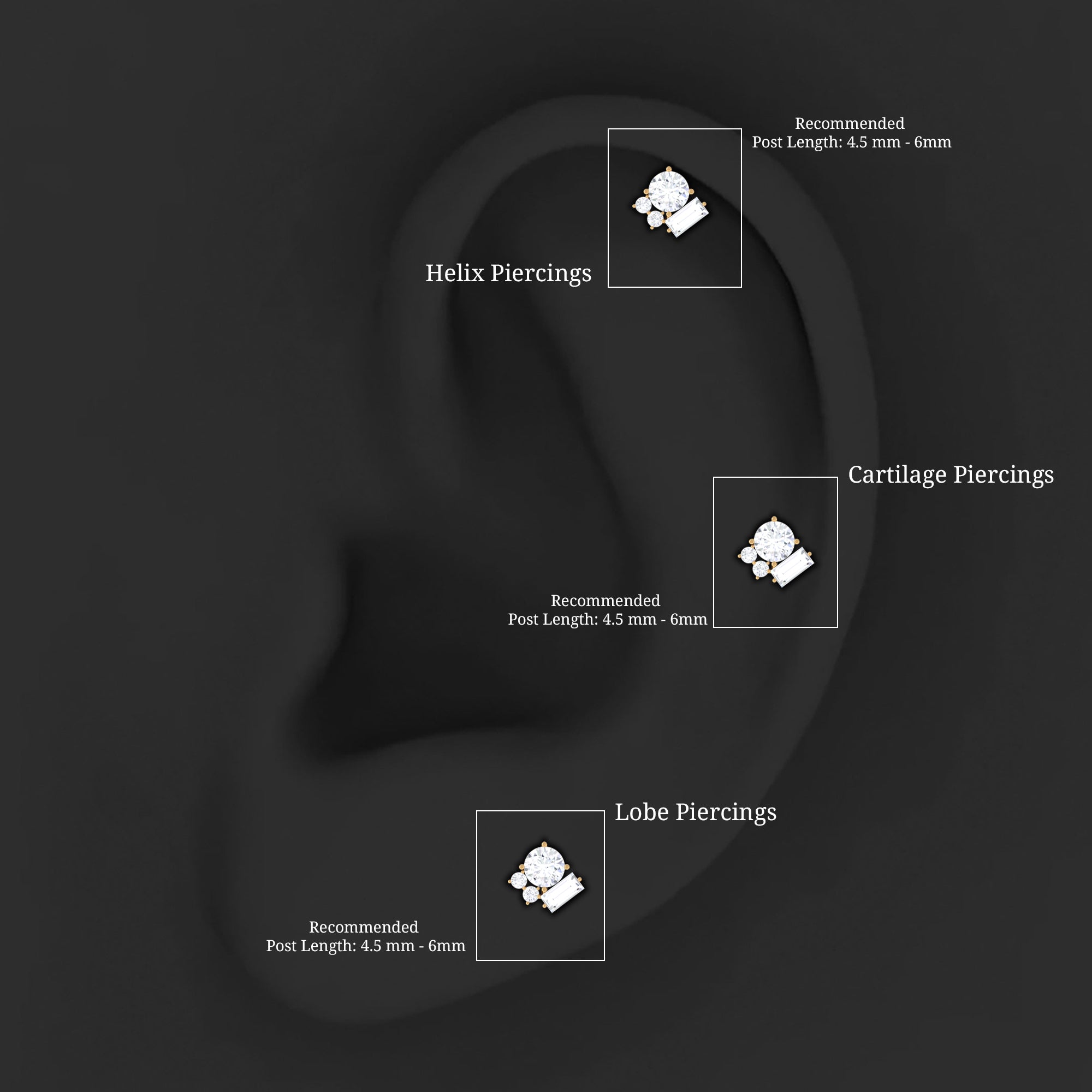 Grab this alluring Moissanite Cluster Tragus Earring embellished with Baguette and Round Cut Moissanite Cluster secured in Prong Setting. You can style this Moissanite Earring on your Helix, Cartilage, Tragus, Conch, or Upper Lobe Piercing. Simple yet elegant, this Piercing Earring is a perfect gift for your loved one.