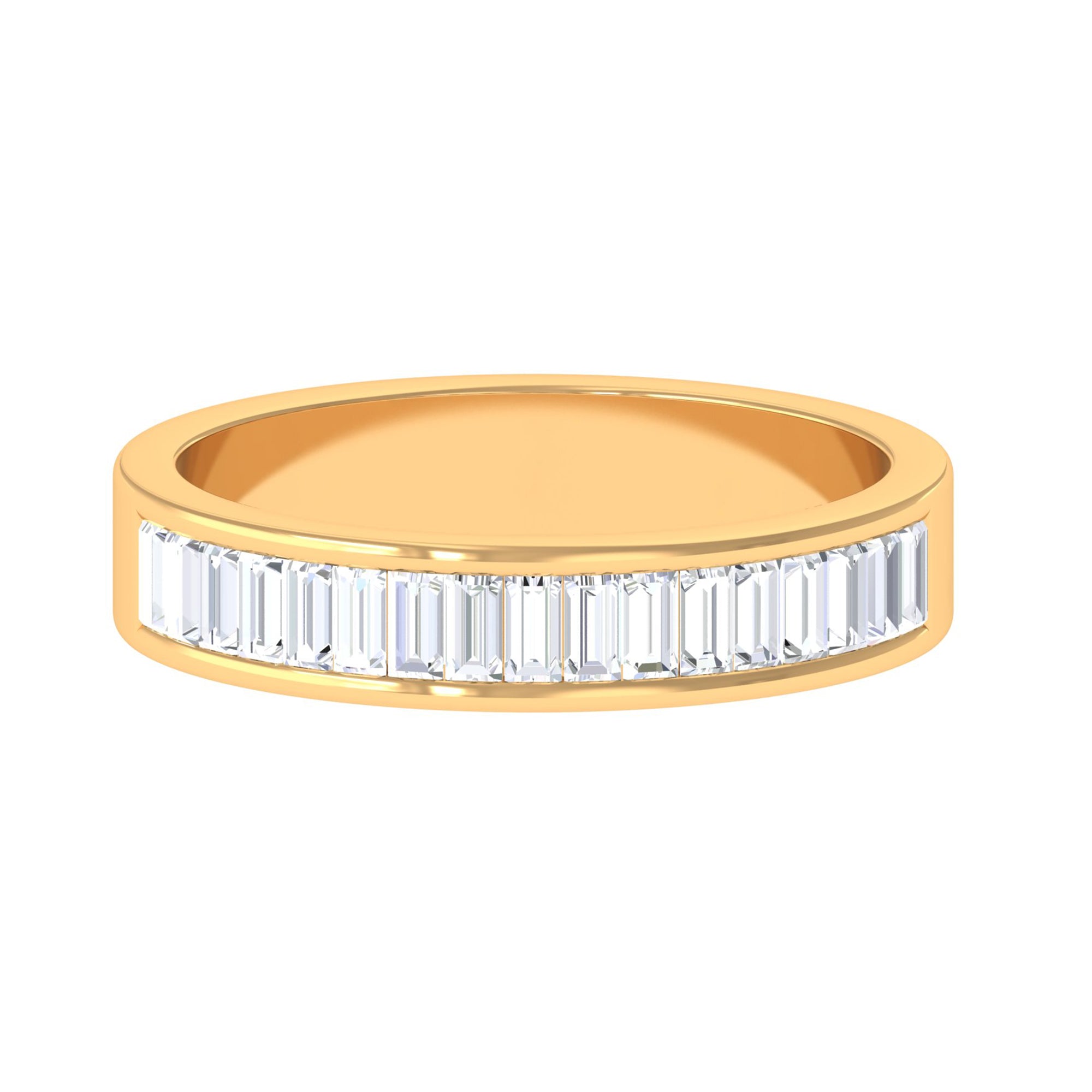 Shine like a star and let your finger in a mesmerizing display of brilliance with this diamond half eternity band ring. This band ring features baguette shape small sparkling diamond center stones, making this piece unique and versatile. The channel setting ensures the safety and durability of the stones. This is the perfect ring for making endless memories.