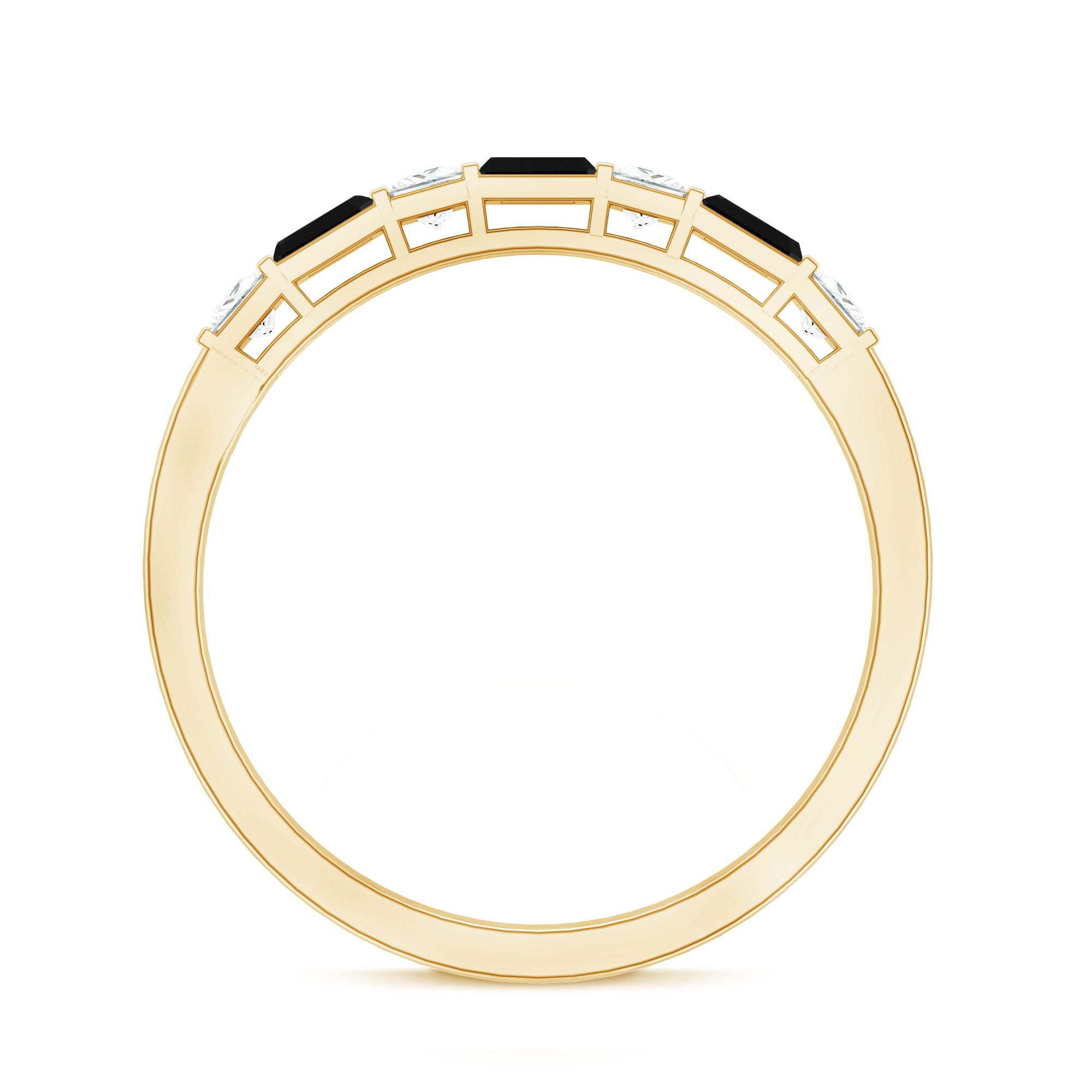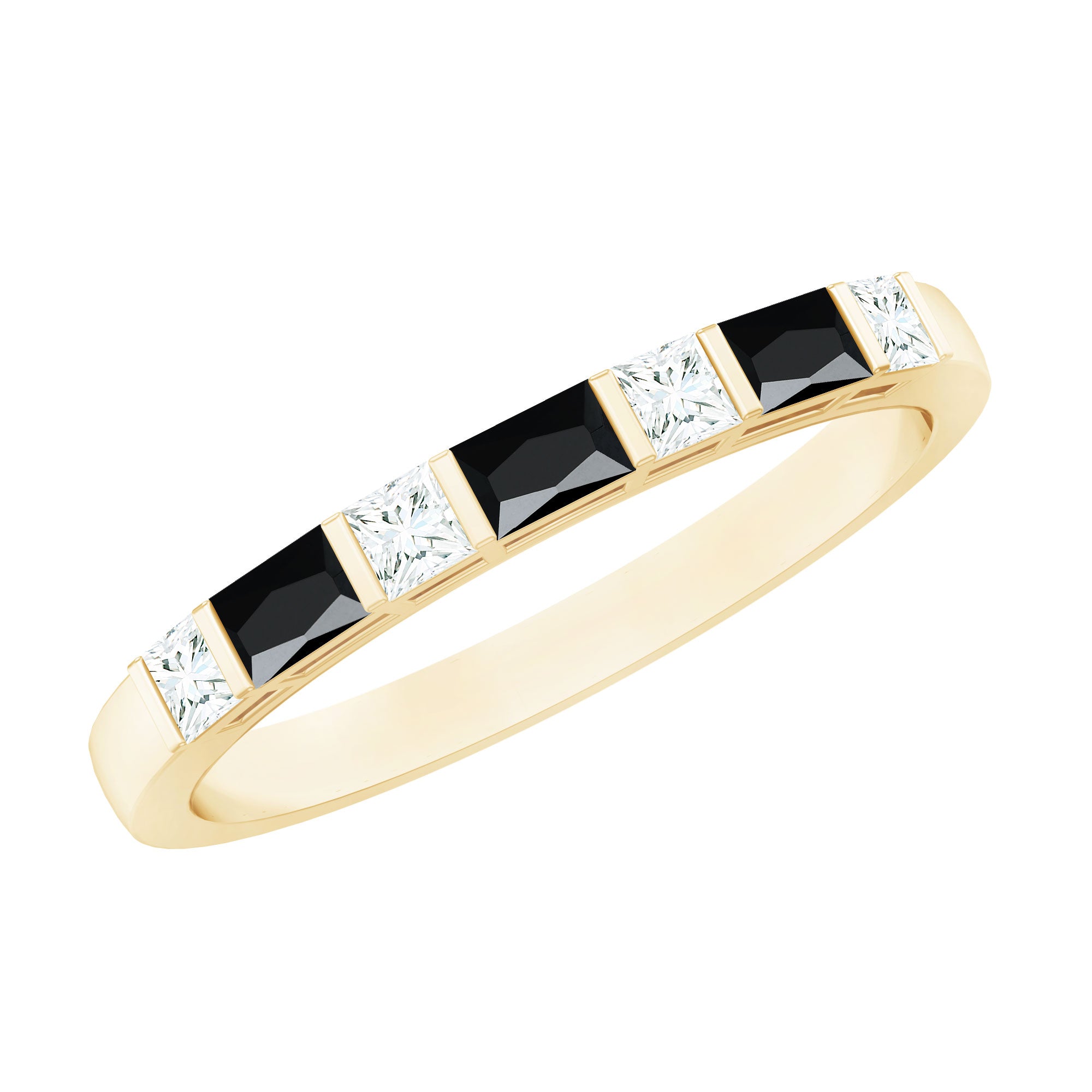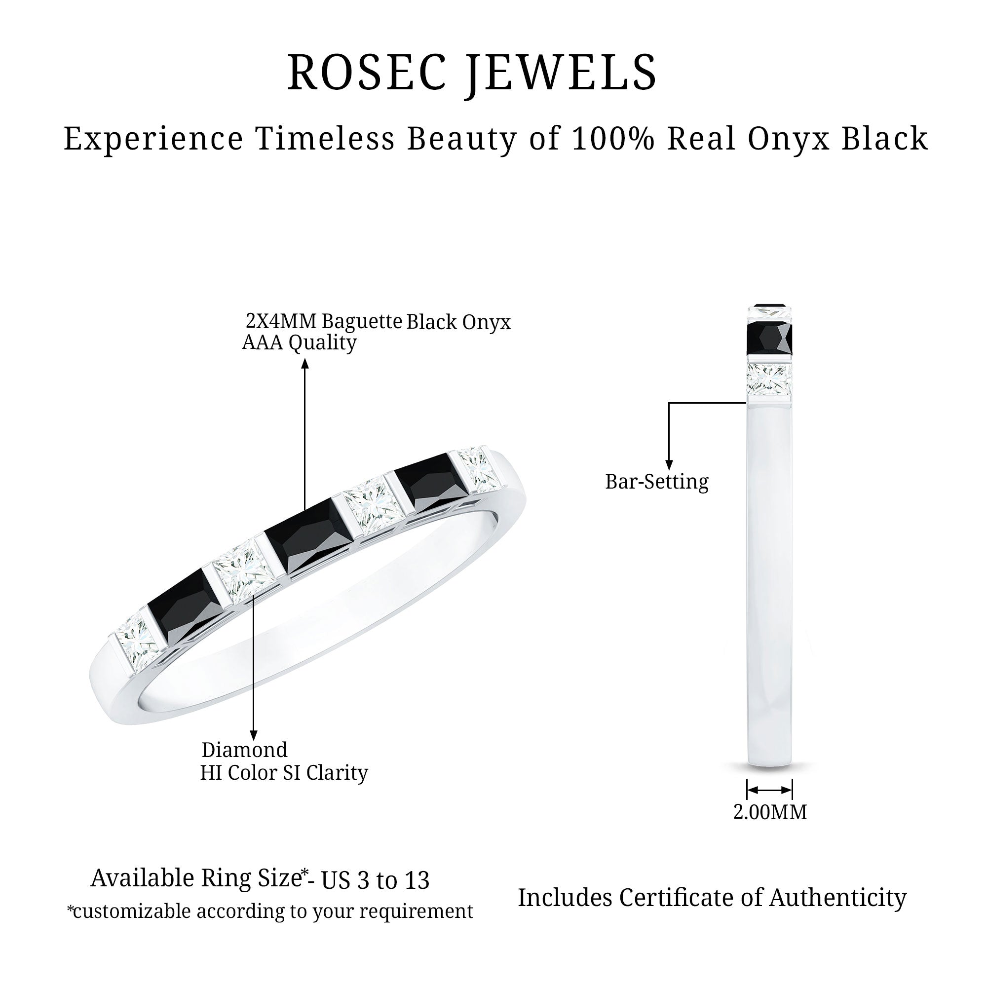 Give her something that speaks of style and sentiment. Designed for moments that matter, or simply to show you care, this Black Onyx Eternity Ring brings a refined touch to any jewelry collection. The design features baguette cut black onyx stones and princess cut real diamonds, creating a beautiful contrast of dark and light. The alternating pattern adds visual interest and a modern feel, while the secure bar setting keeps each stone in place for lasting wear. Perfect for stacking or wearing alone, the half eternity layout offers a graceful look that is both eye-catching and timeless. Whether she prefers a minimalist style or loves to mix and match, this Half Eternity Wedding Band adapts easily to her personal taste. Crafted with attention to detail using AAA quality black onyx and HI-SI quality diamonds, it is made to last and feel comfortable throughout the day. Available in US sizes 3 to 13, finding the right fit is simple. This Onyx and Diamond Wedding Band arrives in an elegant jewelry box, making it a thoughtful gift that is ready to give for birthdays, anniversaries, or just because.