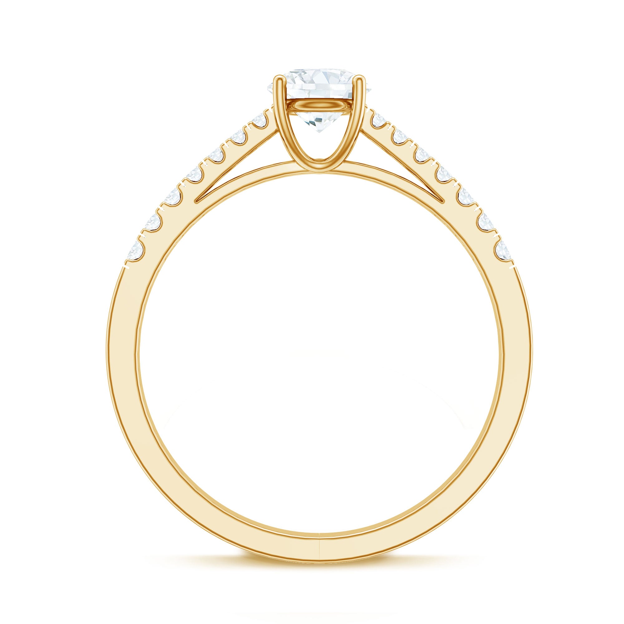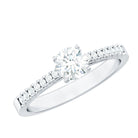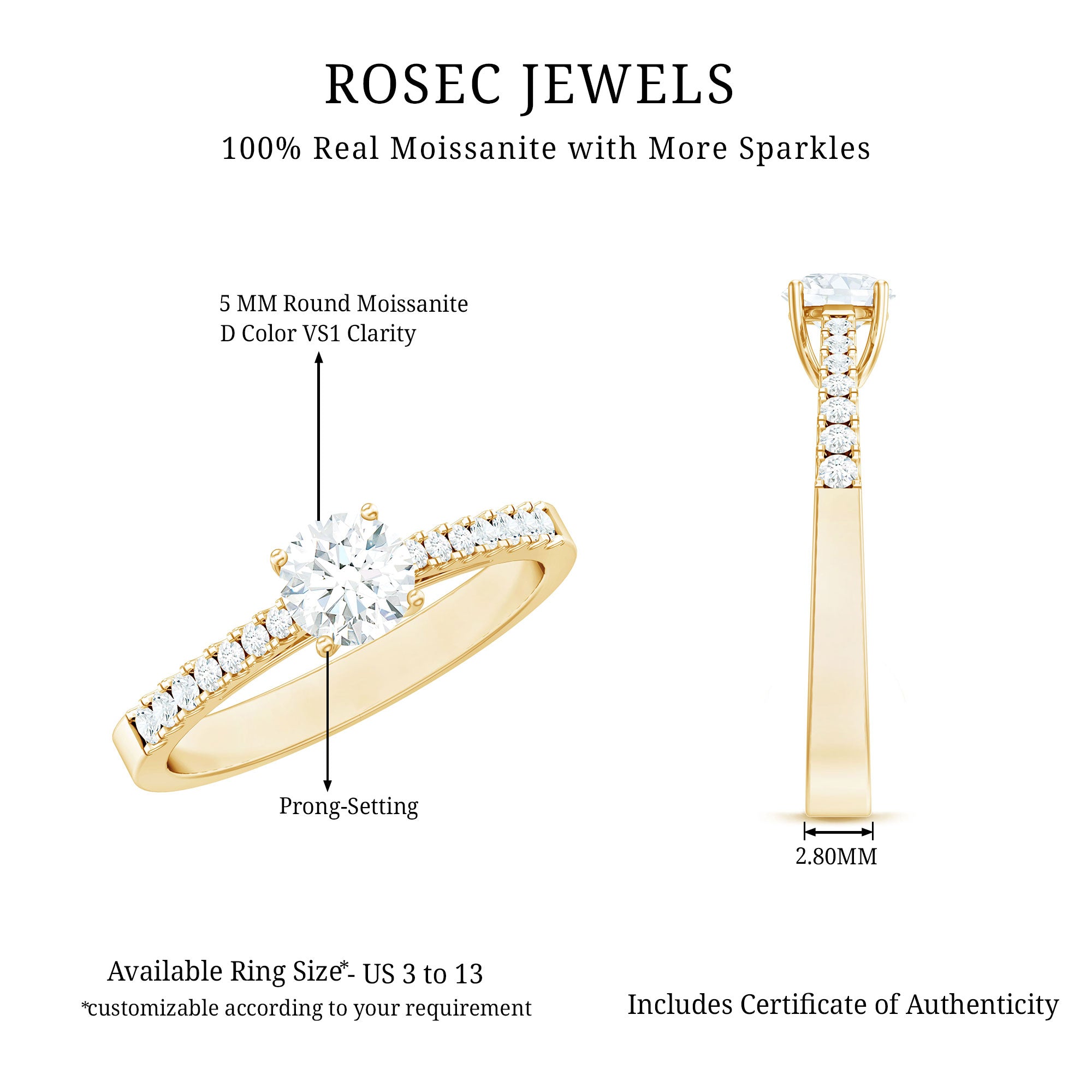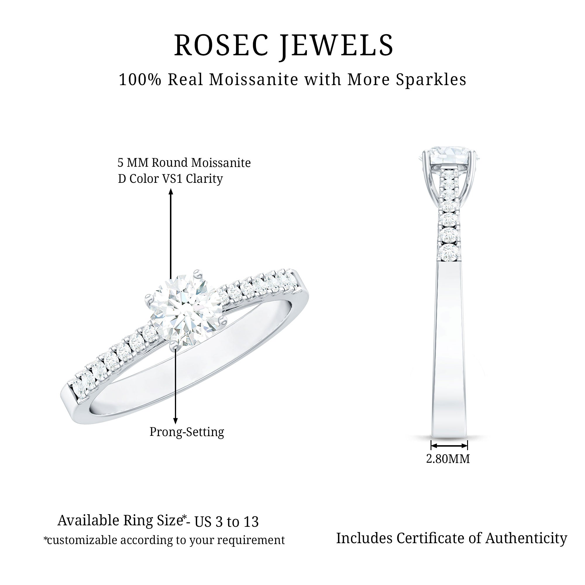 This elegant Moissanite Engagement Ring is designed to shine with timeless beauty and soft sparkle. At the center, a 5 MM round moissanite sits securely in basket setting. The basket setting gently lifts the stone, allowing more light to enter from every angle and making the center stone sparkle even more. On both sides of the center stone, small round moissanites are arranged in a graduated style. This smooth transition draws your eyes toward the main stone and gives the Side Stone Engagement Ring a balanced and graceful look. All the moissanite stones in this Round Engagement Ring are of D color and VS1 clarity, known for their brilliant shine. Whether worn alone as an engagement ring or as a promise ring, this design is made to fit perfectly into any style. This Half Carat Moissanite Ring is perfect for someone who loves classic style with a little modern twist. With its thoughtful details and classic look, it is a piece that can be cherished for years to come.