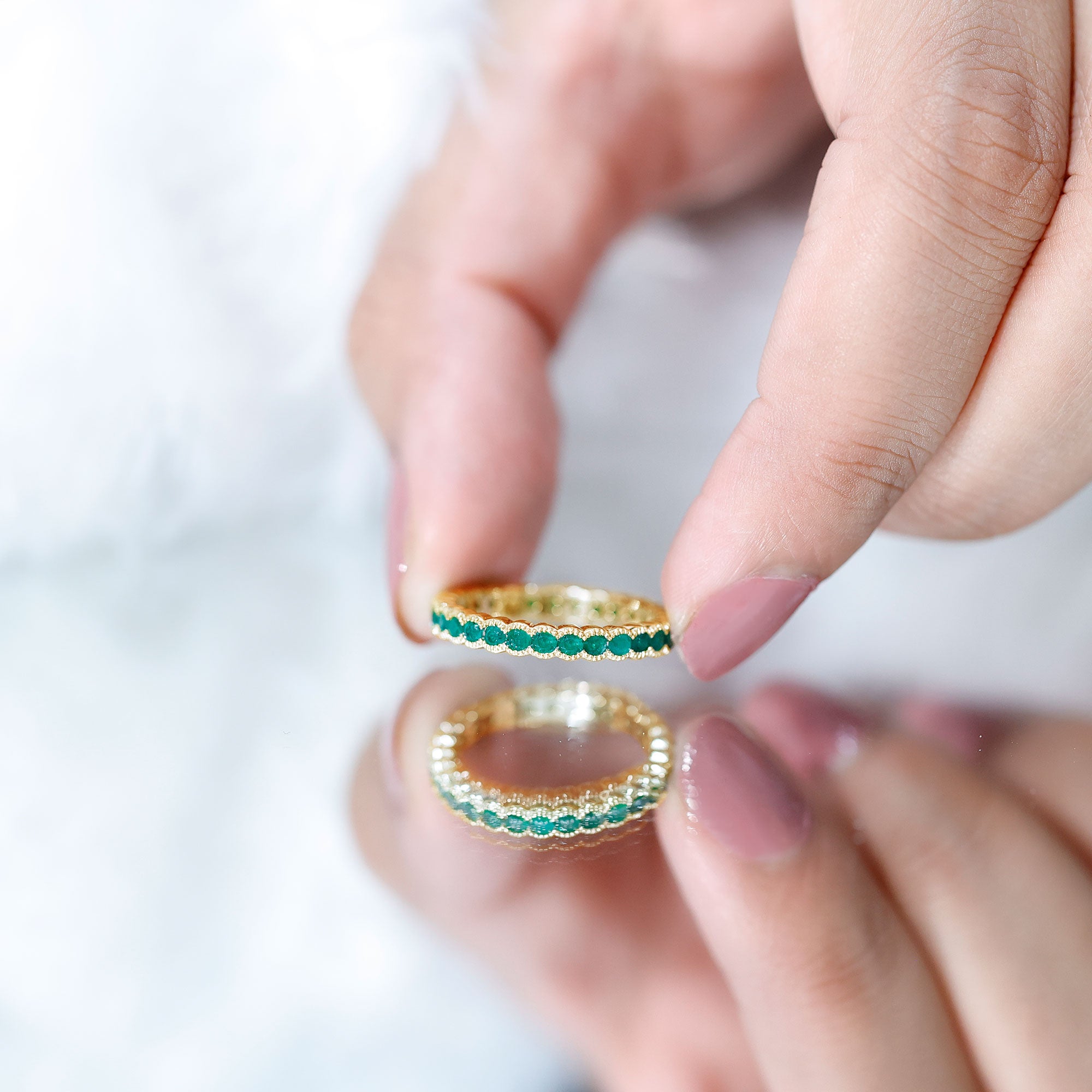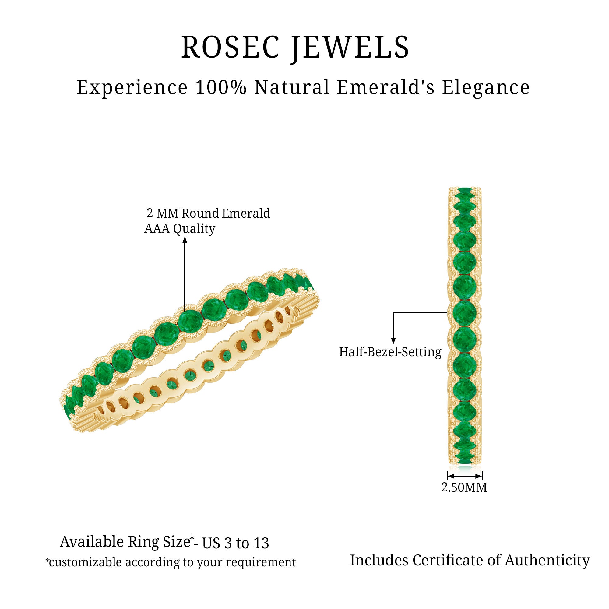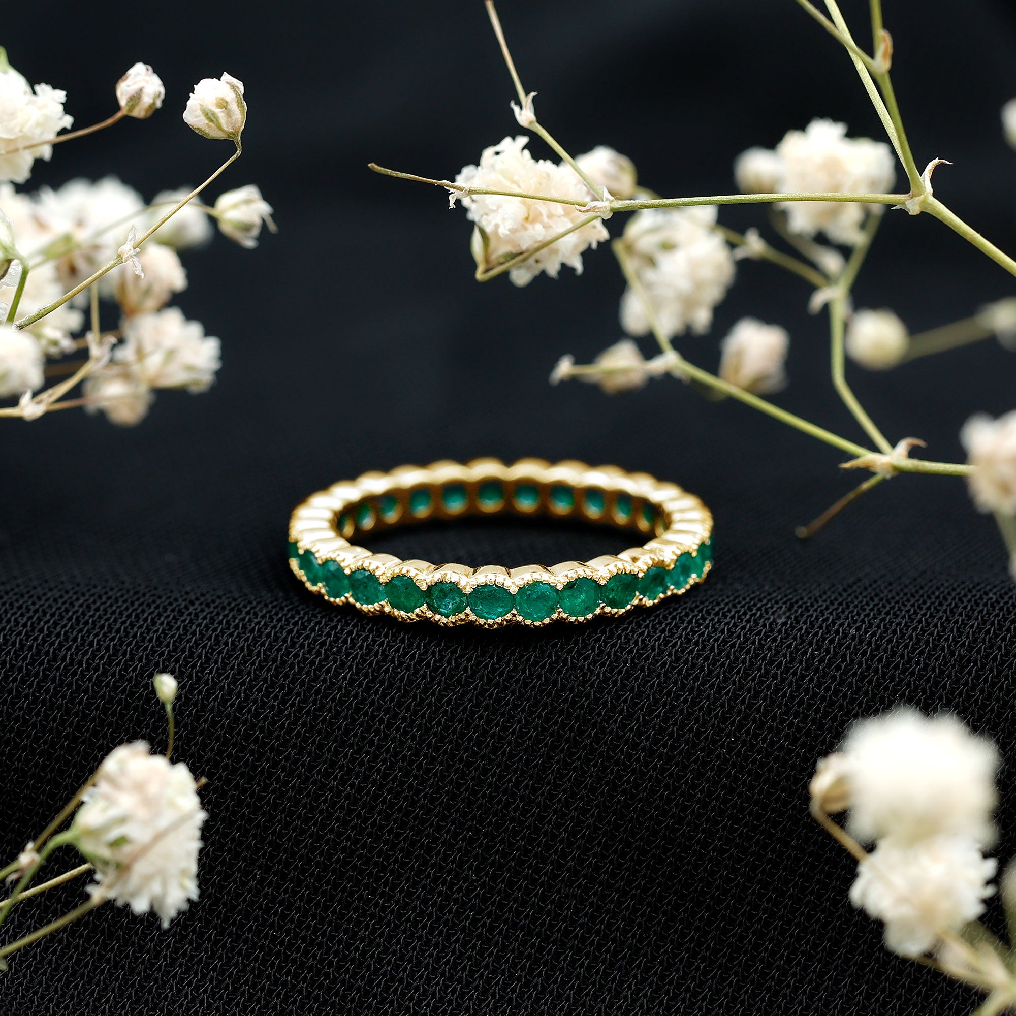 A circle of endless sparkle and beauty, this Emerald Eternity Ring is made for every woman who loves to shine with style and grace. Designed to capture hearts, this Full Eternity Ring is a true symbol of love that never ends. The stunning design features round cut emerald stones set beautifully in half beaded bezel setting, creating a perfect line of glowing green gems that wrap around the band in an unbroken circle of brilliance. Each emerald sparkles with AAA quality and vibrant hue, giving the Stackable Wedding Band a fresh and timeless charm. This Emerald Anniversary Band is a celebration of elegance and emotion. The continuous circle of emeralds represents everlasting love, unity, and strength, making it a meaningful choice for special occasions. Its delicate yet striking design makes it perfect for any moment, from a glamorous evening out to a cozy dinner date. The beaded bezel setting not only enhances the beauty of each emerald but also ensures comfort and durability for daily wear. For all the lovely ladies who never go out of style, this Emerald Stackable Ring adds a dash of color and sparkle to every look.