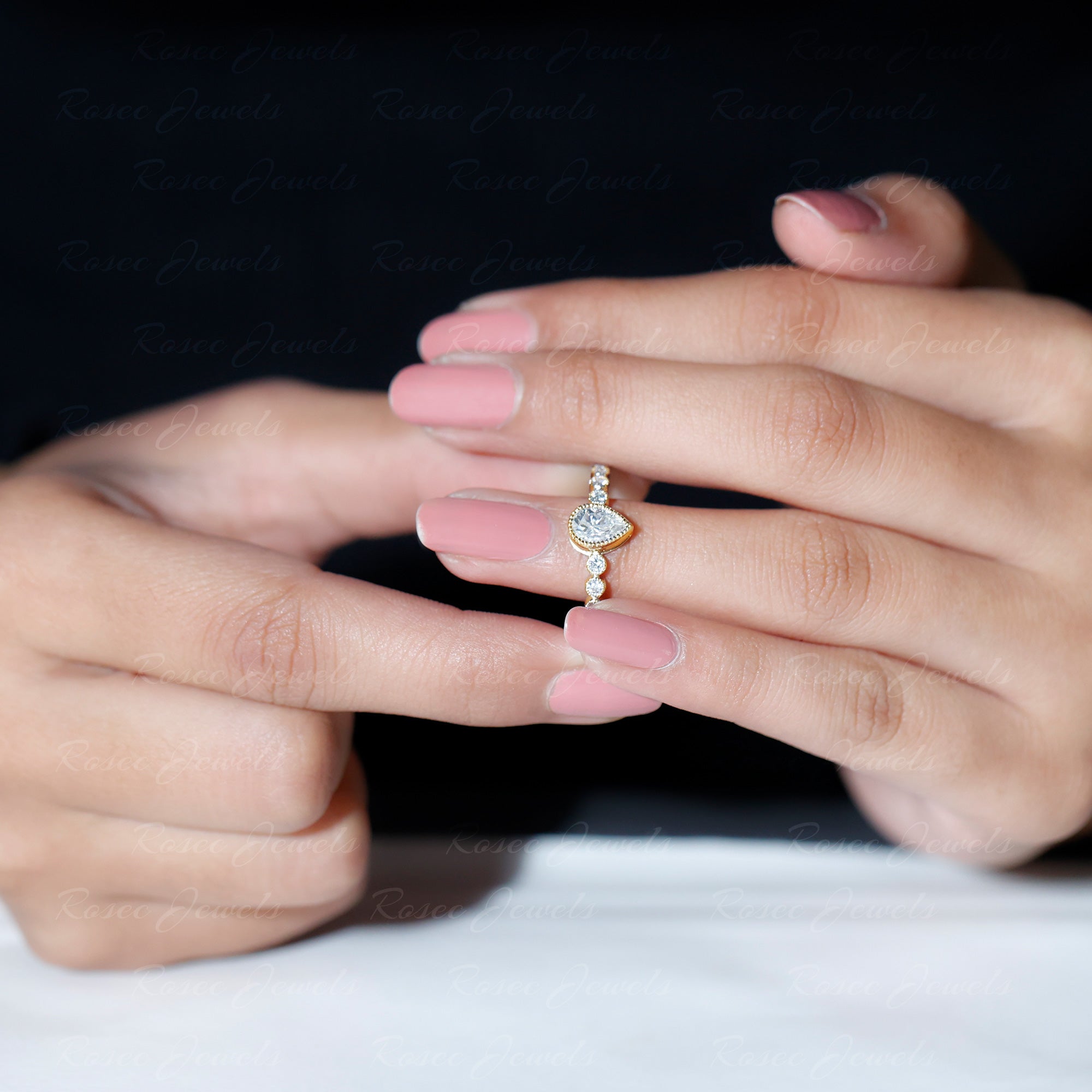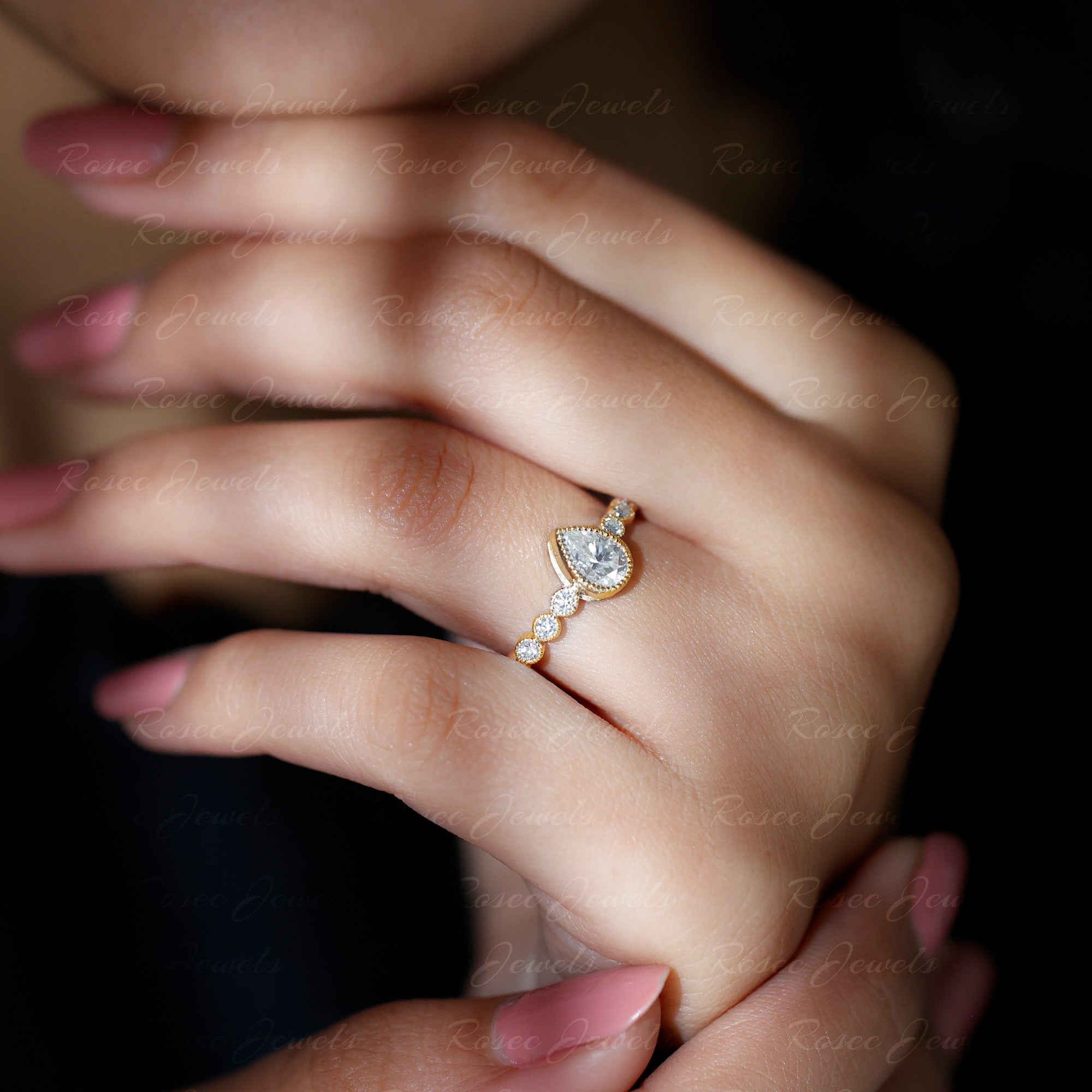 When words fall short, let this Teardrop Engagement Ring express everything your heart wants to say. At the heart of this elegant piece is a stunning 5X7 MM pear shaped moissanite, gracefully set to capture light and attention from every angle. Flanking the center stone are brilliant round cut moissanites, adding a gentle cascade of sparkle that elevates the ring’s brilliance to new heights. Each stone is nestled securely in beaded bezel setting, blending timeless charm with a touch of modern sophistication. The delicate beadwork framing each gem adds a rich, vintage-inspired texture while offering extra protection for everyday wear. This Moissanite Engagement Ring shimmers with just the right amount of luxury, without being too bold or too subtle. This Solitaire Moissanite Ring is a budget-friendly alternative to natural diamonds that doesnt compromise on sparkle or symbolism, making it ideal for the bride-to-be who dreams of something unique yet classic. Whether you are planning a proposal or looking for a heartfelt anniversary gift, this Pear Shaped Engagement Ring is a romantic gesture that will be treasured for years to come.