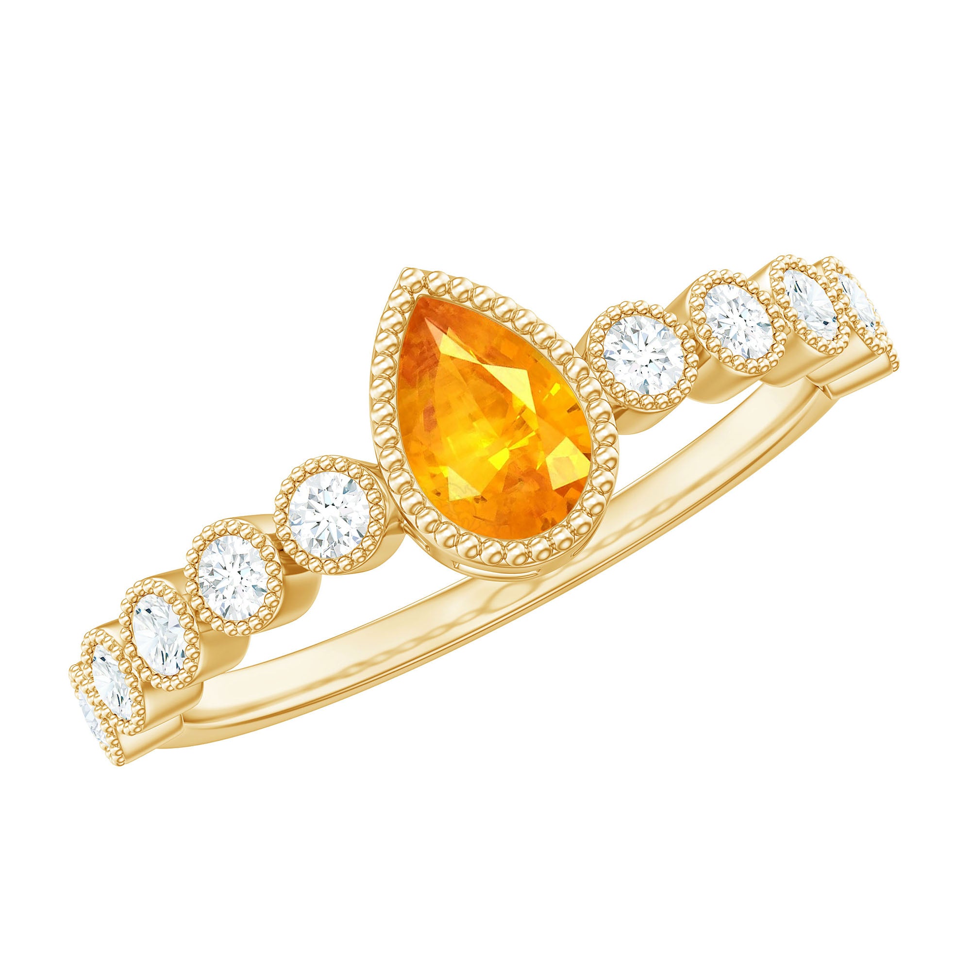 Beaded Bezel Set Pear Cut Orange Sapphire Ring with Diamond