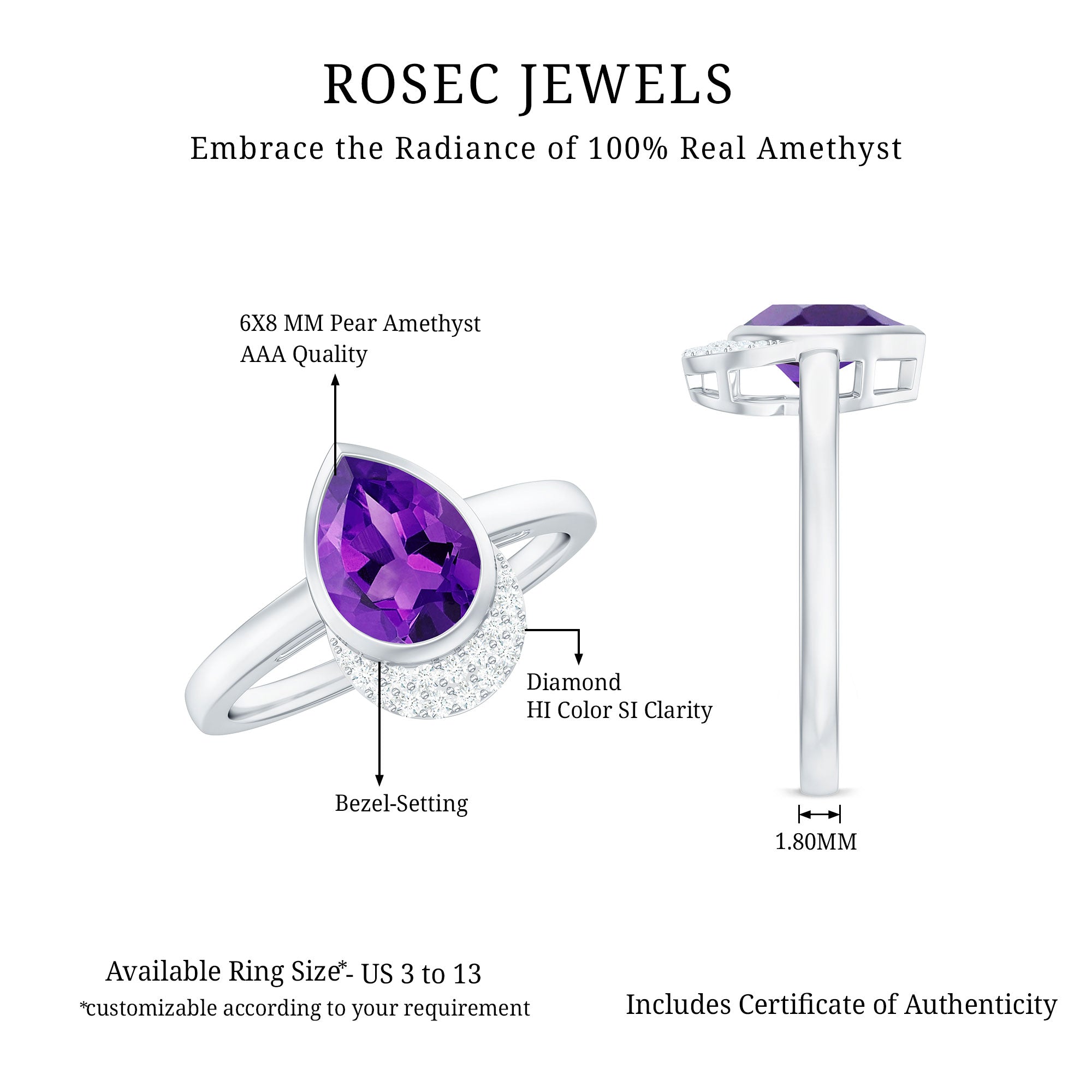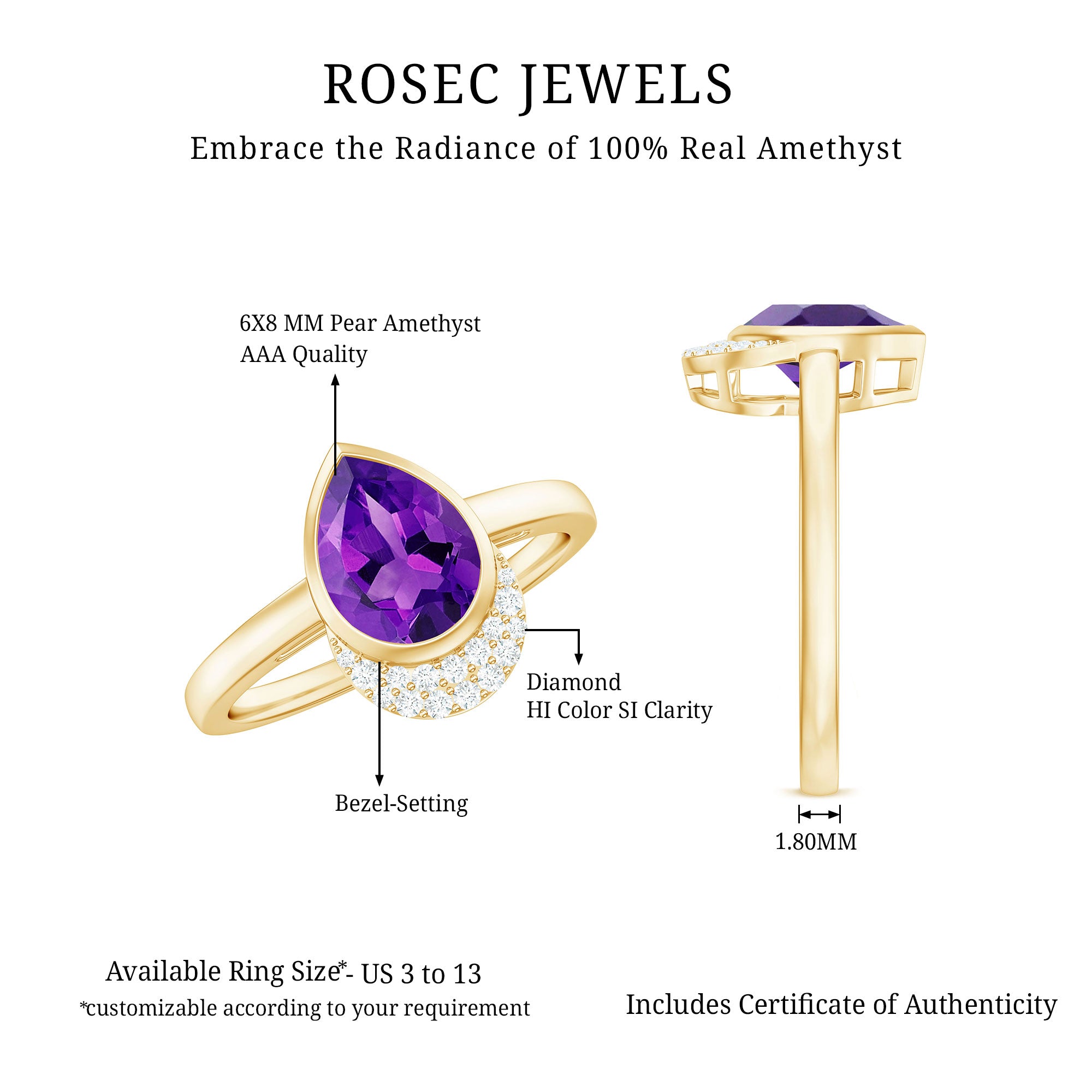 Indulge in the enchanting beauty of the Pear Shaped Amethyst Solitaire Ring. Sparkling Diamond adds a touch of brilliance to its timeless allure.