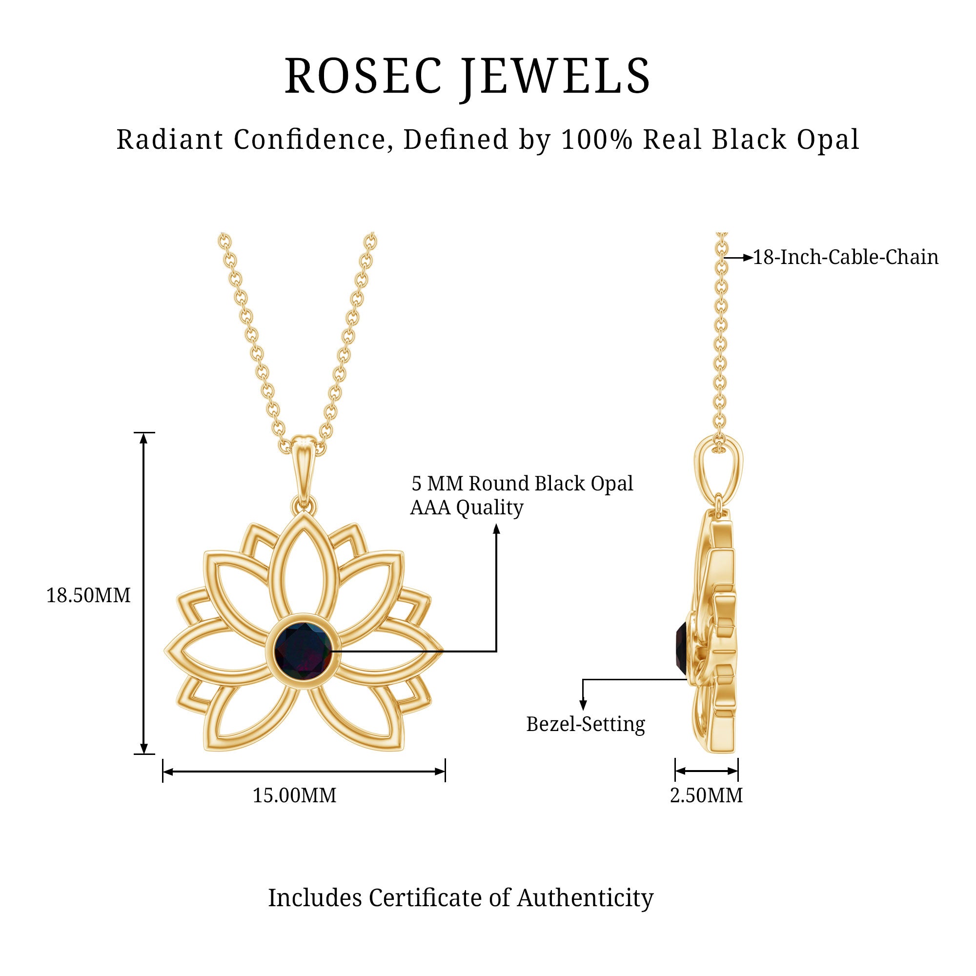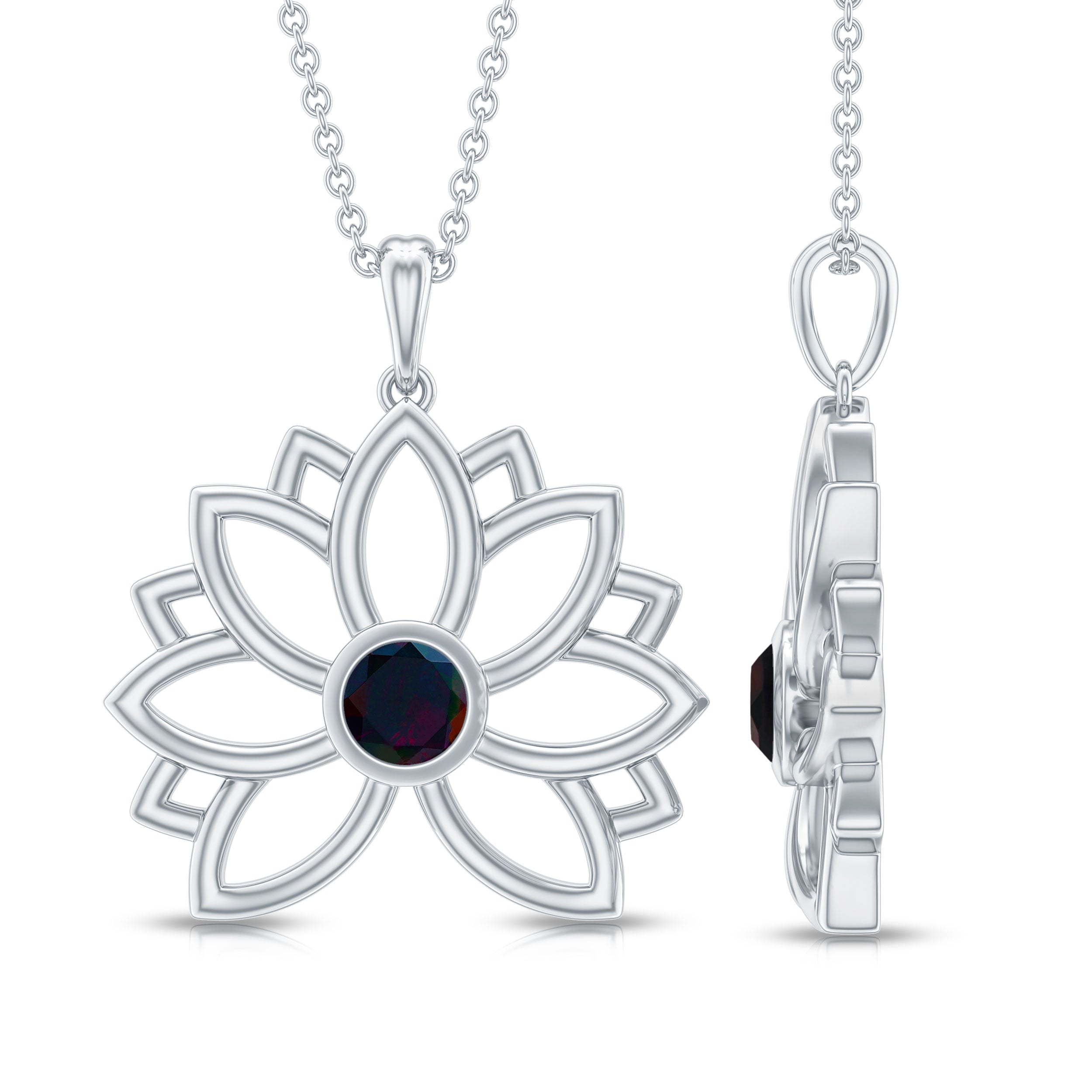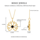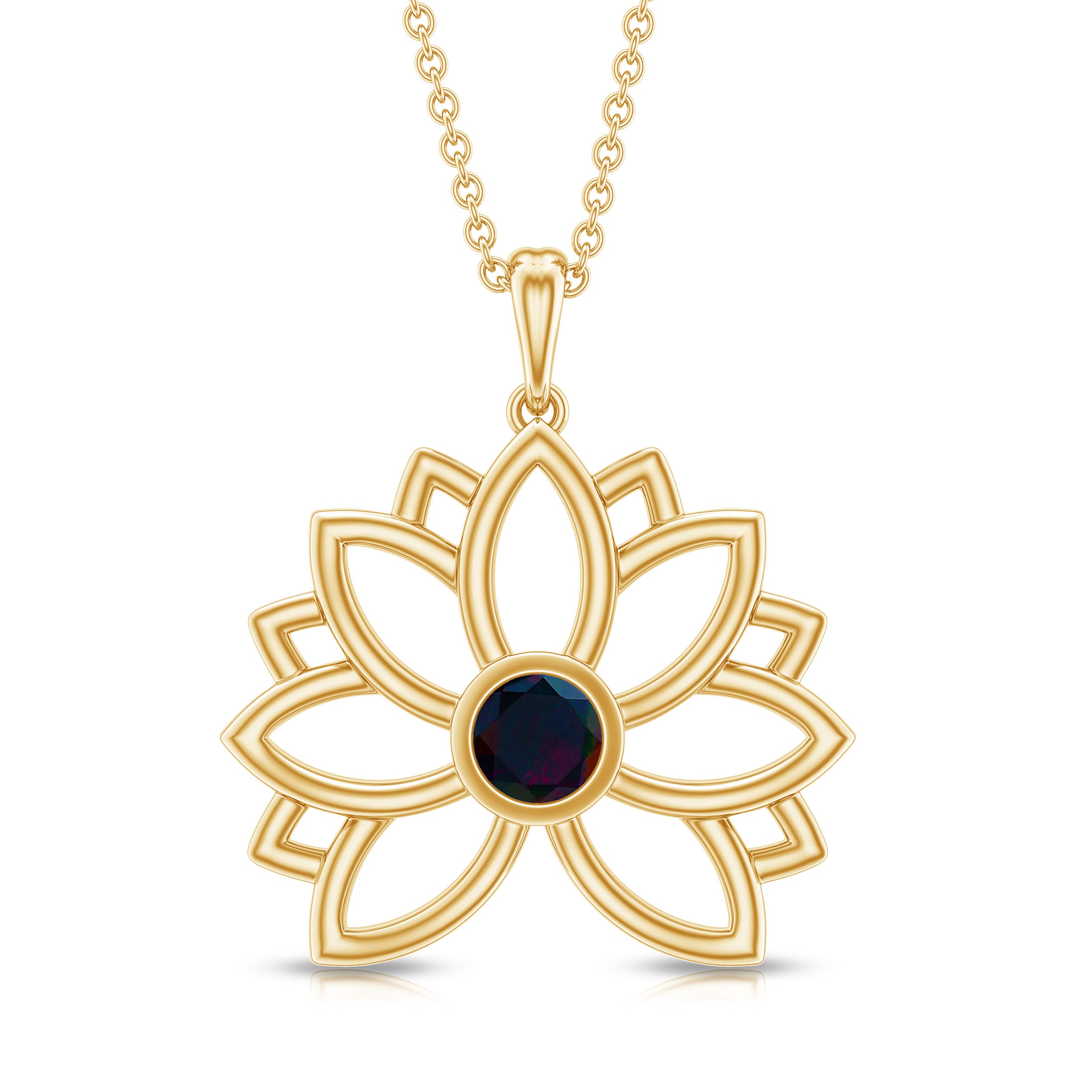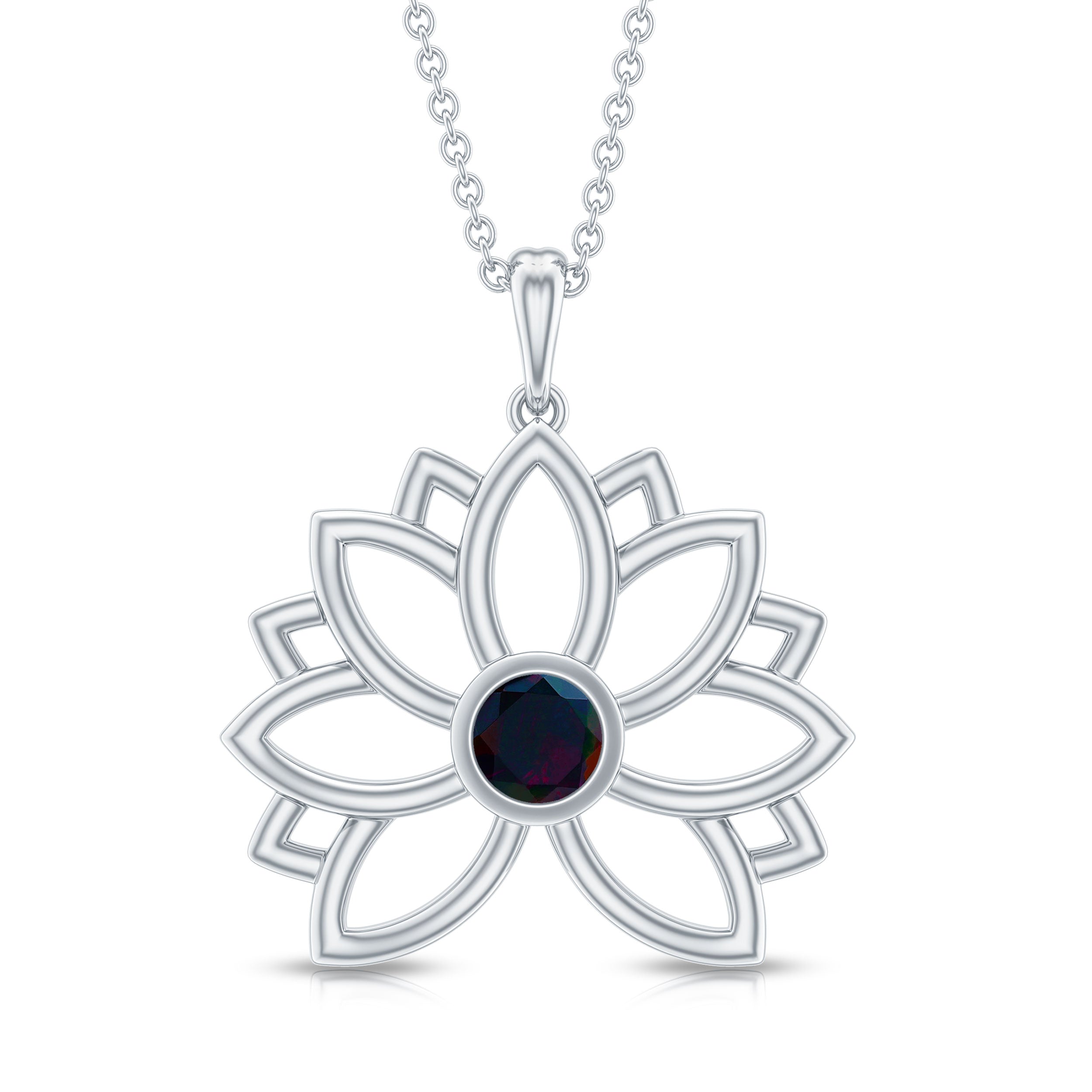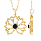 For the vintage enthusiast, the Lotus Floral Pendant is a must-have accessory with its lovely and delicate design. A stunning Round Shape Black Opal Gemstone is nestled in a bezel setting to enhance the beauty of this Floral Necklace, crafted from Solid Gold to create an enchanting piece. Stack it with other necklace or wear it alone to make a statement with this stunning pendant.