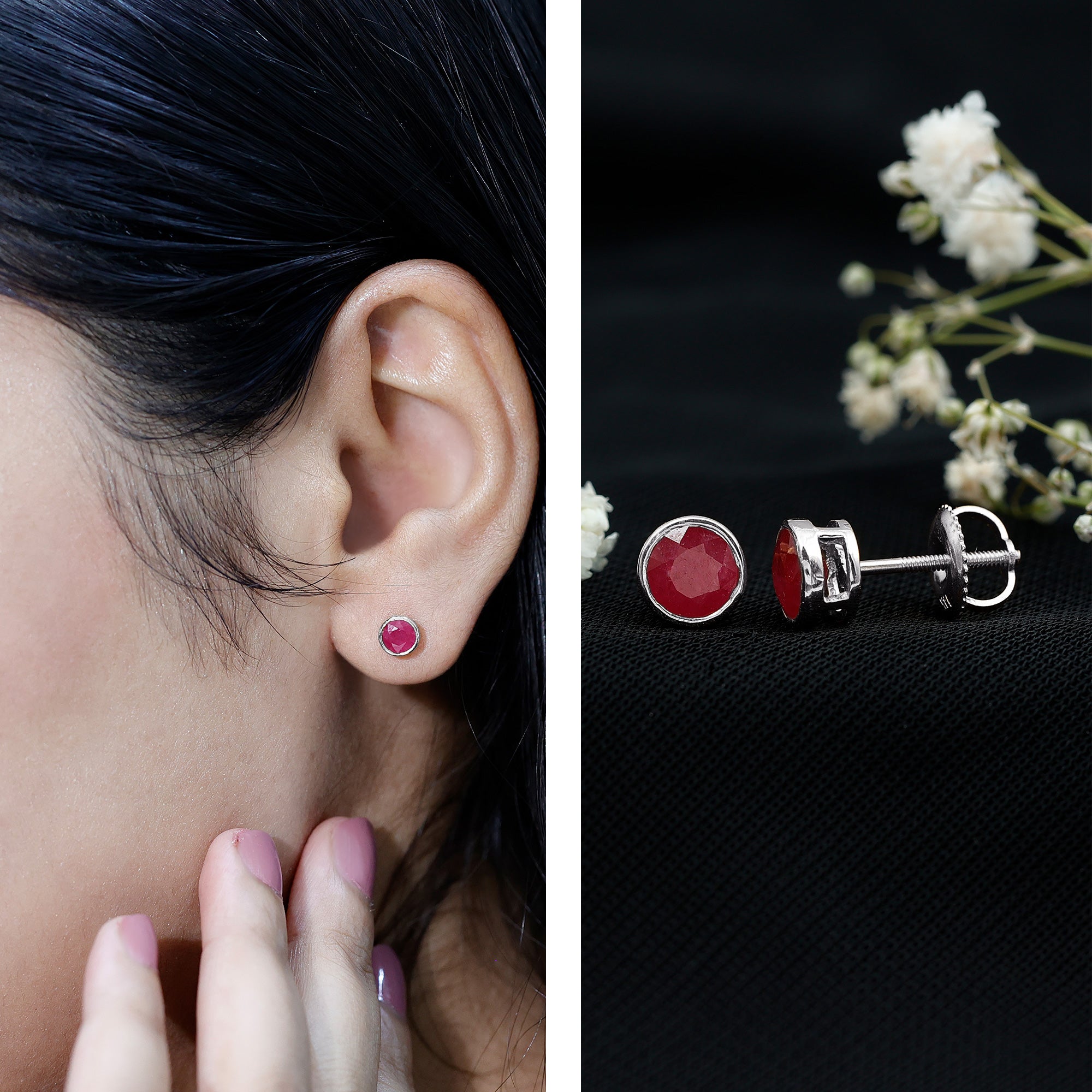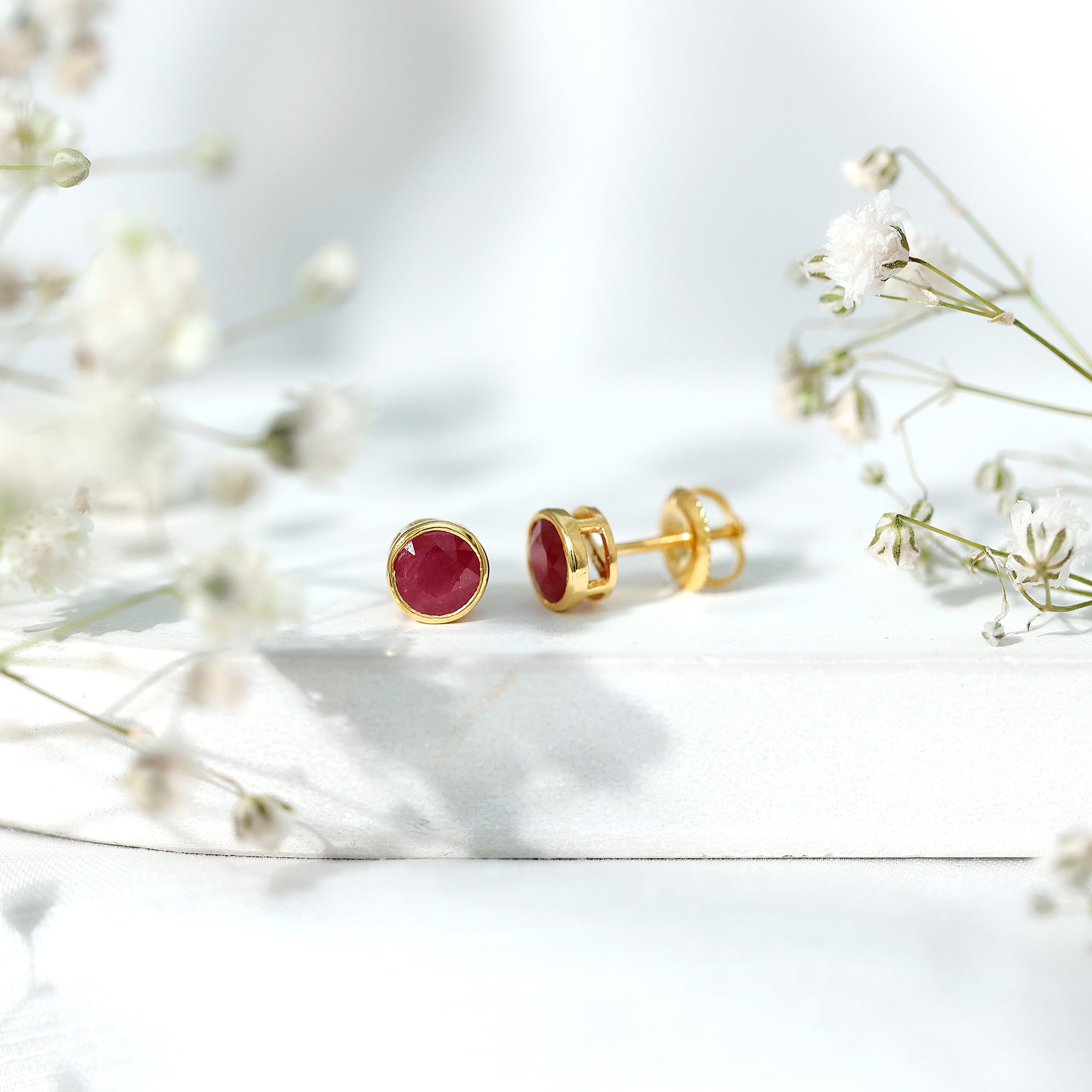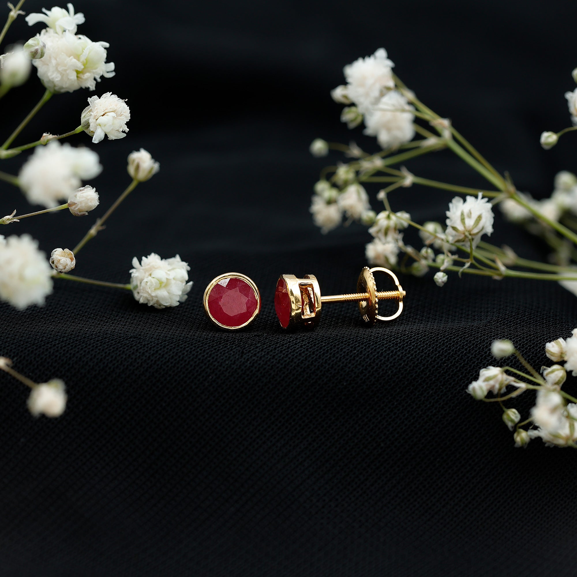Elevate your style with our elegant Ruby Stud Earrings. Featuring Round Shape Ruby gems in a sleek Bezel Setting, these solitaire stud earrings are perfect for everyday wear. These stud earrings are sure to make a statement. Experience the beauty and charm of these exquisite earrings that effortlessly enhance your style with their understated yet captivating design.
