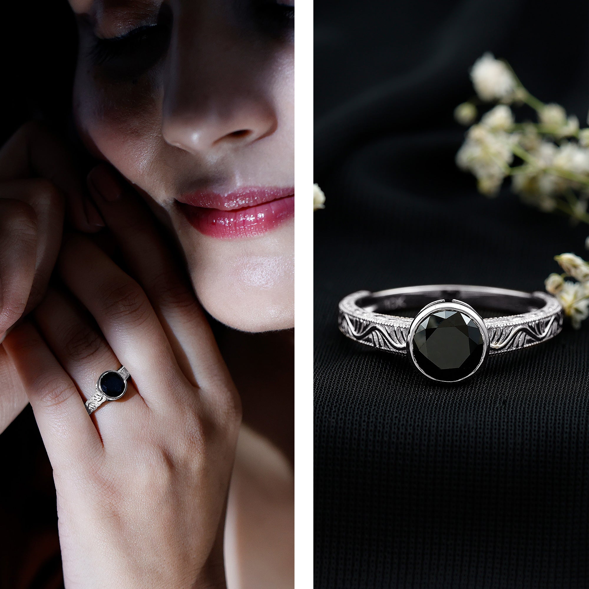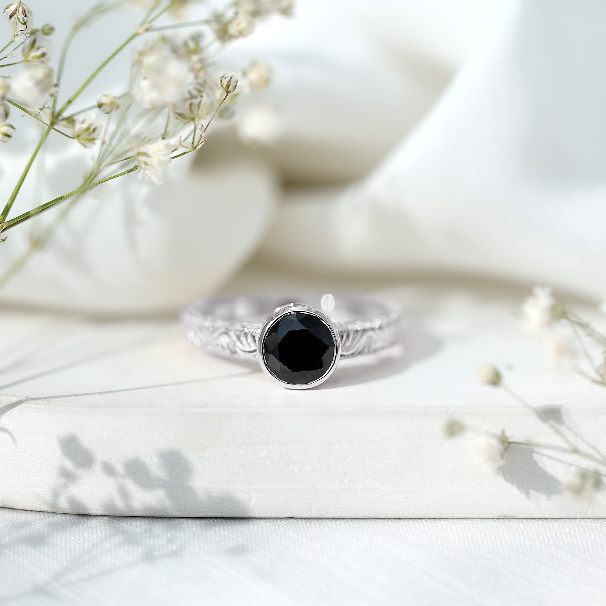 Express your emotions to your beloved with this captivating Solitaire Ring adorned with a Round Shape Lab Created Black Diamond set beautifully as a solitaire in bezel setting. The engraved details add a touch of elegance and sophistication, making it a truly special and meaningful piece. Let this enchanting Black Gemstone Ring be a symbol of your love and devotion, a cherished token that will speak volumes about your feelings for her.