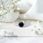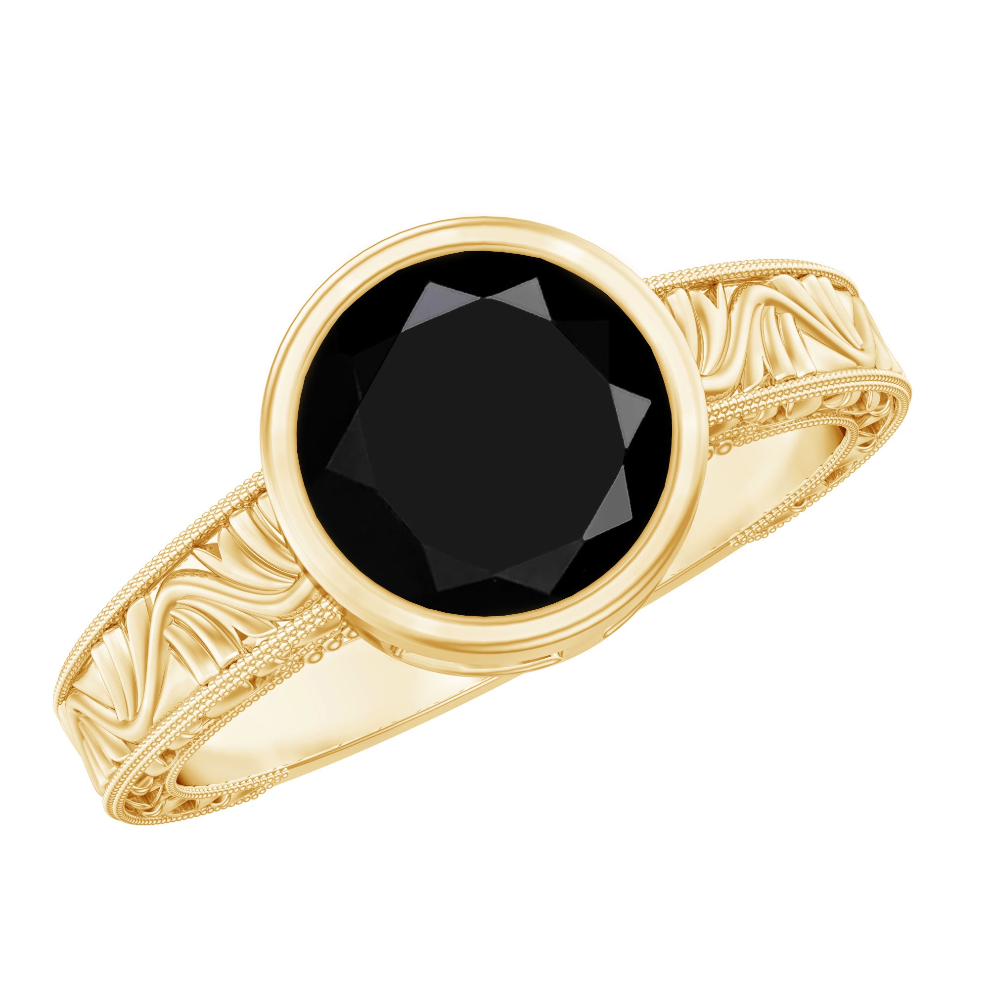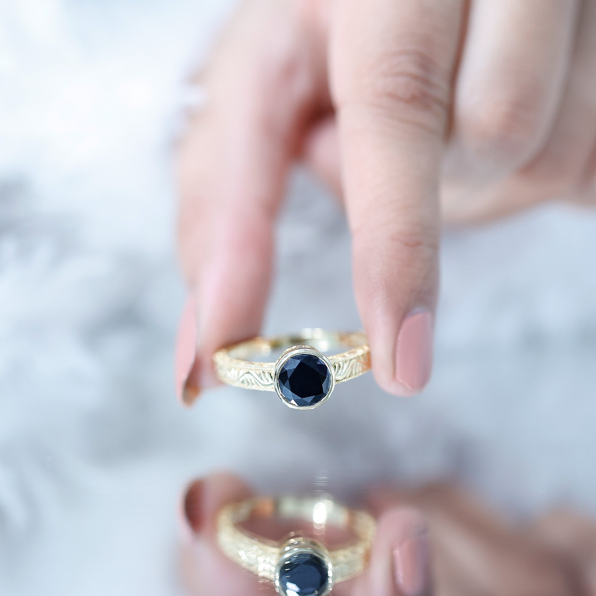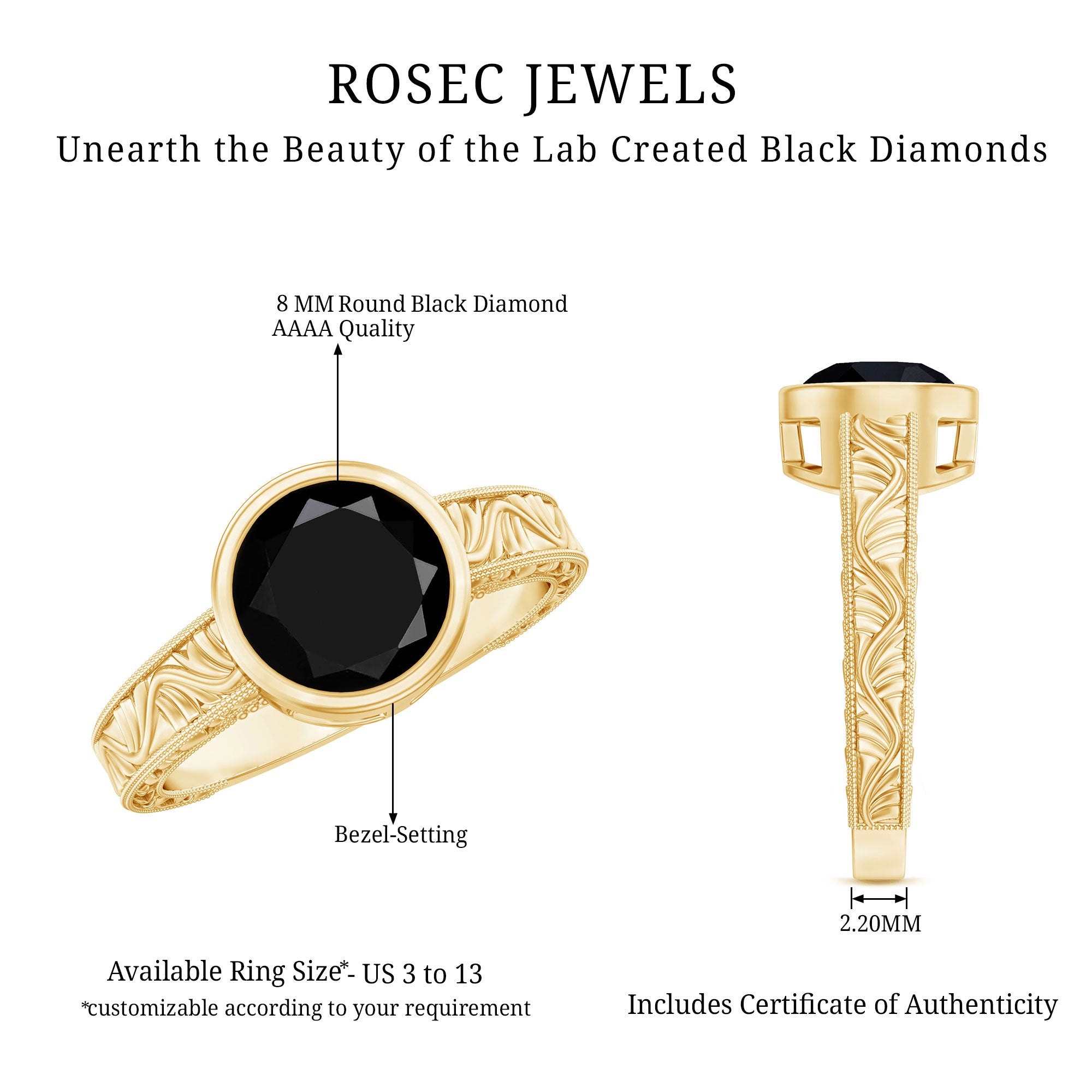 Bezel Set Lab Grown Black Diamond Solitaire Ring with Engraved Detailing