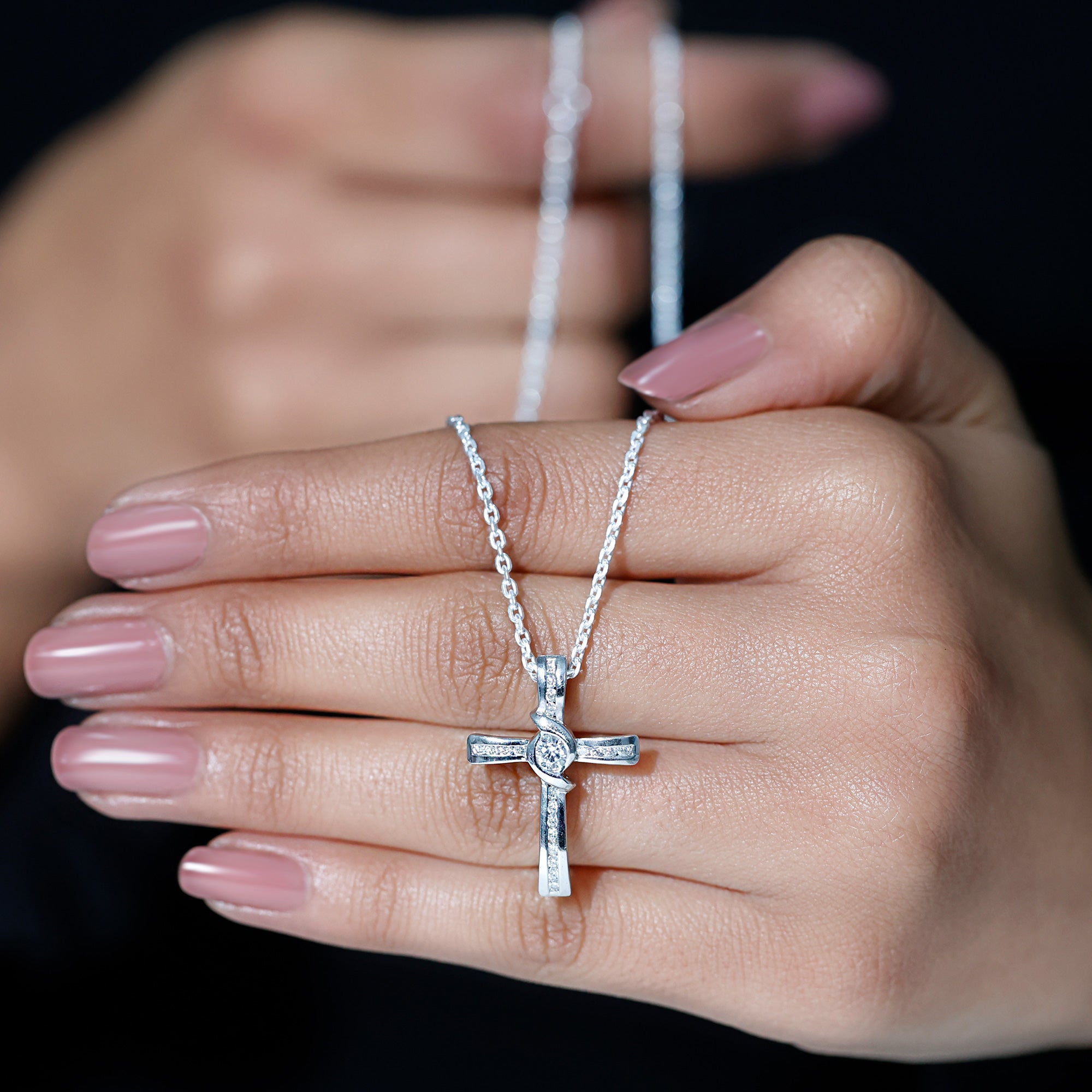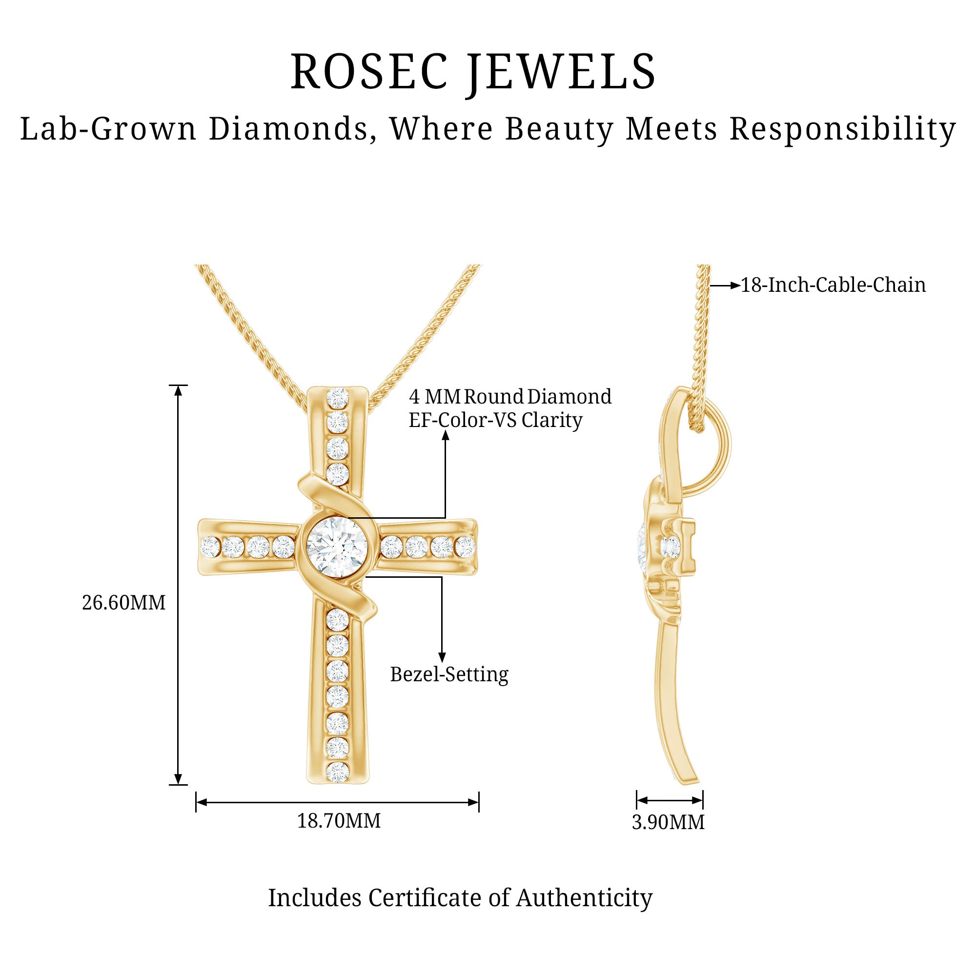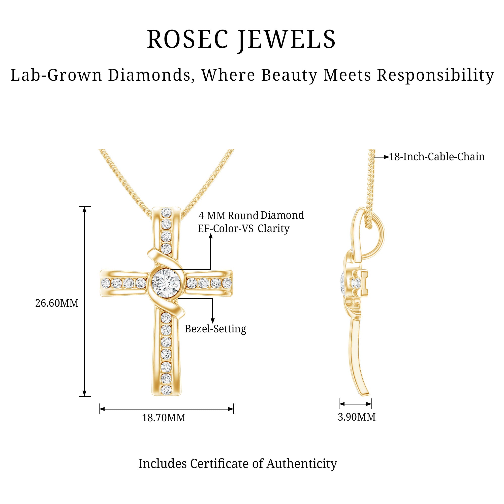 If you are looking for a piece of jewelry that is both meaningful and beautiful then your search ends here, our Diamond Cross Necklace is a great mix of faith and modern style. It features a powerful cross design adorned with horizontal and vertical bars of sparkling round cut diamonds of EF-VS Quality. At the center of the Lab Grown Diamond Pendant Necklace lies an elegant 4 MM round cut bezel set diamond, artistically placed with curved designs. This Cross Pendant Necklace is a ready-to-wear fine necklace. Give your blessings and show your never-ending love to your special one in the form of this Christian Necklace, it expresses every emotion when words are not enough.