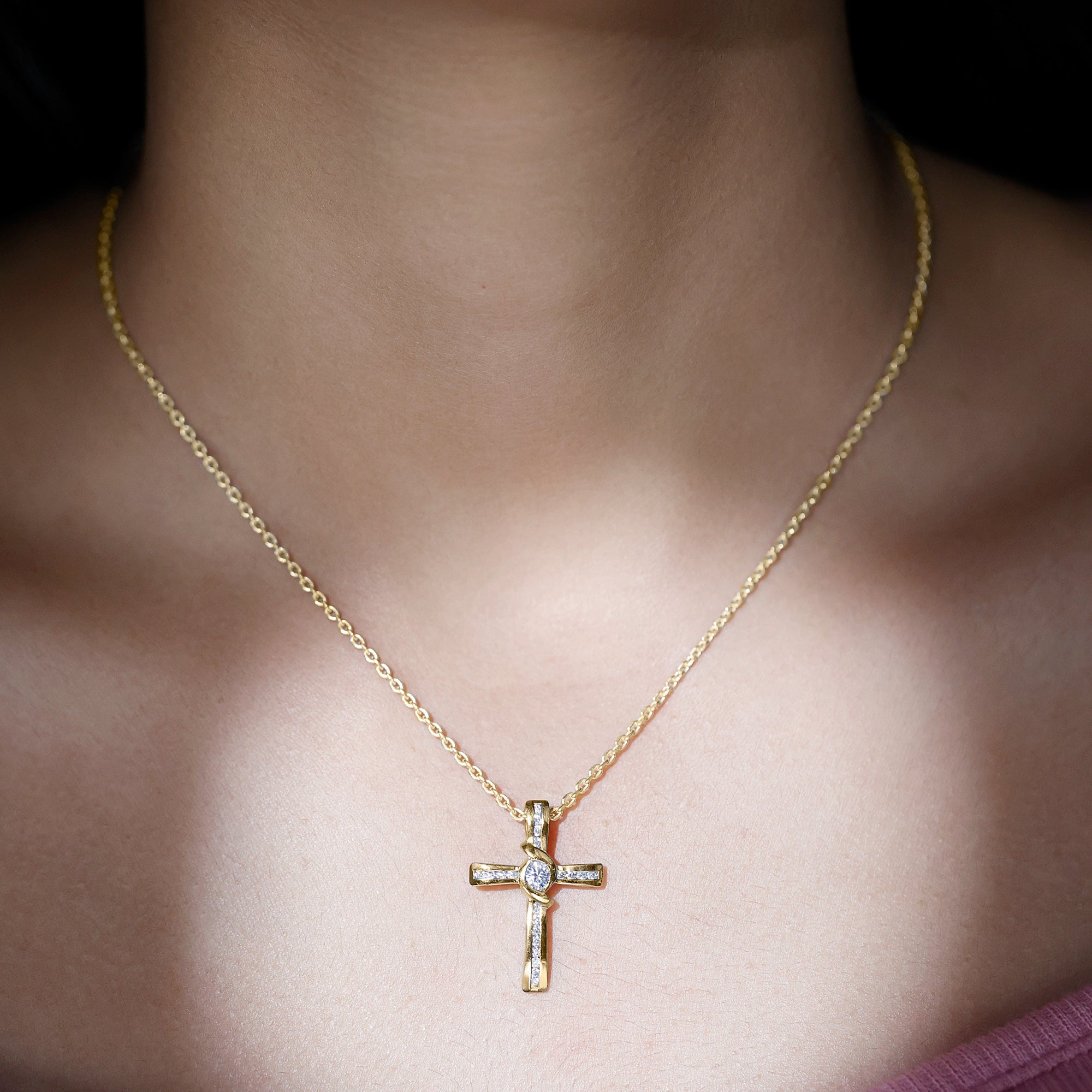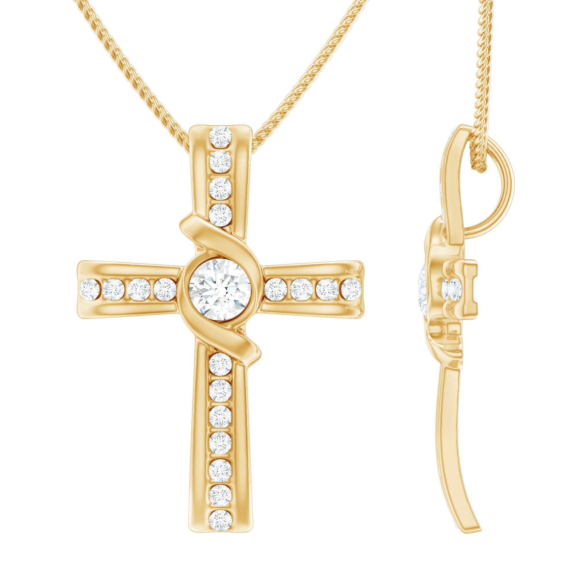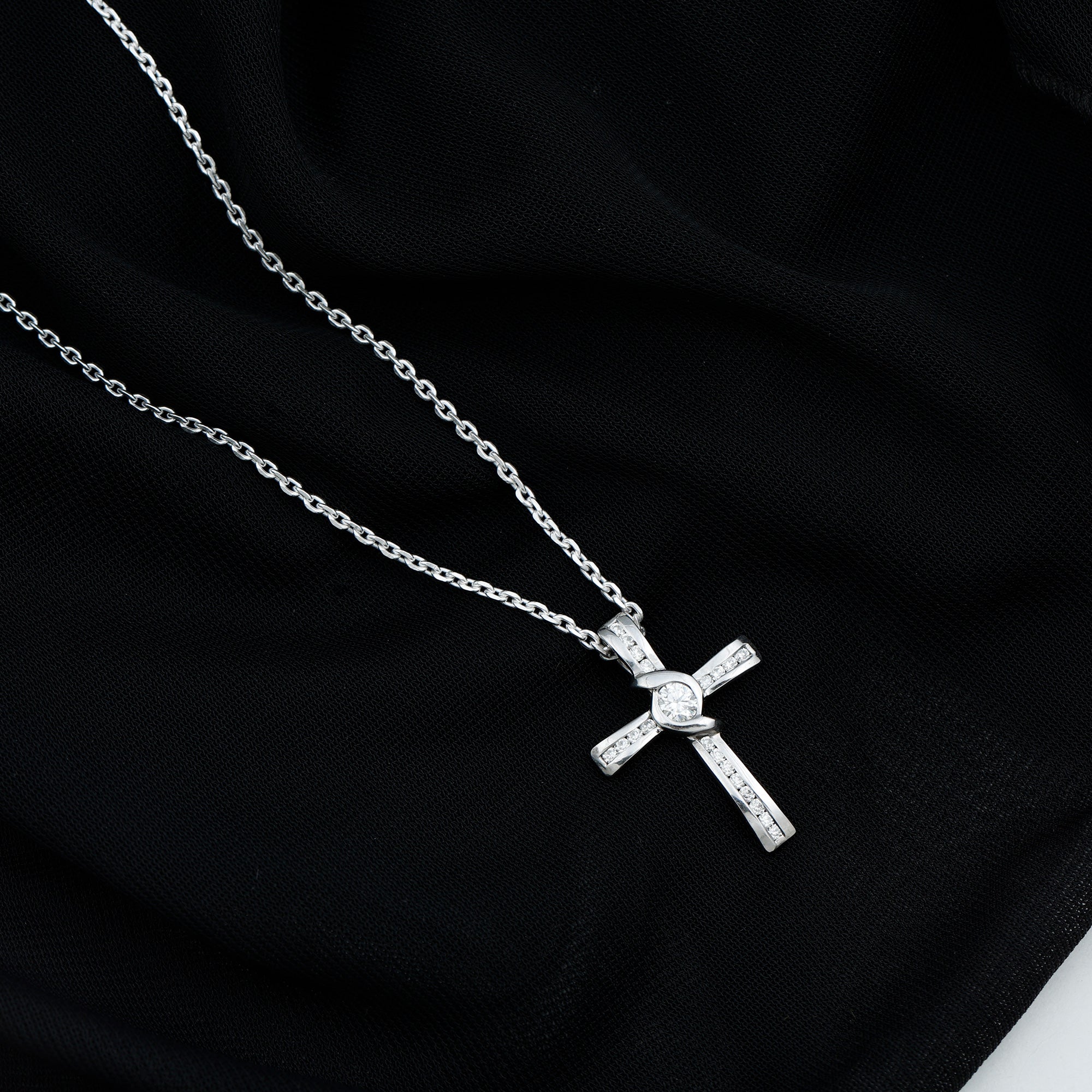 If you are looking for a piece of jewelry that is both meaningful and beautiful then your search ends here, our Diamond Cross Necklace is a great mix of faith and modern style. It features a powerful cross design adorned with horizontal and vertical bars of sparkling round cut diamonds of EF-VS Quality. At the center of the Lab Grown Diamond Pendant Necklace lies an elegant 4 MM round cut bezel set diamond, artistically placed with curved designs. This Cross Pendant Necklace is a ready-to-wear fine necklace. Give your blessings and show your never-ending love to your special one in the form of this Christian Necklace, it expresses every emotion when words are not enough.