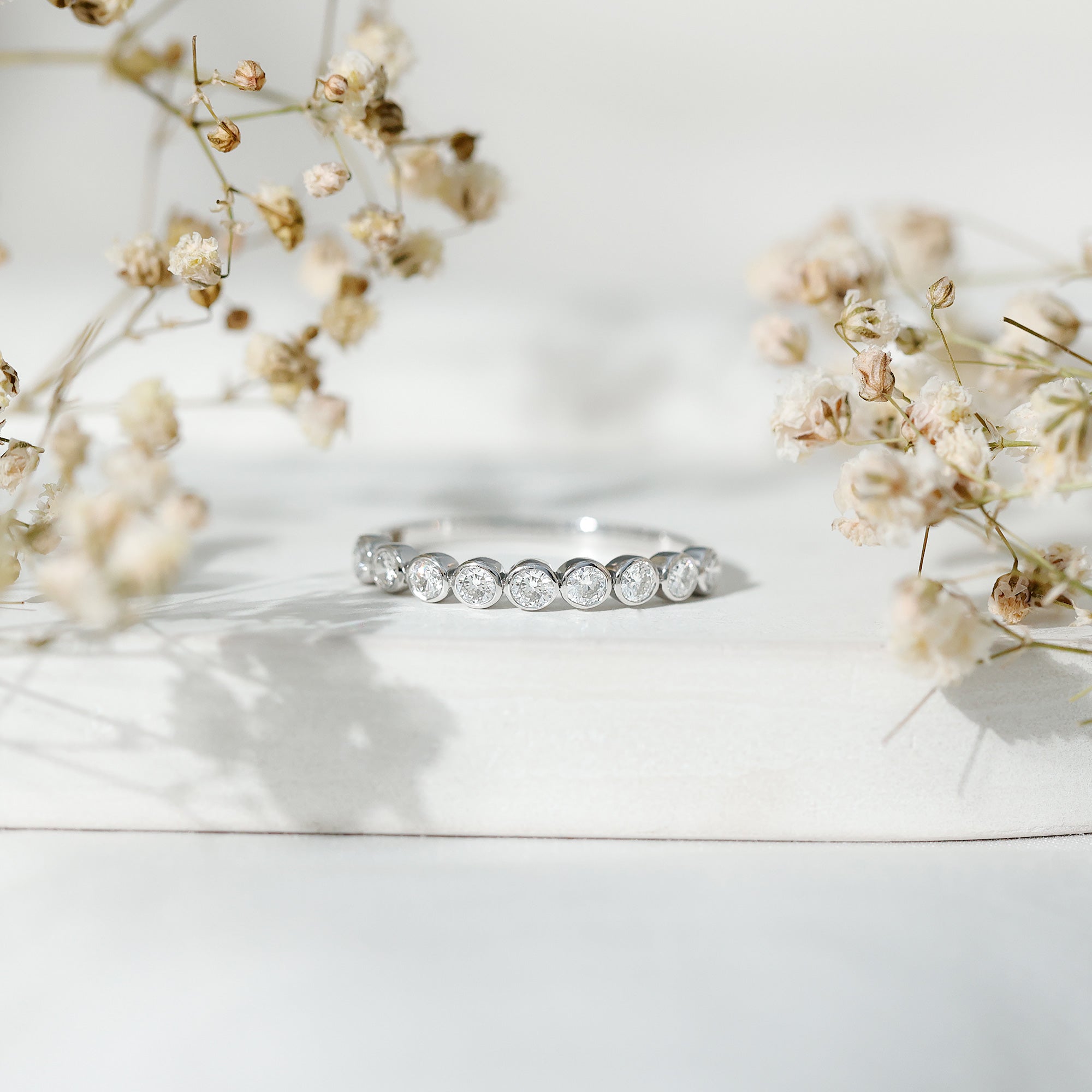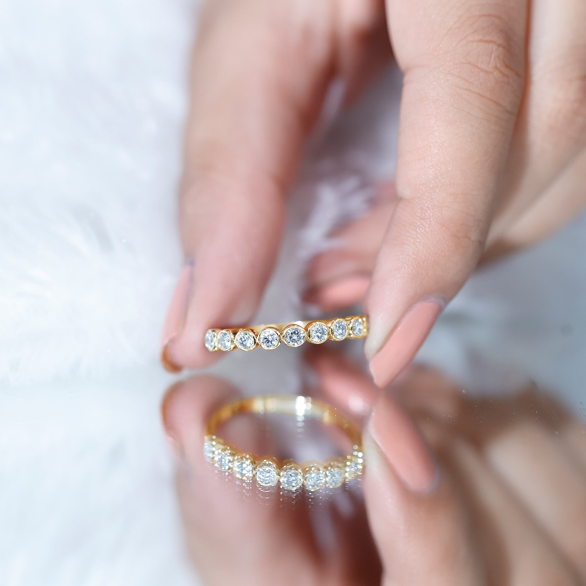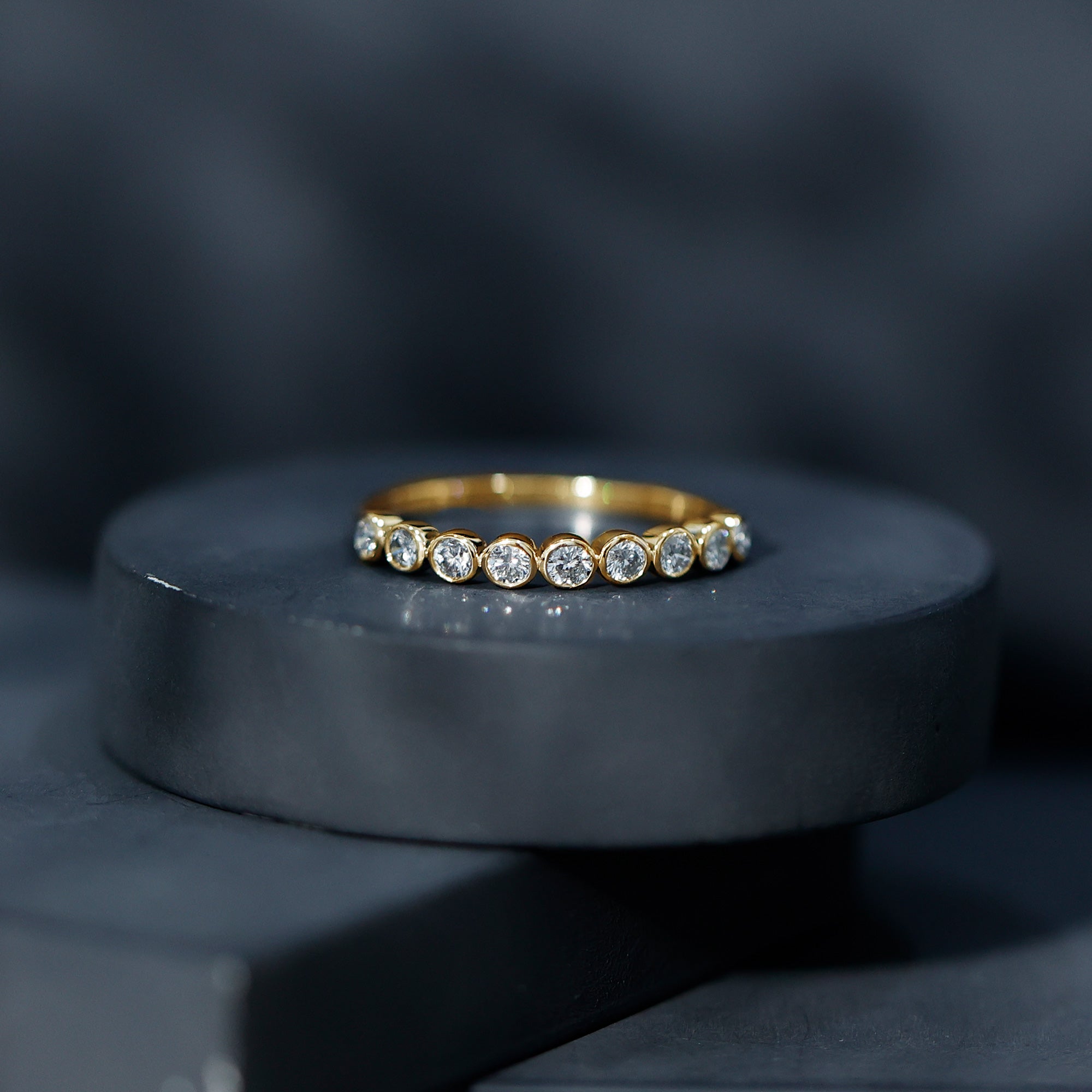 Simply stunning, this Diamond Half Eternity Ring is designed for the woman who loves minimalist pieces of jewelry but with a touch of modern elements. It is embellished with round cut lab grown diamonds (EF-VS quality), each set in bezel setting, adorning half of the band with unmatched sparkle. The minimalist design adds a touch of classic beauty while keeping the Diamond Anniversary Ring lightweight and comfortable for everyday wear. Also, all the gemstones in this Diamond Band Ring are lab made and certified and offer the same brilliance and durability as natural ones, but are created in an eco-friendly and sustainable way, making this piece a responsible and stylish choice. Presented in a premium box, it is the perfect choice for a moment you will cherish forever.