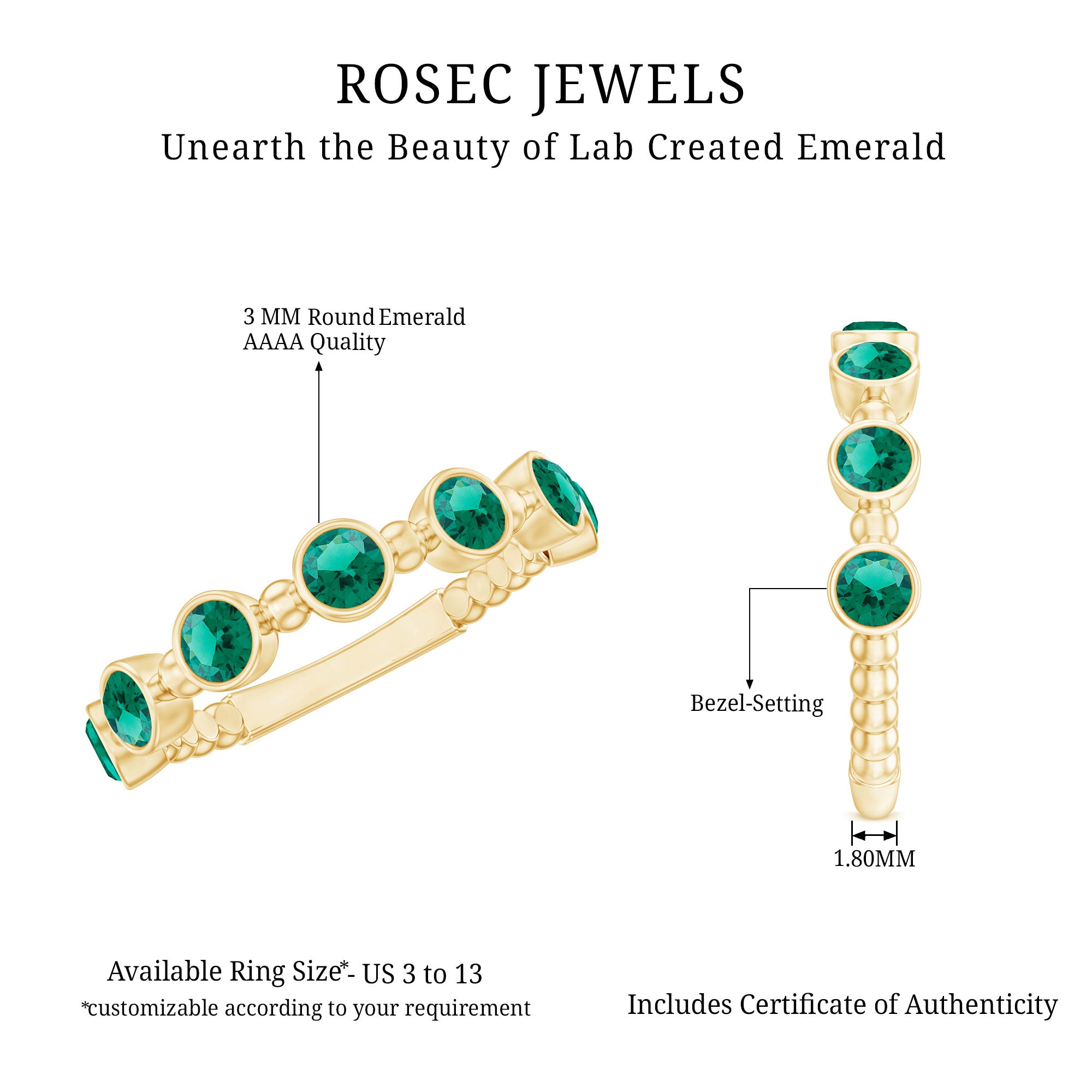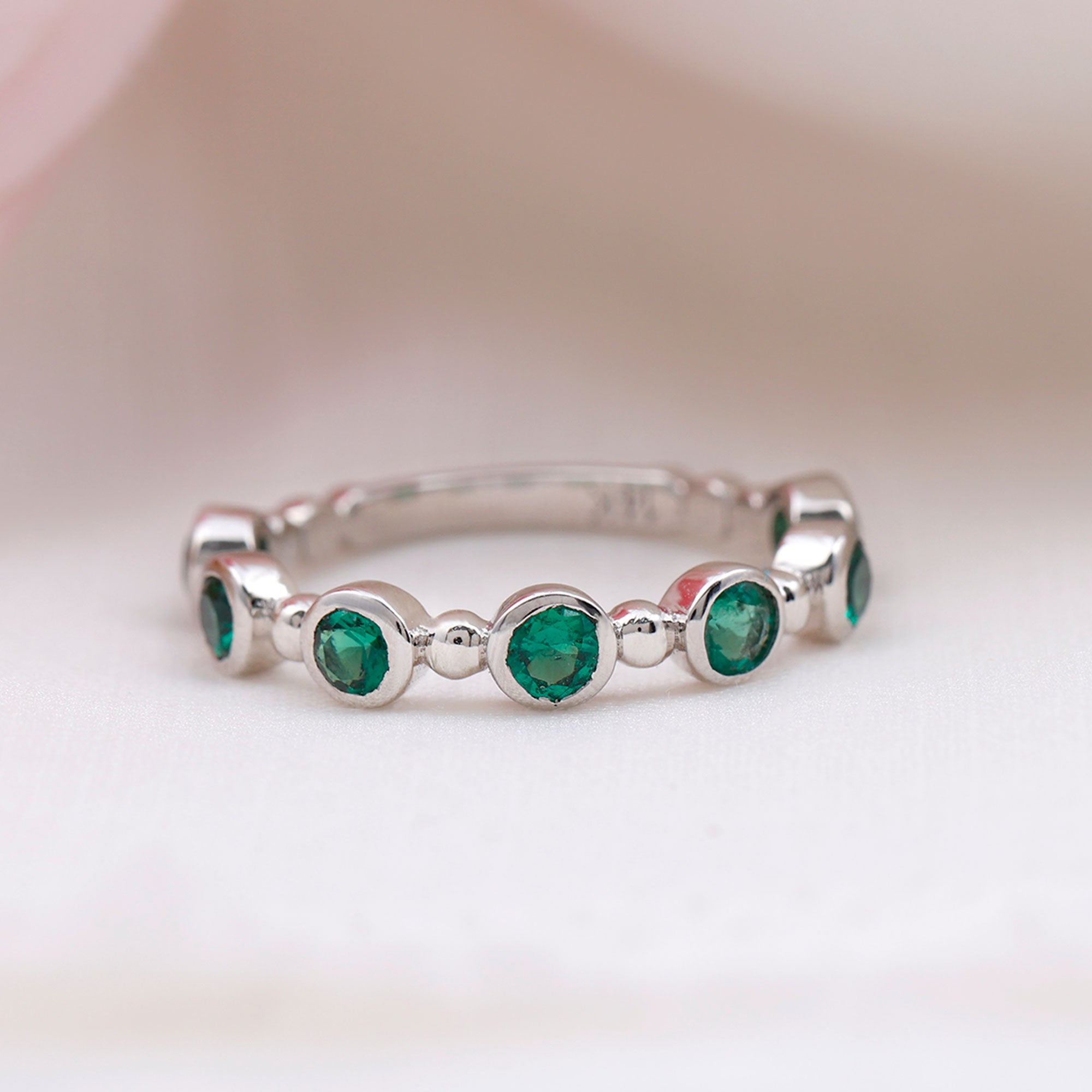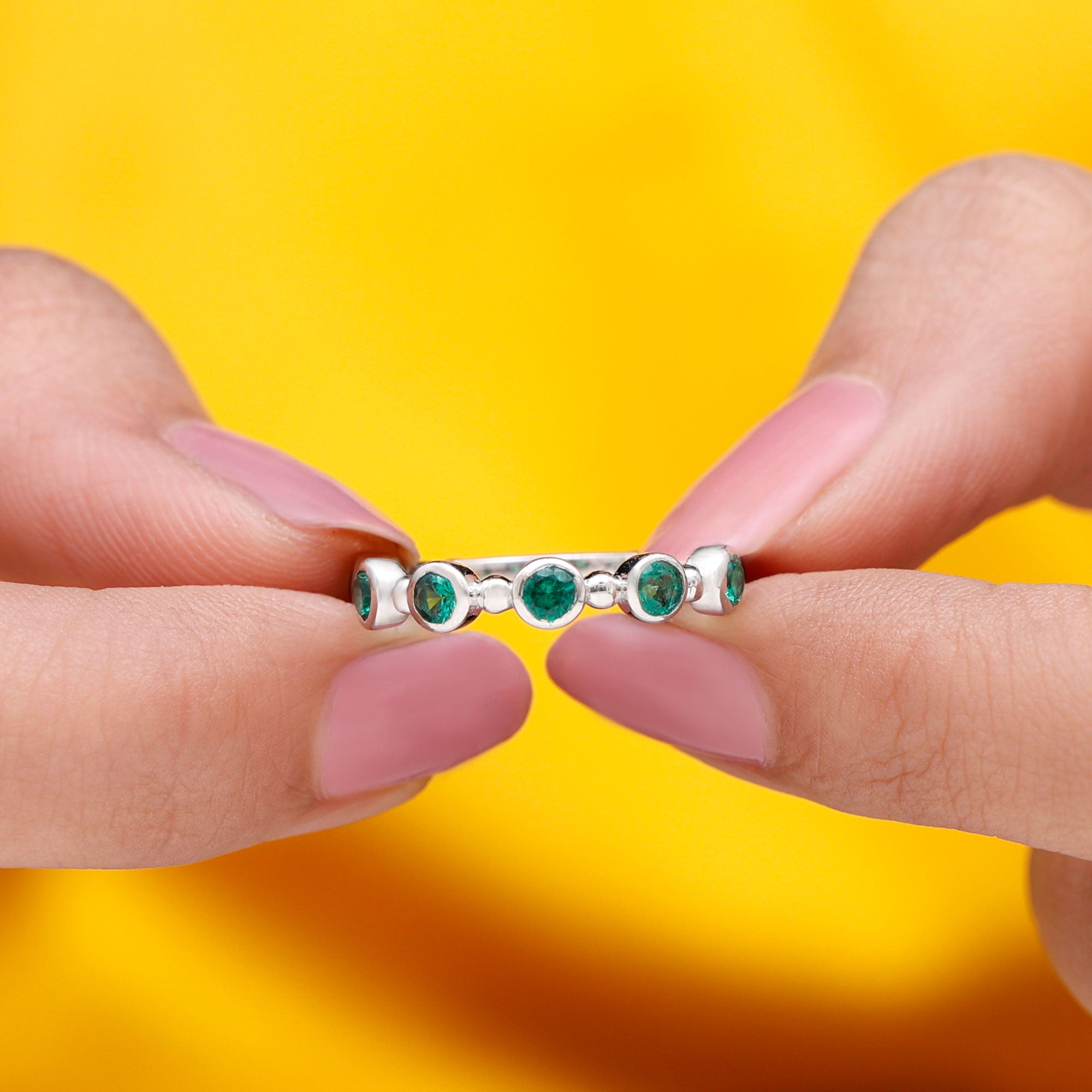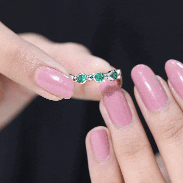 This stunning Half Eternity Ring is all about subtle beauty. Seven bright green 3 mm Round Shape Lab Created Emerald stones are set in a row, creating a simple yet eye-catching design. Each Lab Emerald of AAAA Quality is set in Bezel Setting, giving the ring a modern look that feels easy to wear. What makes this ring stand out is the thoughtful Beaded Detailing along the band. These tiny metal beads add a hint of vintage charm in a playful and elegant way. Available in various ring sizes, this Lab Grown Emerald Ring is perfect for everyday wear, stacking with other rings, or as a meaningful gift for anniversary or milestone. Simple and a little different, this Bezel Set Emerald Ring celebrates beauty, love, and thoughtful design. Presented in a jewelry box, this Emerald Eternity Ring is a modern twist on a classic design, made to be worn and cherished every day.
