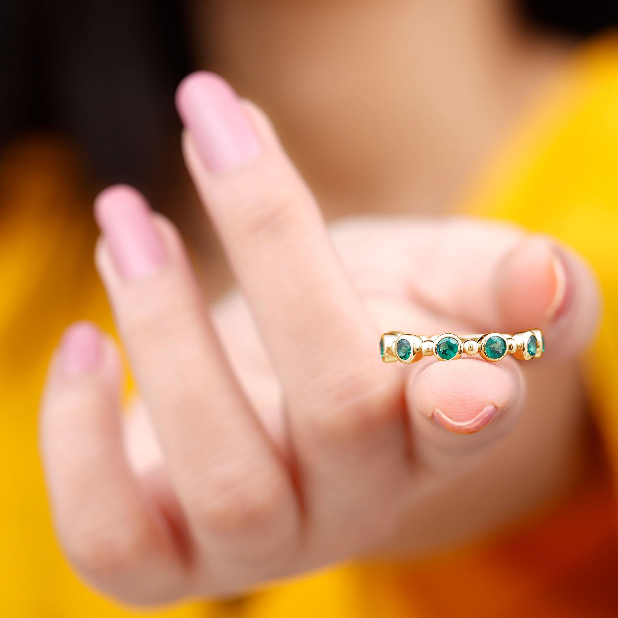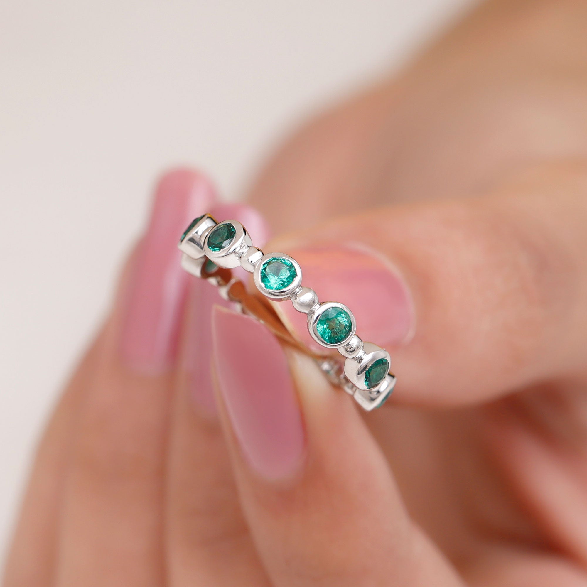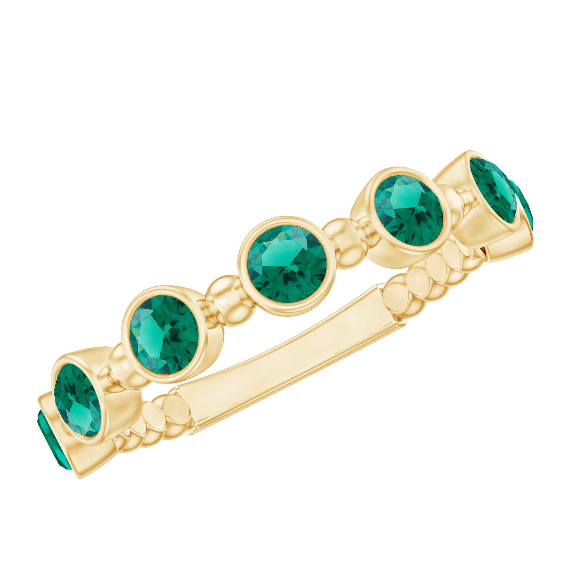 This stunning Half Eternity Ring is all about subtle beauty. Seven bright green 3 mm Round Shape Lab Created Emerald stones are set in a row, creating a simple yet eye-catching design. Each Lab Emerald of AAAA Quality is set in Bezel Setting, giving the ring a modern look that feels easy to wear. What makes this ring stand out is the thoughtful Beaded Detailing along the band. These tiny metal beads add a hint of vintage charm in a playful and elegant way. Available in various ring sizes, this Lab Grown Emerald Ring is perfect for everyday wear, stacking with other rings, or as a meaningful gift for anniversary or milestone. Simple and a little different, this Bezel Set Emerald Ring celebrates beauty, love, and thoughtful design. Presented in a jewelry box, this Emerald Eternity Ring is a modern twist on a classic design, made to be worn and cherished every day.