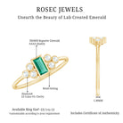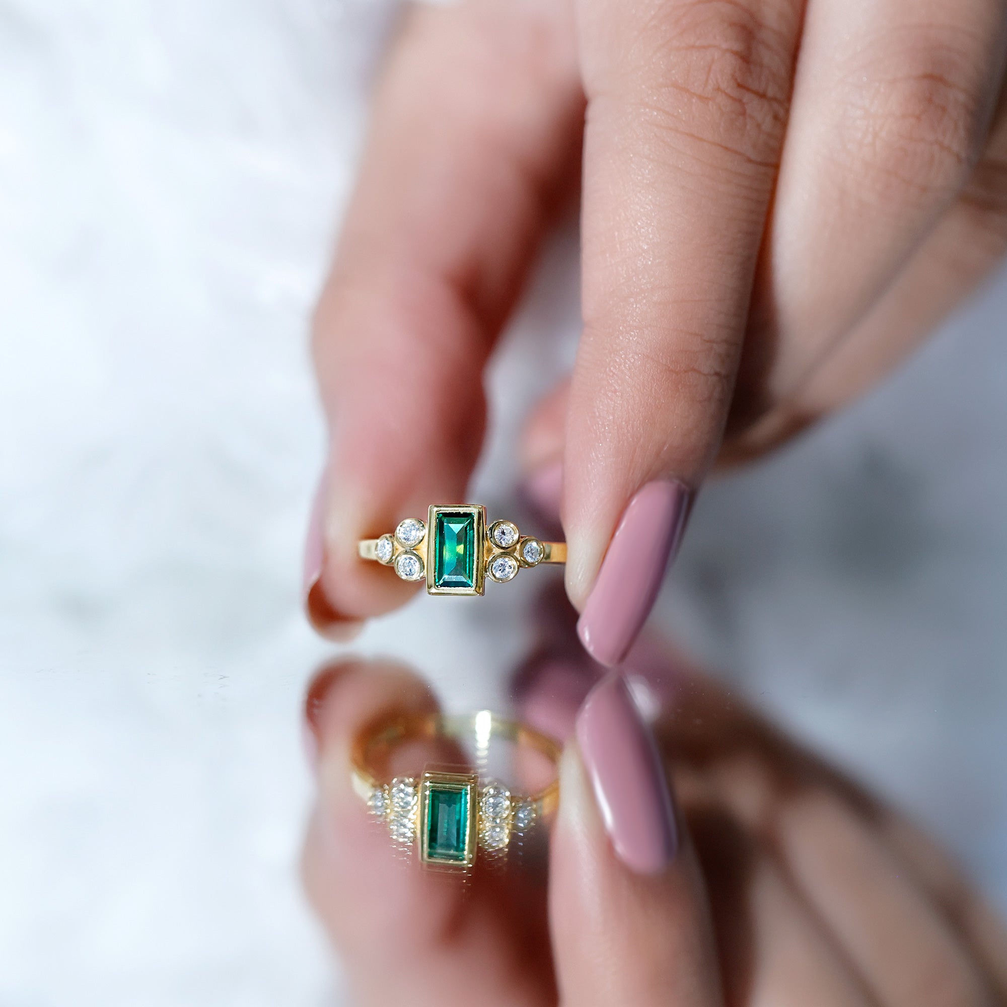 Looking for a ring that is unique, beautiful, and says ‘forever’ without saying a word? You just found it. Mark your love with this uniquely designed Lab Created Emerald Promise Ring, thoughtfully crafted to make every moment feel timeless. Made in 14K yellow gold plated silver, this elegant Commitment Ring for Women brings together modern beauty and ethical craftsmanship in one meaningful piece. At the center of the design sits a striking baguette cut lab created emerald set in bezel setting. Enhancing the emerald are trios of round lab grown diamonds on either side, also secure in bezel setting. These trios represent the past, present, and future of your journey together, making it a truly romantic choice. Each stone in this Emerald and Diamond Ring is ethically lab grown, making it a conscious choice for those who value both beauty and sustainability. The slim, polished band provides a subtle contrast to the bold geometry of the centerpiece, ensuring that the overall design remains elegant, wearable, and timeless. Whether it is a promise, a proposal, or a personal milestone, this Pre Engagement Ring tells a story of commitment and style.