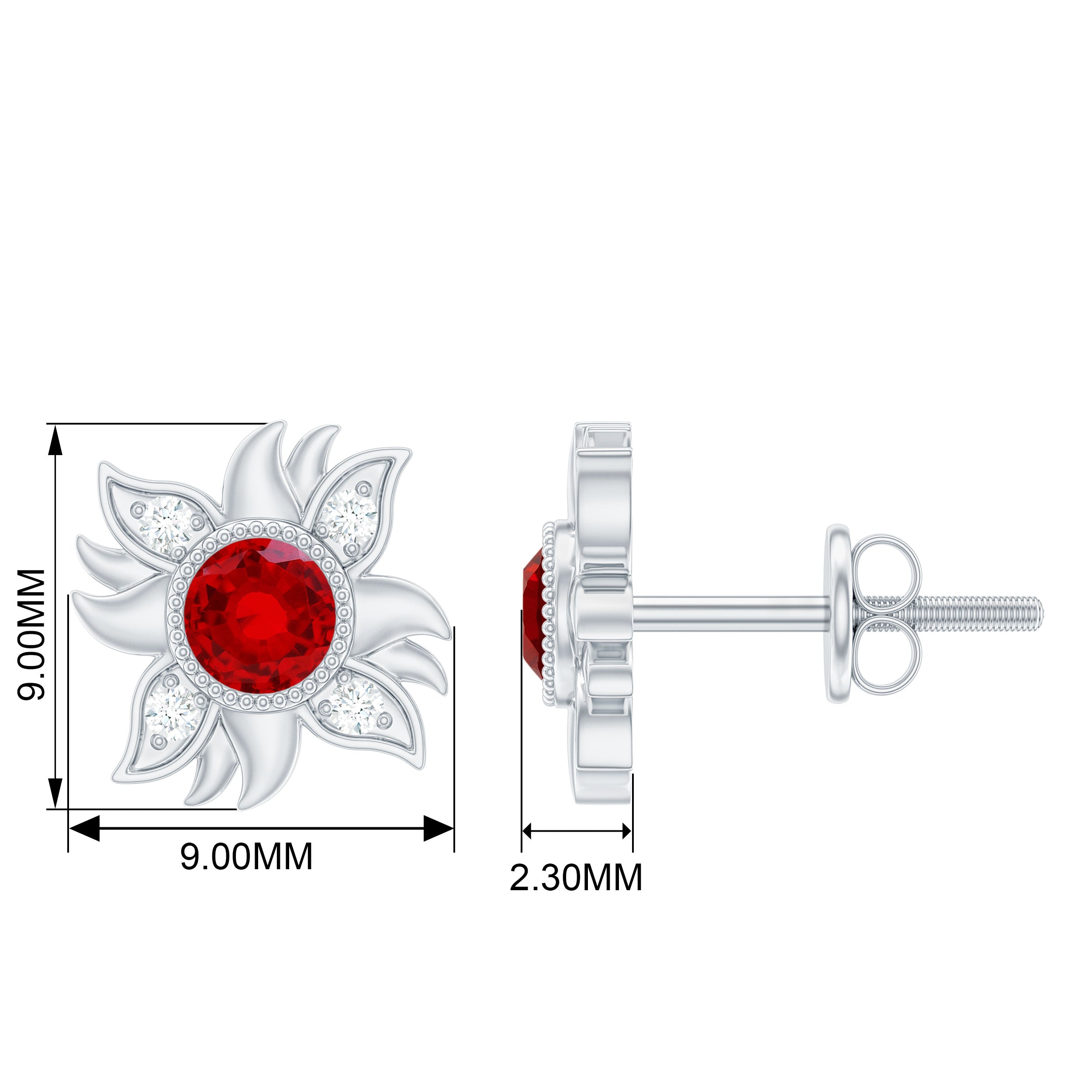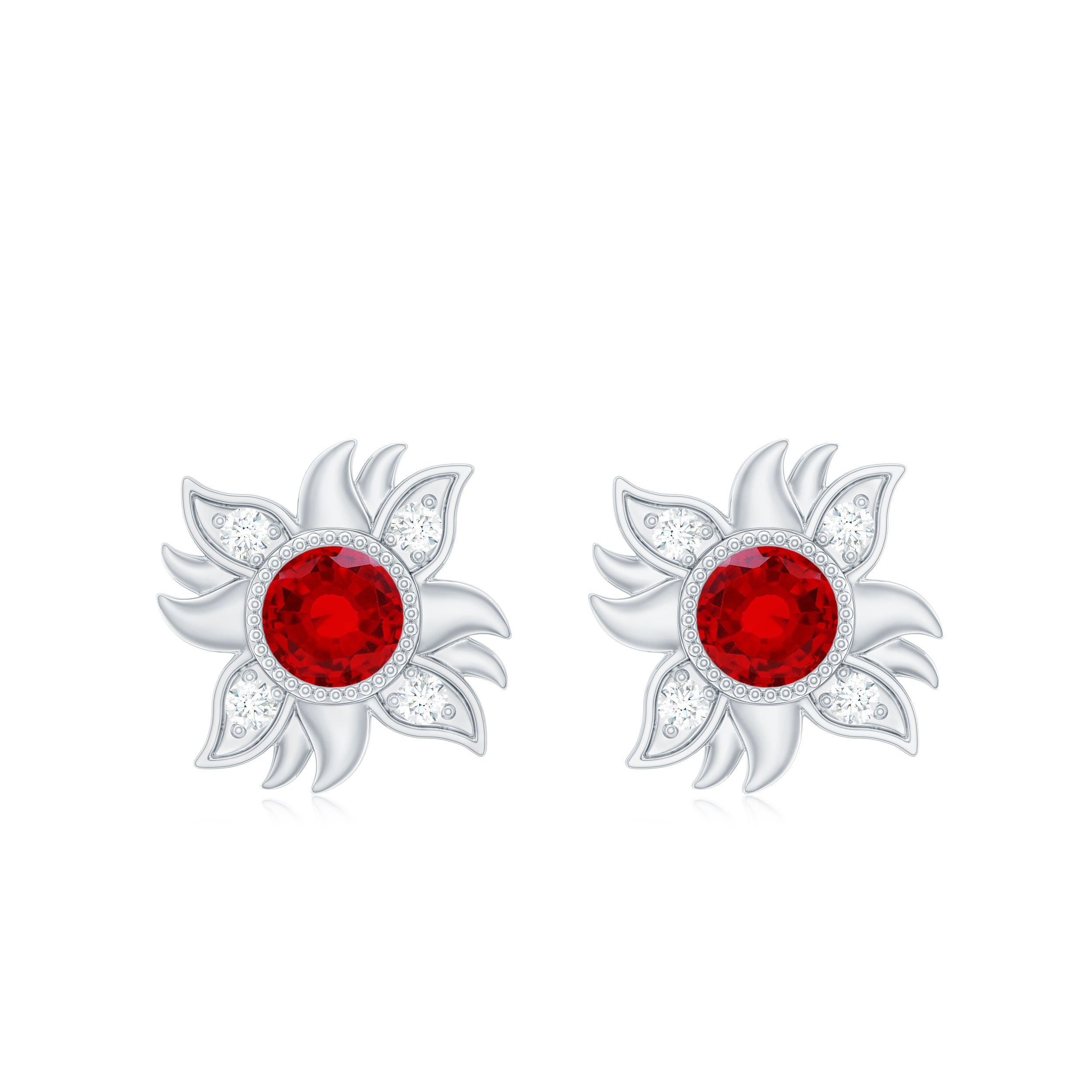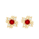 Capture the radiance of the sun with these Sunburst Stud Earrings. A brilliant Round Shape Created Ruby takes center stage in a Bezel Setting, while sparkling round Diamond stones form a stunning floral pattern. These earrings exude elegance and charm for a mesmerizing look.