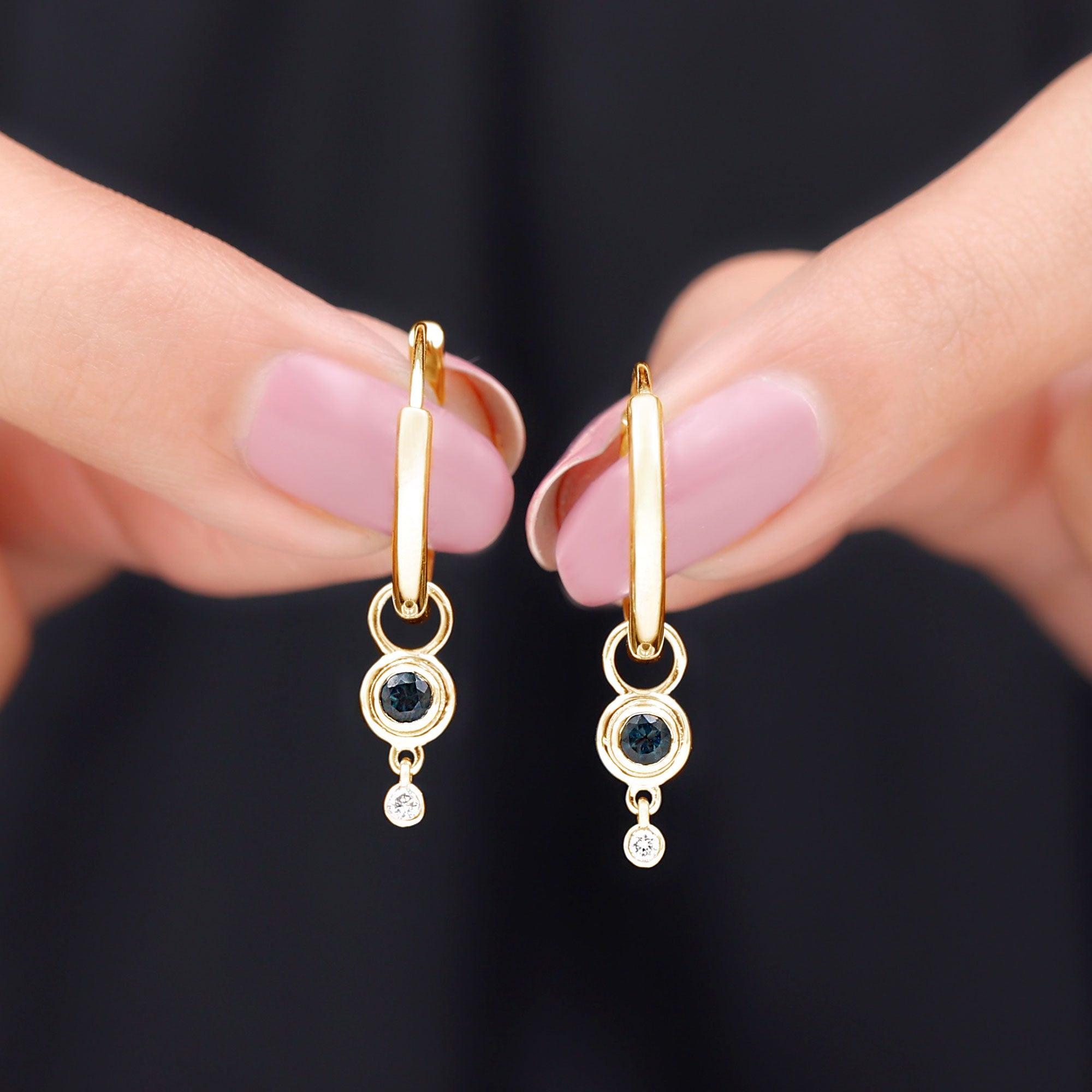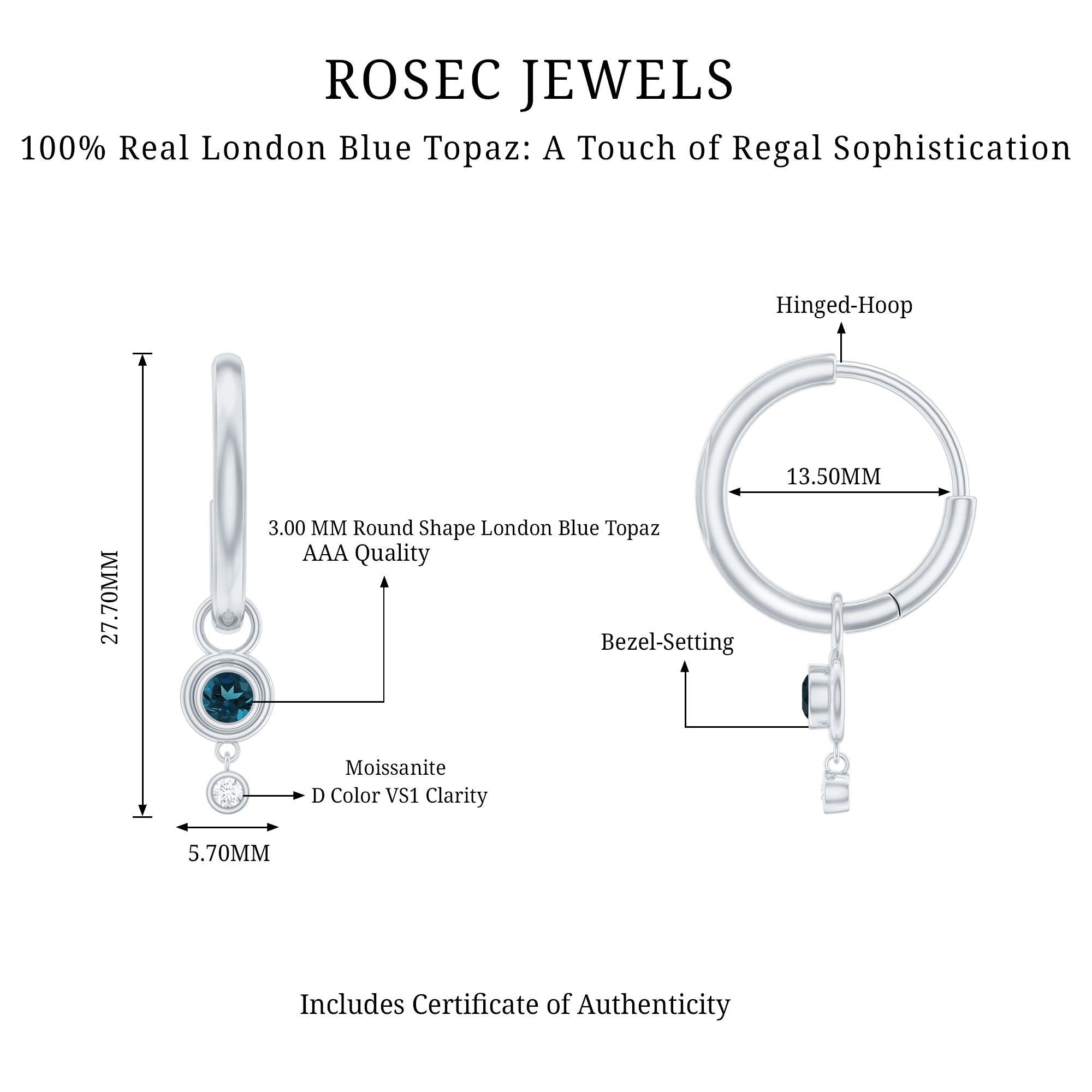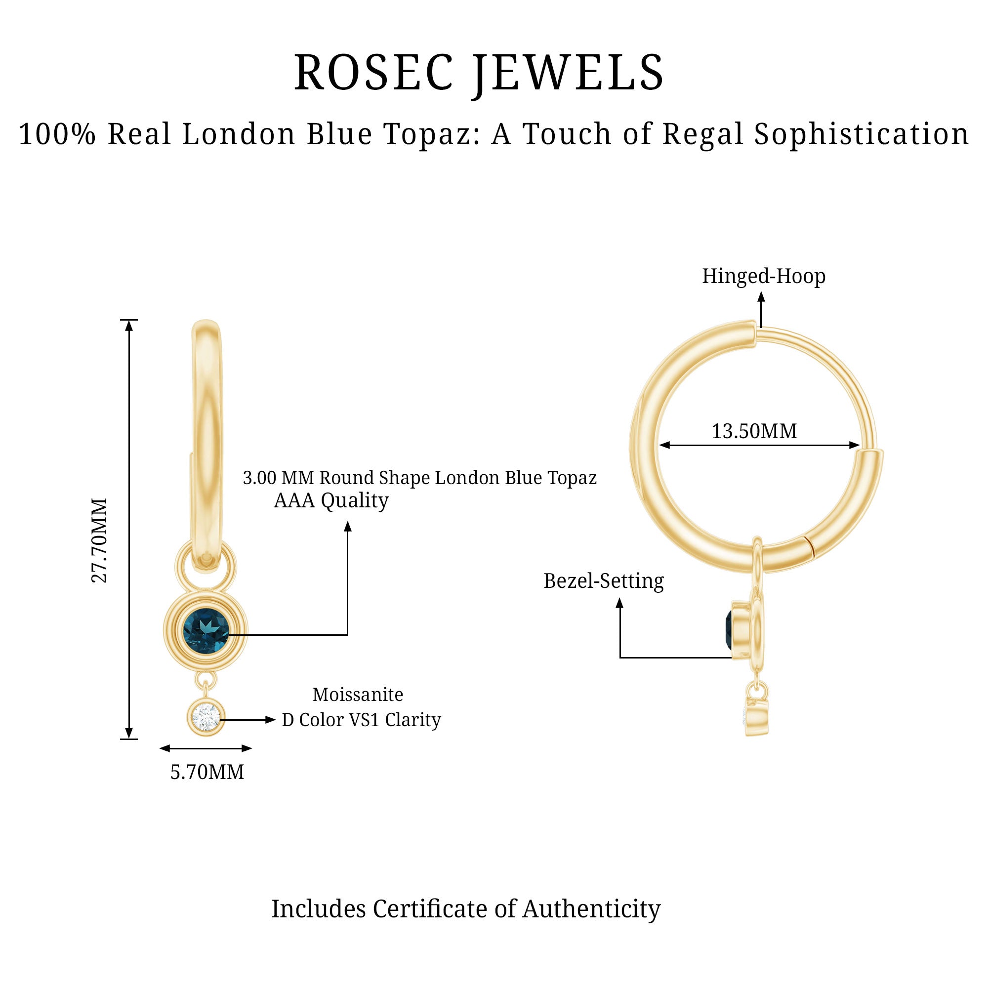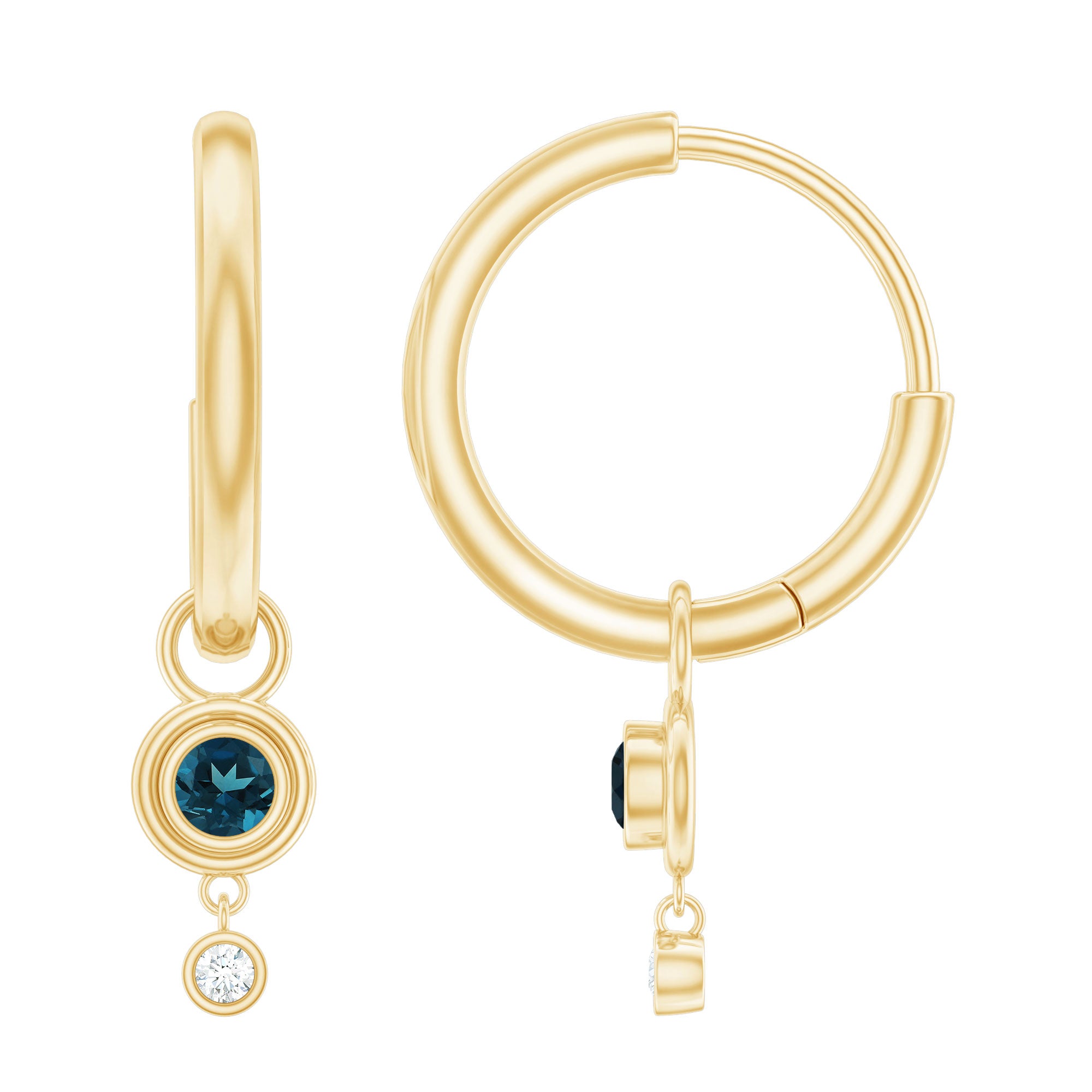 Elevate her joy with these captivating Simple Hoop Drop Earrings. Adorned with Round Cut London Blue Topaz stones, carefully set in a mesmerizing Bezel Setting, these earrings exude an air of sophistication. A touch of brilliance is added by the sparkling Round Cut moissanite stones accompanying the London Blue Topaz gems. Crafted from Solid Gold, these earrings offer a perfect blend of simplicity and elegance. Surprise her with these London Blue Topaz Hoop Drop Earrings and let her revel in the exquisite beauty they possess.