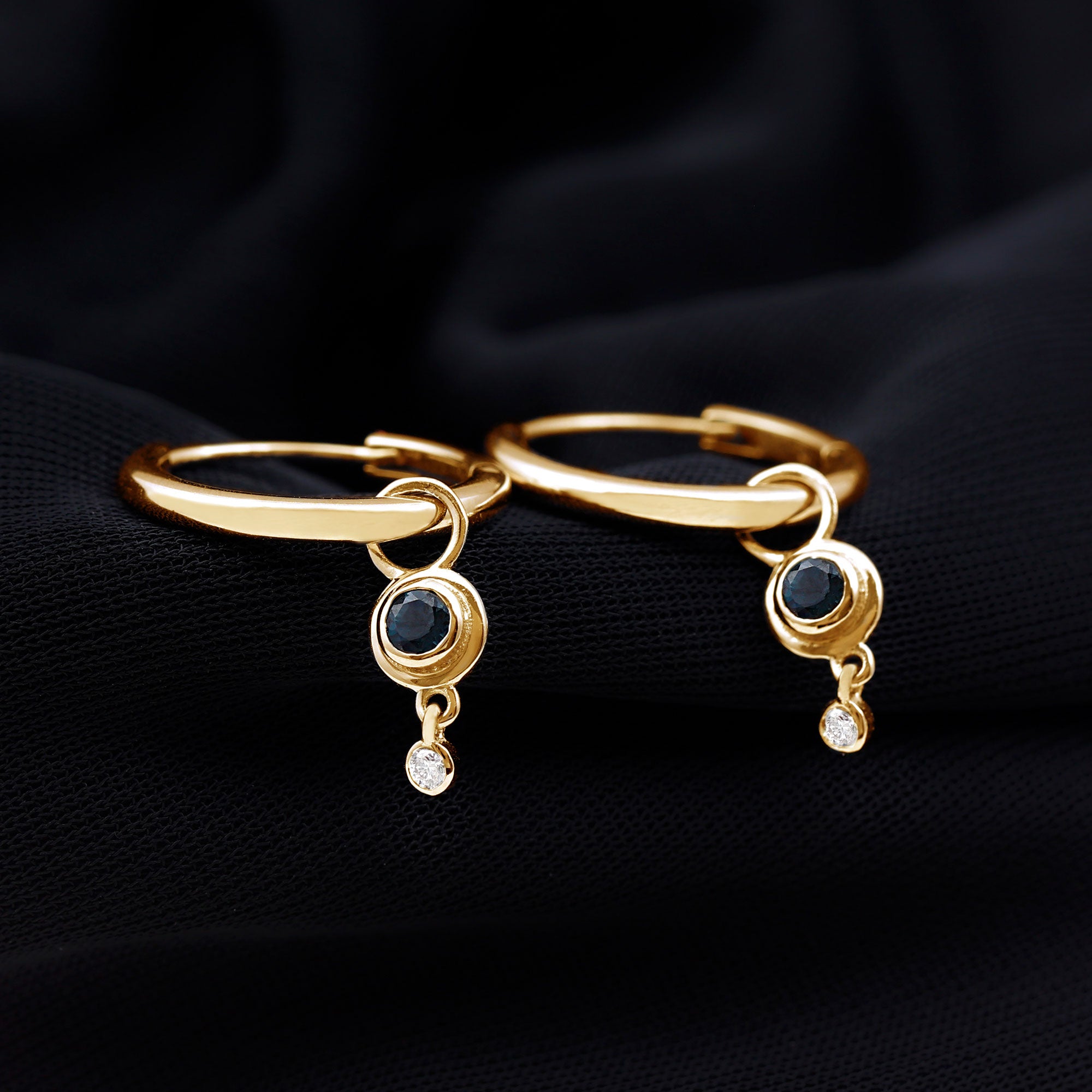 Bezel Set London Blue Topaz and Moissanite Hoop Drop Earrings in Gold