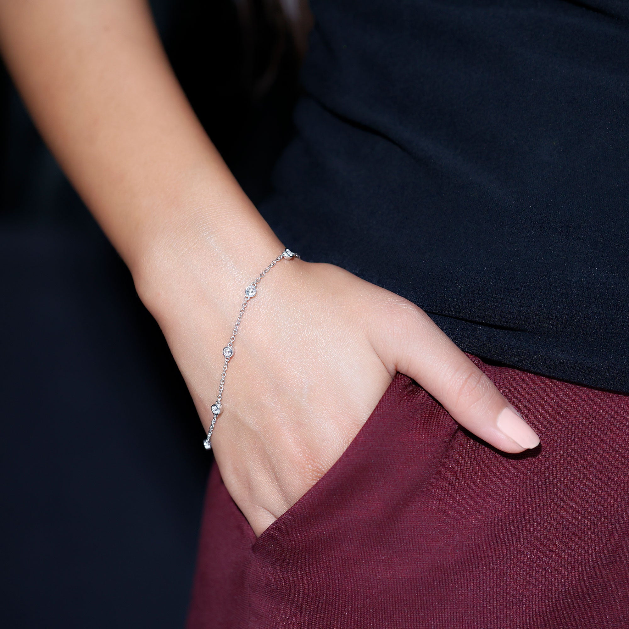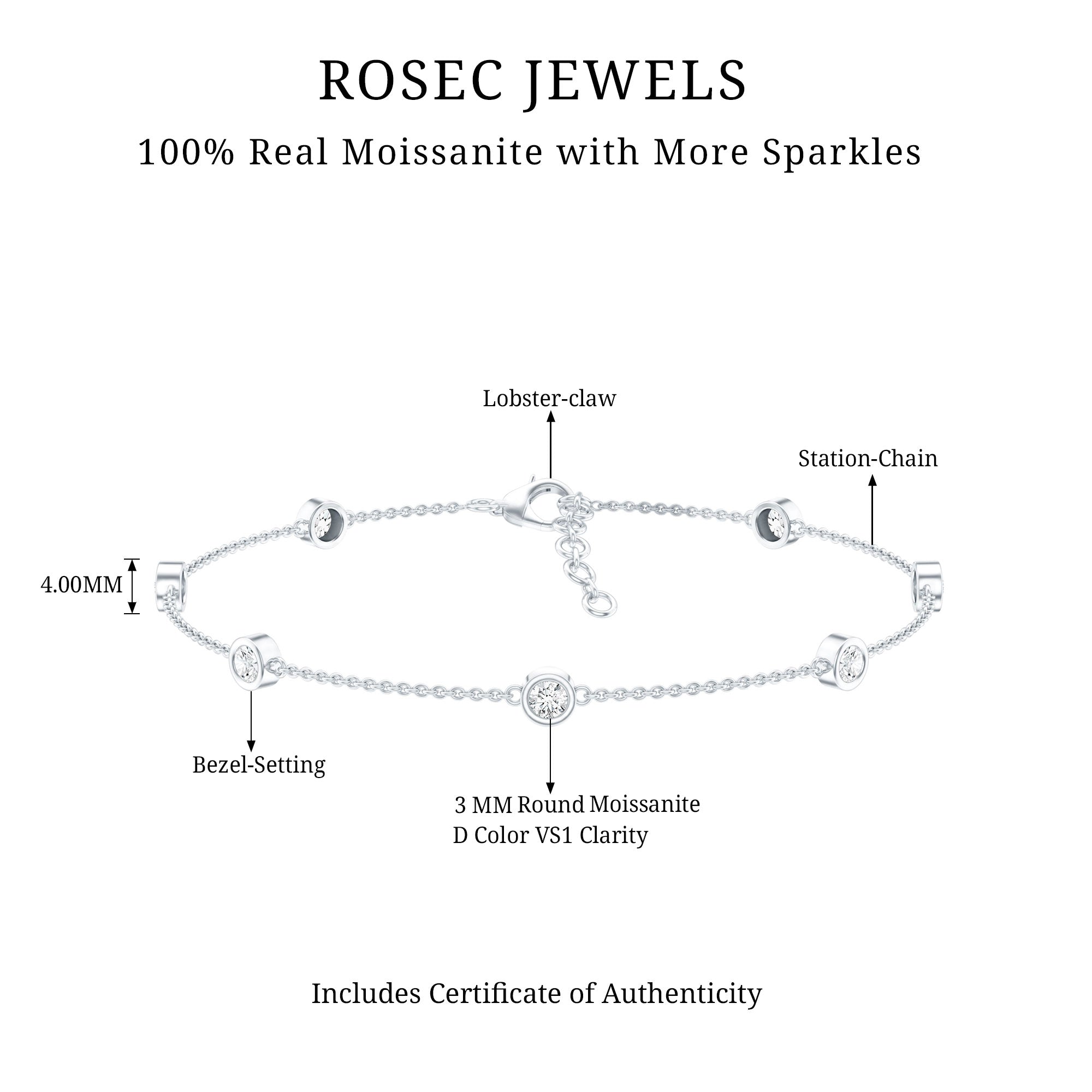 Wrap sparkle and elegance around your wrist with this Stackable Bracelet. Embellished with shimmering seven round cut moissanite stones, each securely nestled in bezel setting. These sparkling D-VS1 quality moissanites are thoughtfully spaced along a lightweight chain, allowing each stone to shine individually. This Moissanite Chain Bracelet is a perfect balance of minimalism and sophistication, it adds a subtle yet captivating sparkle to your everyday style. You can wear it solo for an effortlessly chic look or layered with other favorites, this Station Bracelet is a must-have. It also makes a beautiful gift for your loved one, ideal for celebrating milestones, birthdays, or simply cherishing lifes beautiful moments. This Seven Stone Bracelet is handcrafted in 14k white gold plated silver for a perfect shine and look. It also features a sturdy lobster clasp that keeps it secure on your wrist while allowing easy wear. The adjustable chain ensures a comfortable fit and makes it simple to customize the length as needed. It comes carefully packed in a jewelry box, ready for gifting - no extra wrapping needed.