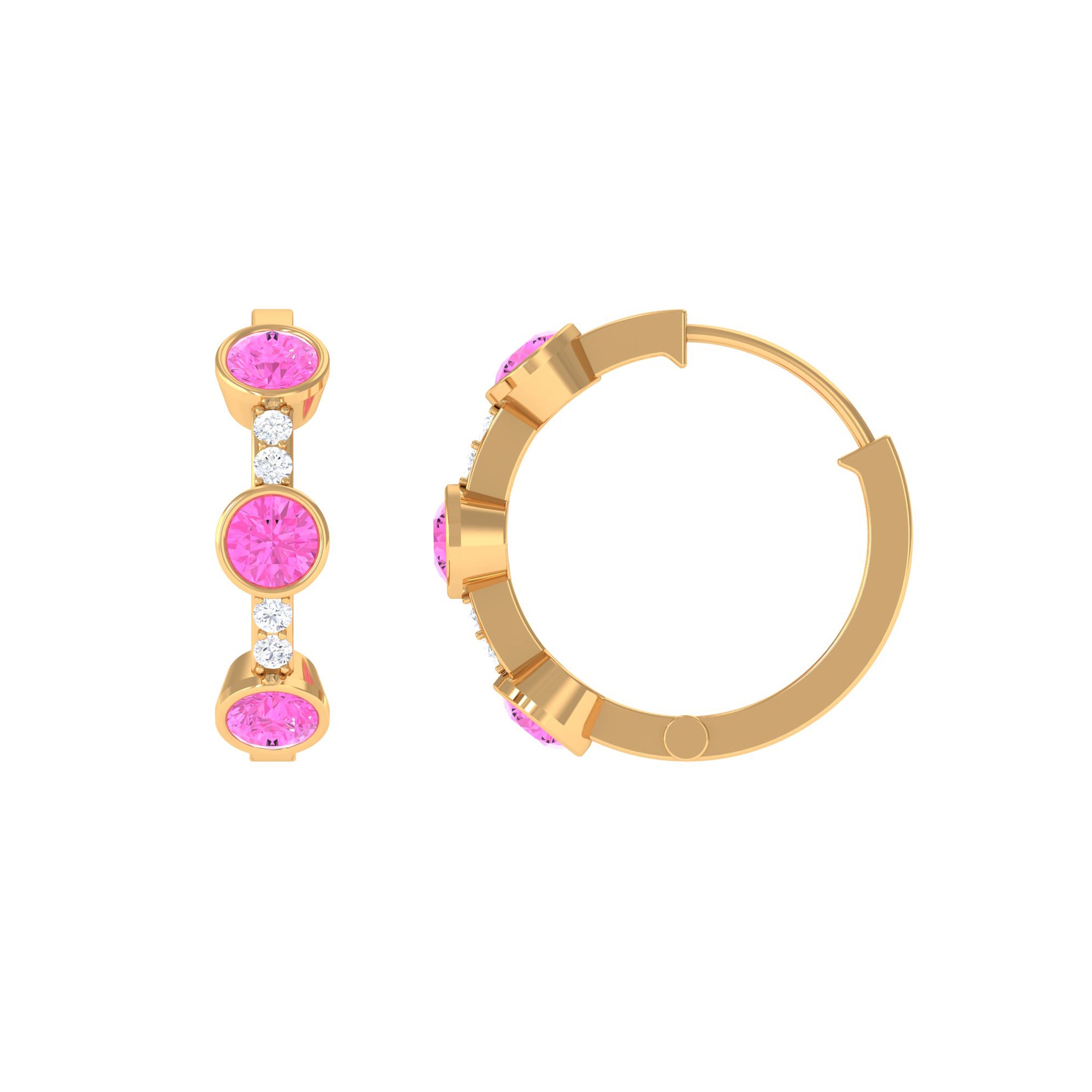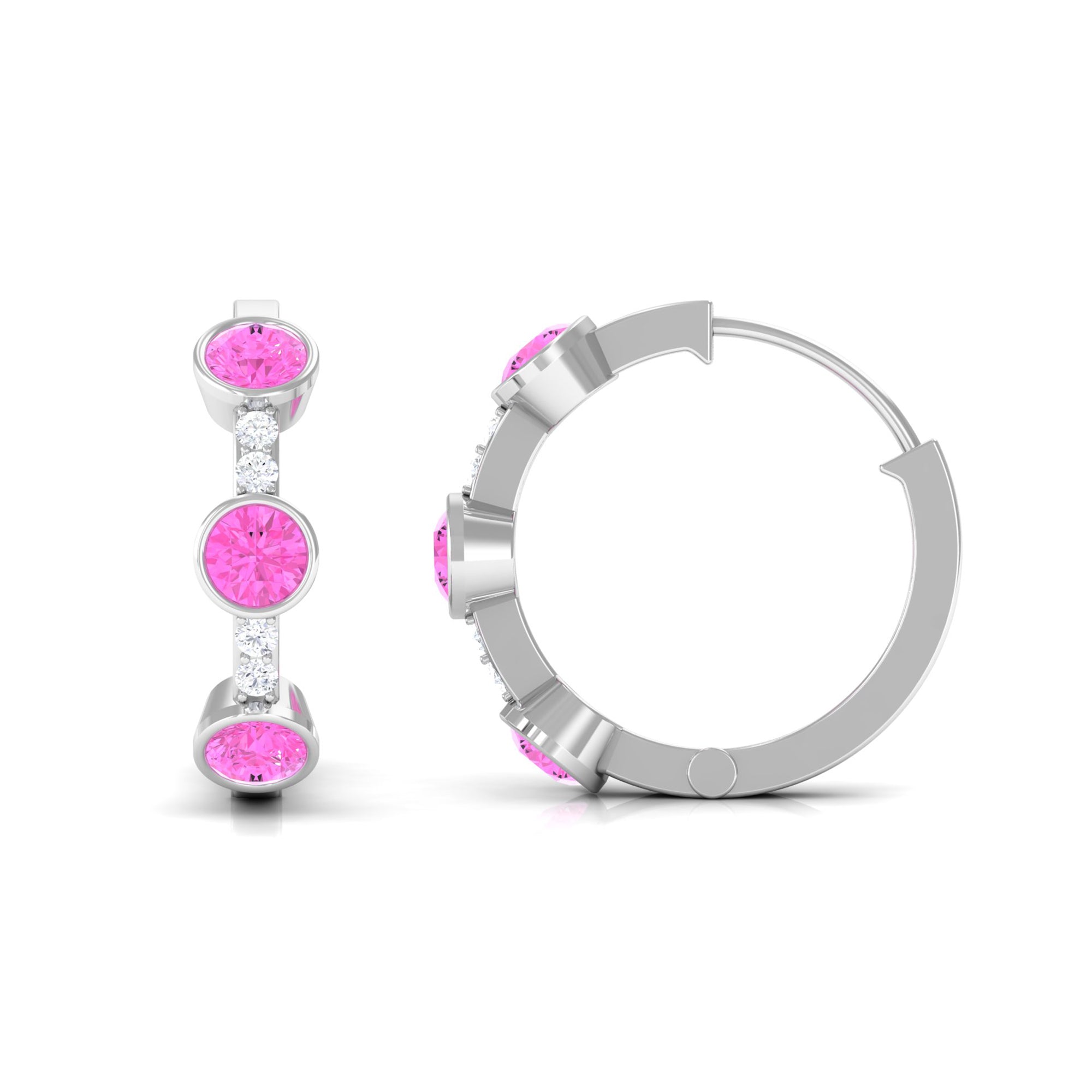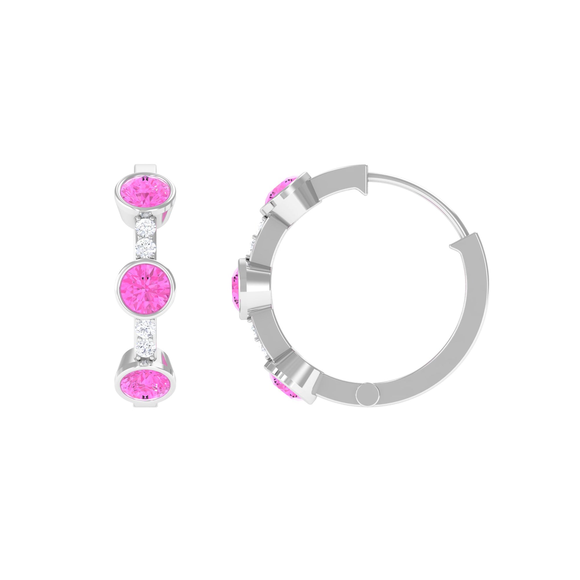 Bezel Set Pink Sapphire 3 Stone Hinged Hoop Earrings with Diamond