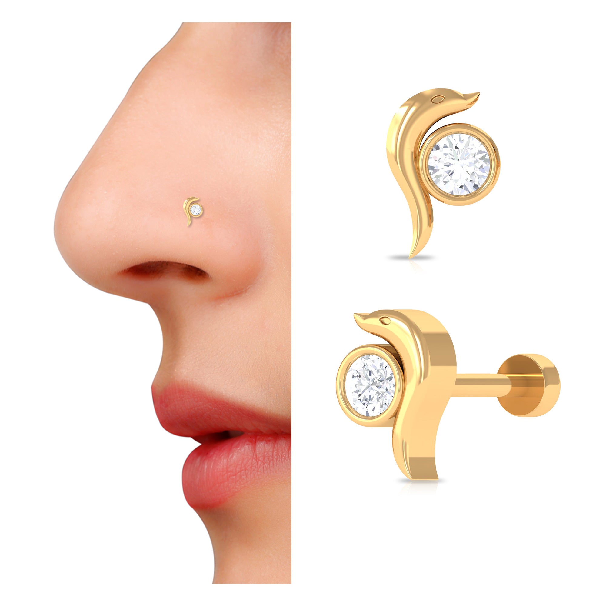 Adorn your nose with this stunning Diamond Nose Pin featuring a sleek dolphin design intricately engraved with Round Shape Diamond in a Bezel Setting. Meticulously crafted from high-quality Solid Gold Metal, it is available in Yellow, White, and Rose Gold finishes. The simple yet secure Flat Back Closure ensures it stays in place all day long. Its modern and alluring design is sure to elevate your look, leaving you feeling radiant and stylish.
