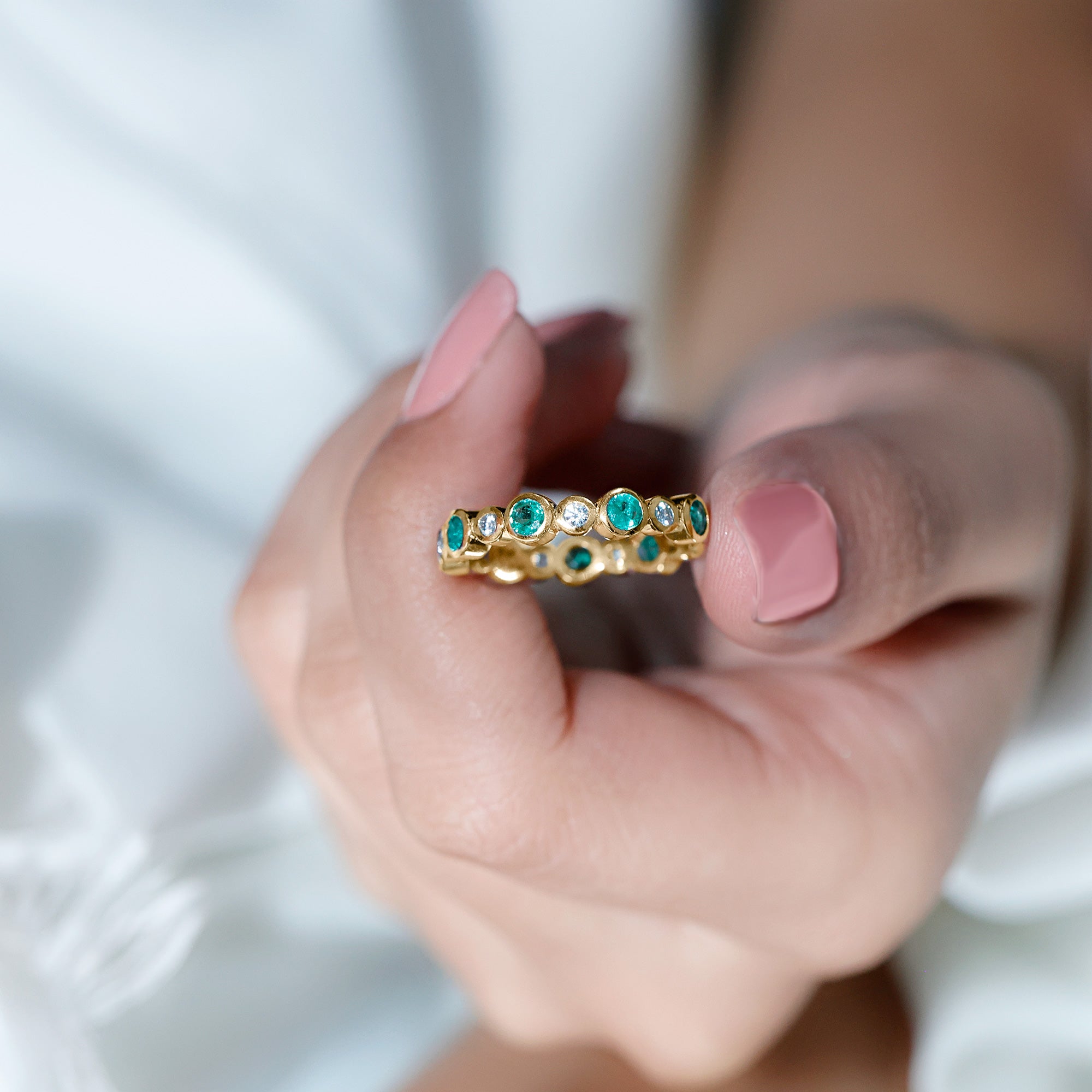 Every love story deserves a touch of brilliance, and this Emerald Eternity Ring is the perfect way to celebrate yours. Designed with elegance and meaning, this beautiful Full Eternity Ring features a continuous circle of round shaped AAA quality emeralds alternating with slightly smaller round cut D-VS1 quality moissanite stones. Each gem is set securely in bezel setting, creating a flawless flow of sparkle and color that symbolizes never-ending love and commitment. Together, they create a stunning contrast that feels both modern and timeless. The full eternity design makes it a beautiful reminder of lasting bonds and shared moments that never fade. Perfect as a emerald wedding band, anniversary ring, or a meaningful gift, this Emerald and Moissanite Band adds a sophisticated charm to any look. It can be worn alone for a simple statement or stacked with your engagement or wedding rings for extra sparkle and style.