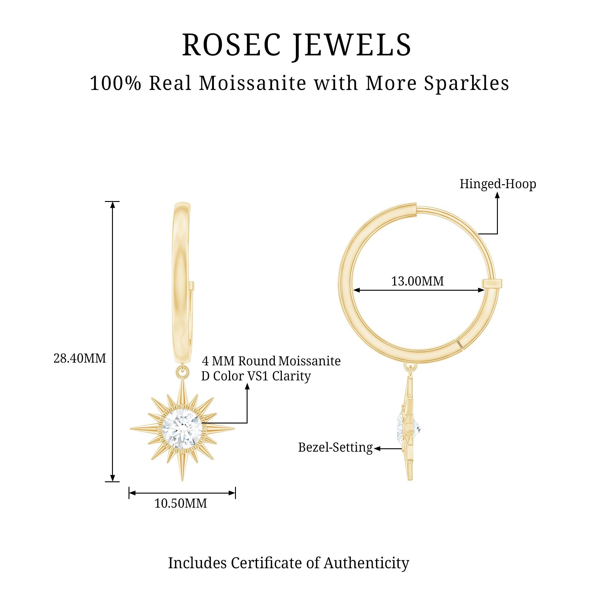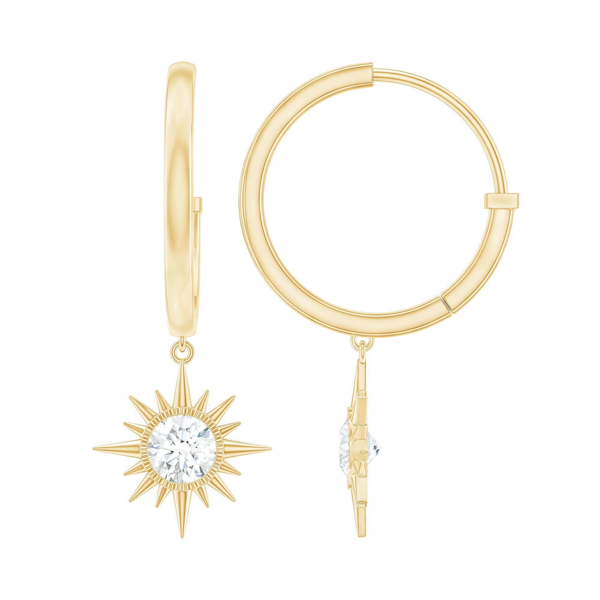 Experience the celestial allure of these hoop drop earrings, where a radiant bezel-set moissanite steals the spotlight, mirroring the mesmerizing beauty of galaxies. The luminous metal embellishments gracefully enhance these sunburst earrings, elevating their stunning appeal. Intricate detailing surrounds the center stone, infusing the design with an exquisite touch. For utmost comfort, these earrings are delicately attached to hinged hoop findings. Prepare to be enchanted by their celestial-inspired charm and revel in the elegance they exude.