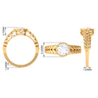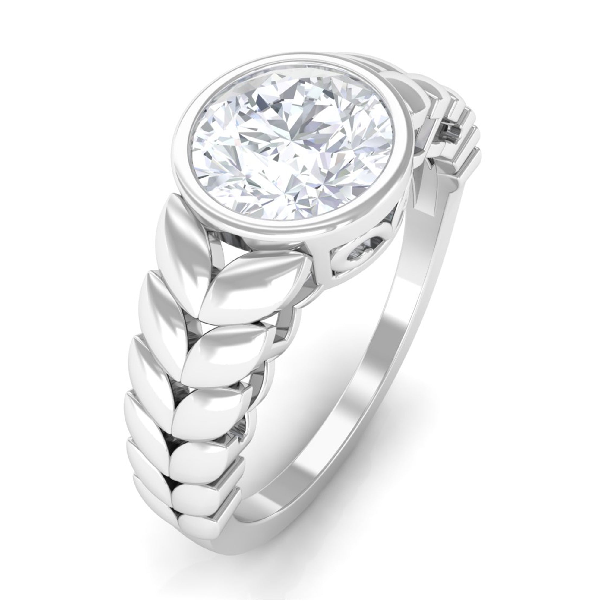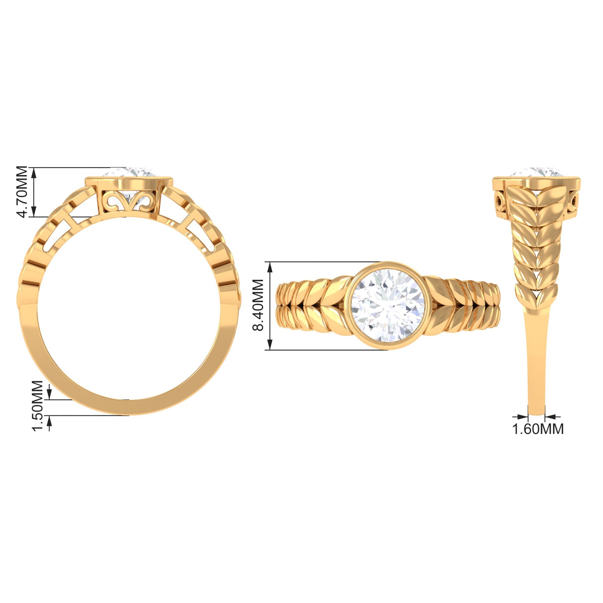 Delicately presenting a breathtaking Round Cut Cubic Zirconia embedded in the center in Bezel Setting, this Cubic Zirconia Engagement Ring features a gold leaf pattern being created at the shank. There is no style more lovely, sophisticated and classic than a Solitaire Engagement Ring.