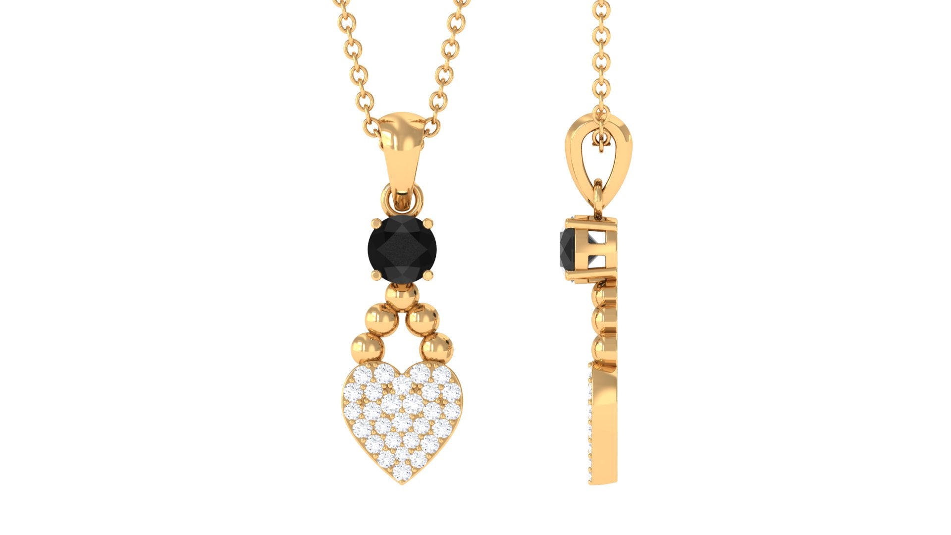 Prepare to be enchanted by the shimmering beauty of this heart-drop pendant. The glimmer metal heart frame is adorned with intricate beaded detailing, adding a touch of elegance and sophistication. A round black diamond gemstone is securely held at its center in a 4-prong setting, radiating its mesmerizing black hues. The heart frame is meticulously set with round diamonds, creating a stunning display of sparkle and brilliance. The drop pendant is elegantly secured with a shiny metal bale, completing the overall design with a seamless finish. Embrace this exquisite pendant aesthetic pleasure and allure, a true testament to timeless elegance and beauty.