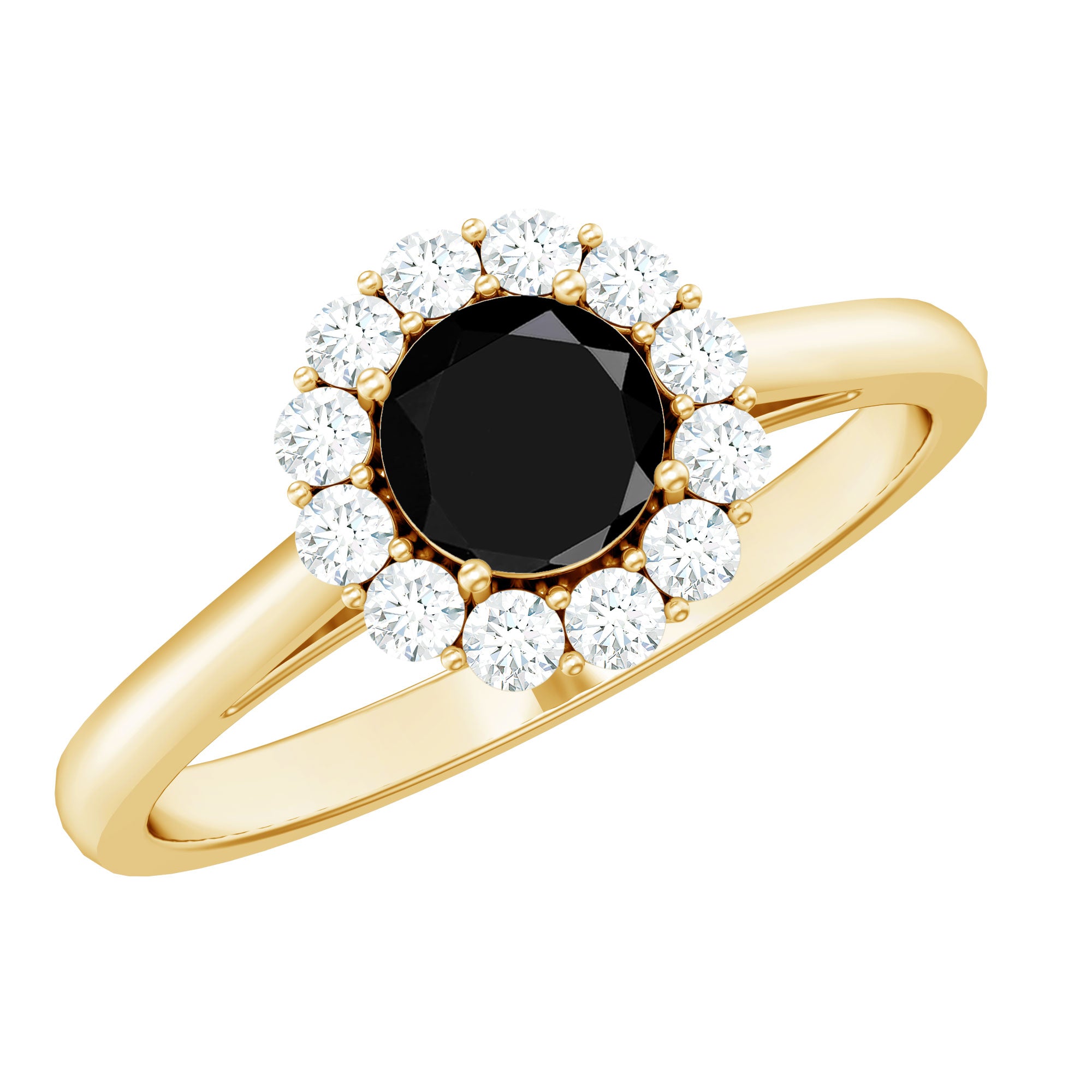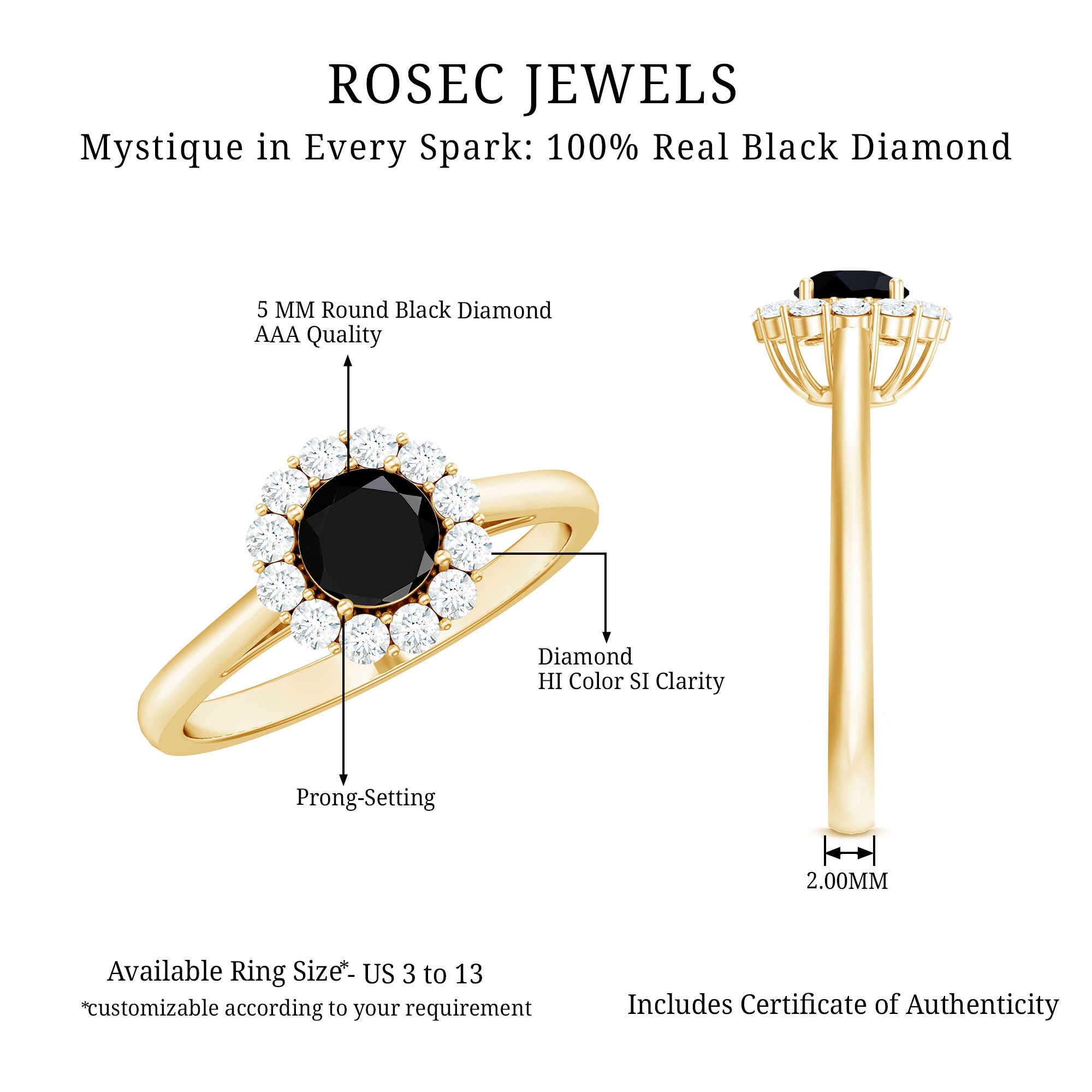 Enhance your beauty with Floating Halo Engagement Ring is embellished with Round Shape Black Diamond Set as a solitaire in a prong setting and Round Shape Diamond in a floating Halo. This Engagement Ring is composed of solid gold.