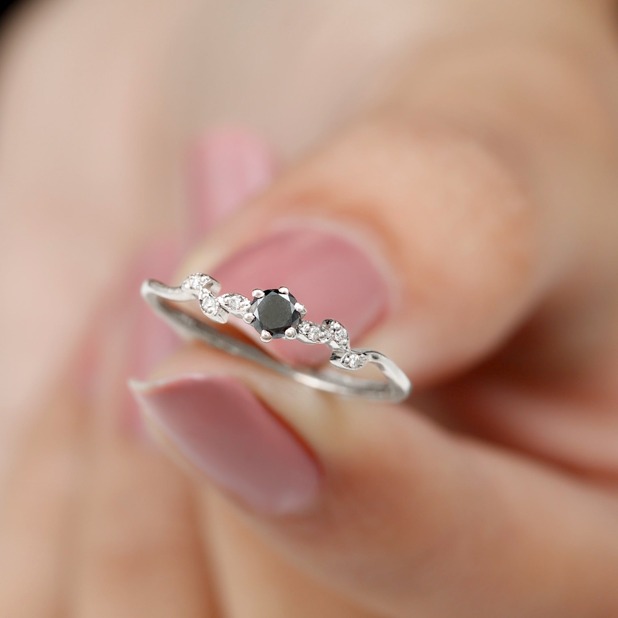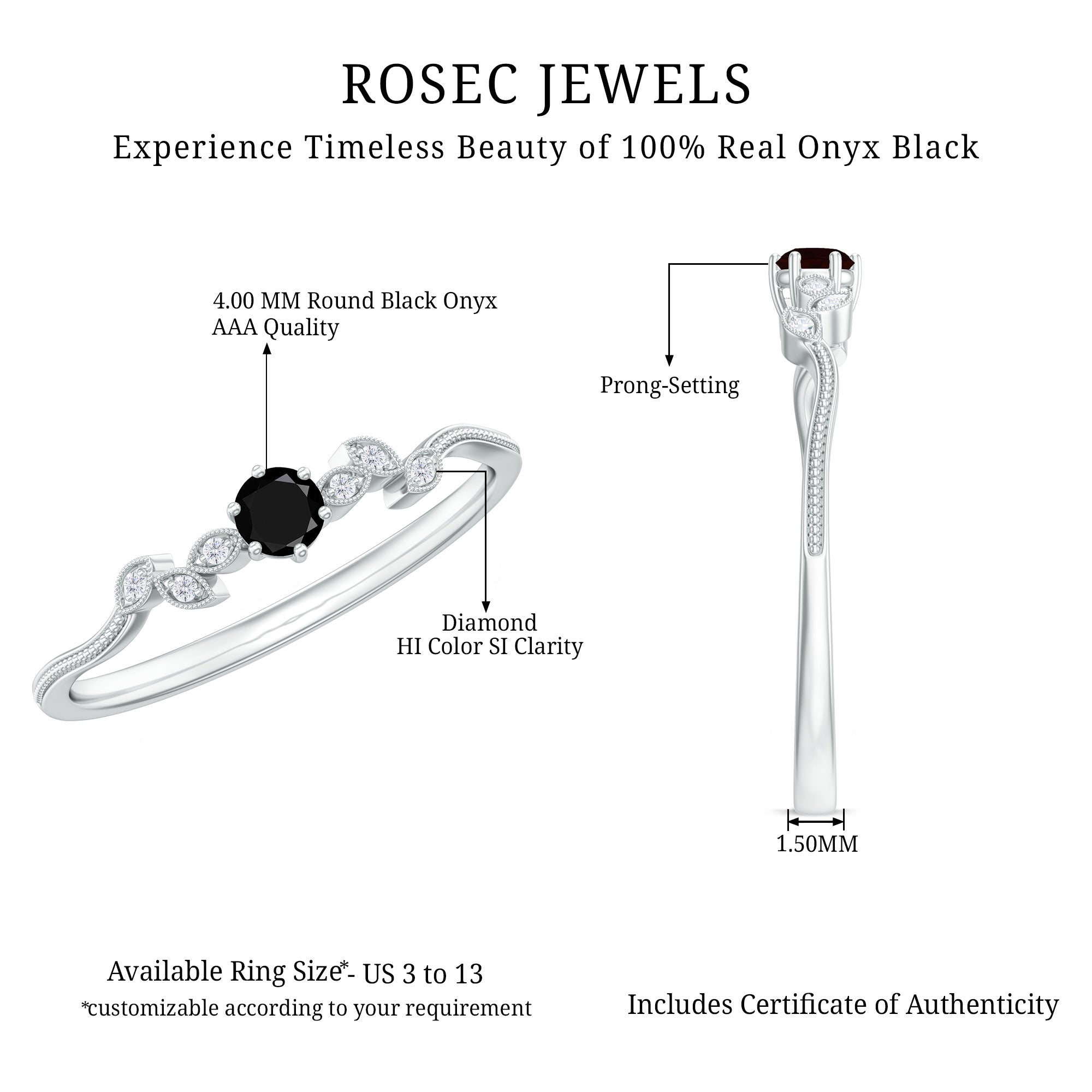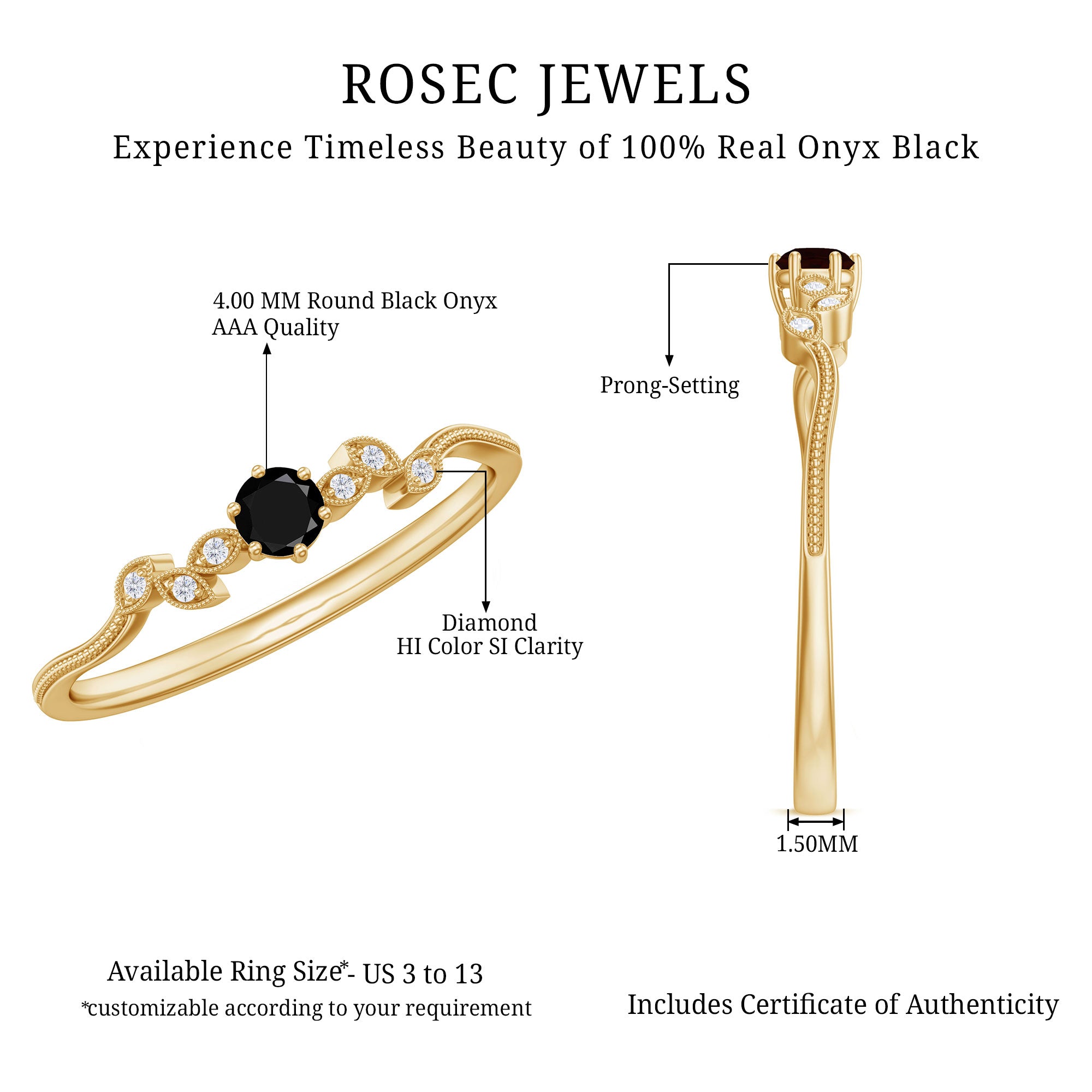 This exquisite promise ring boasts a minimalist design infused with a hint of nature-inspired elegance. At the heart of the ring lies a dazzling 4mm Round shape Black Onyx stone set at the center, elegantly set in a prong setting, accompanied by petite round shape Diamond stones arranged in a leaf motif. The beaded metal band introduces a distinctive texture to the ring, resulting in a subtle yet striking contrast. This Black Onyx Promise Ring is ideal for individuals who value understated beauty and seek a promise ring that embodies both elegance and uniqueness. It serves as a beautiful emblem of love and commitment, destined to be cherished for a lifetime. This Minimal ring is a classic piece that will remain timeless and never fade from style. Available in US sizes from 3 to 13, delivered in a signature jewelry box. Whether it is a promise ring, a gift for Valentine’s Day, or a token that signifies how much someone means to you, it is designed to warm hearts. It is straightforward, it is significant, and it possesses just the right touch of sparkle. Combine it with other jewelry items, wear it as a representation of love, or present it to your beloved, this Black Onyx Ring for Her is the type of piece that anyone would be reluctant to remove. Therefore, if your heart has been longing to express something special, allow this ring to convey your feelings.