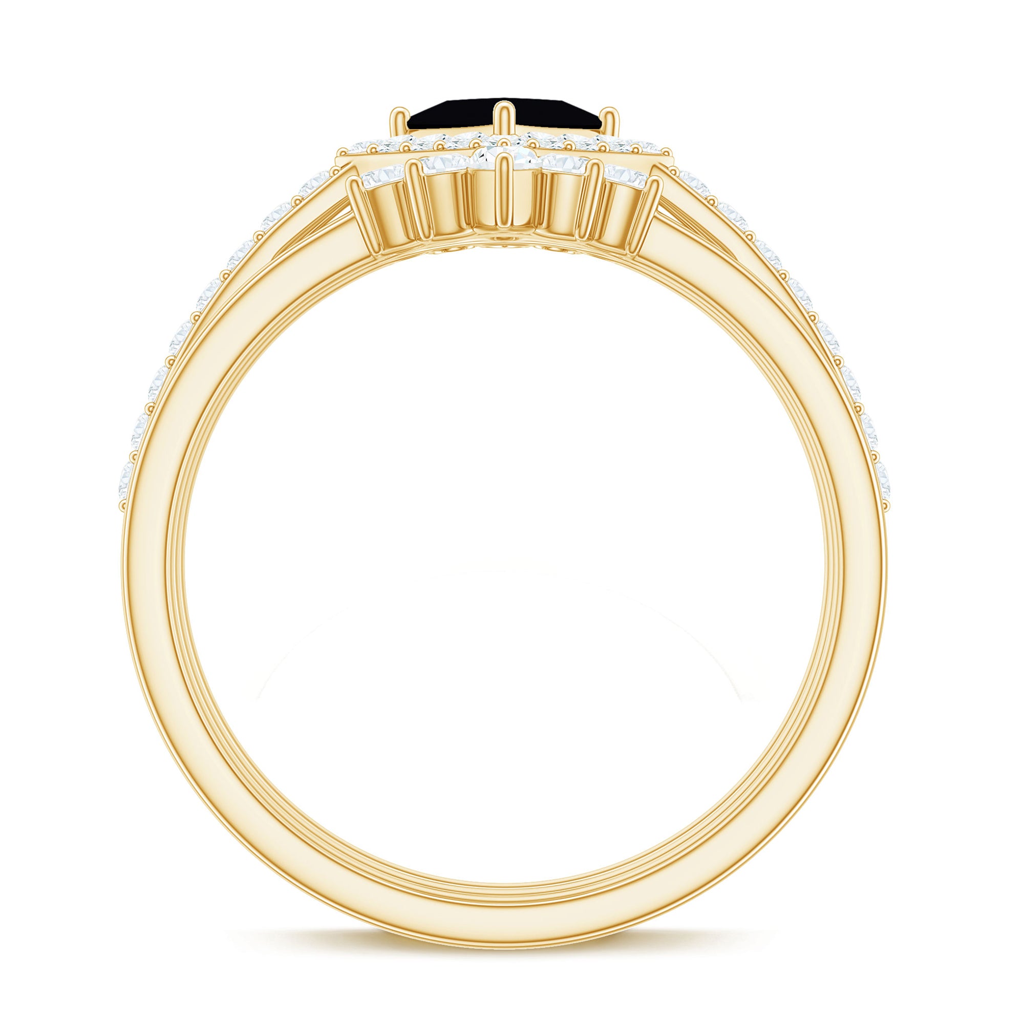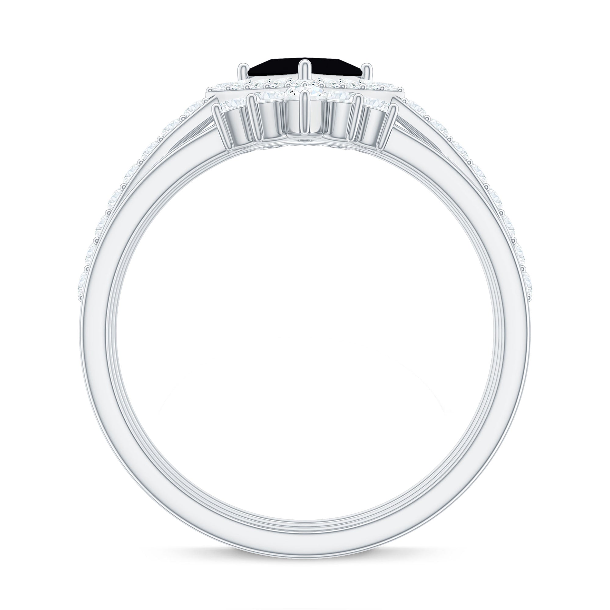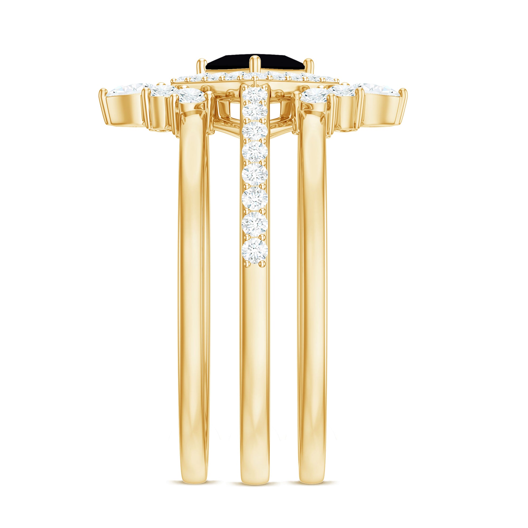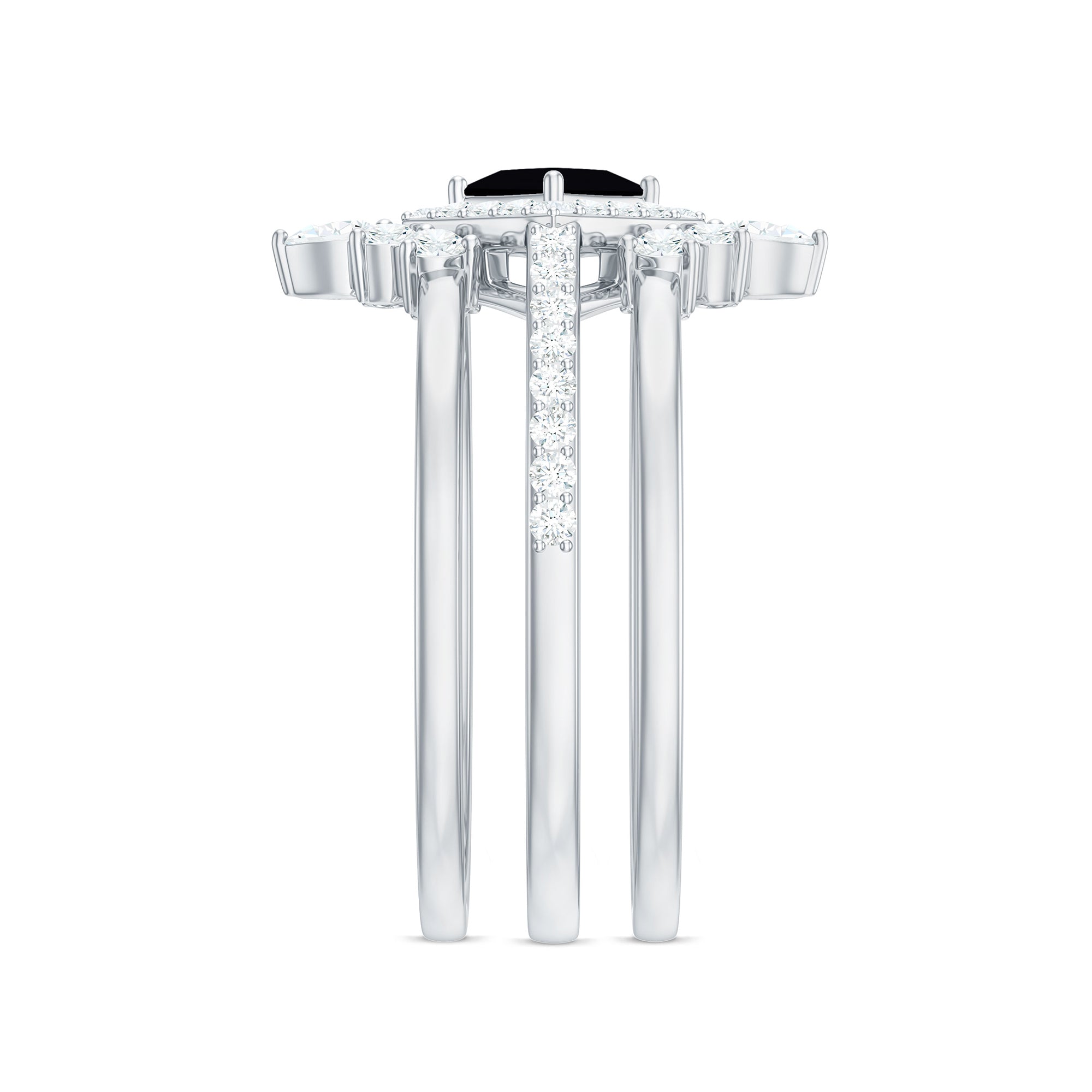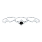 Elevate your beauty and shine like a fashion icon on your special day with this stunning Black Onyx Wedding Ring Set, crafted to attract attention and win your heart. This exquisite 3 Piece Bridal Set provides a flawlessly coordinated appearance that emphasizes its timeless elegance. The focal point is a brilliant 5MM princess cut black onyx, securely held in a prong setting and encircled by a halo of smaller round moissanite stones that also embellish the band. This halo enhances the brilliance and draws focus to the center stone, rendering it exceptionally radiant. Accompanying the engagement ring are two sophisticated stackable bands that elevate the Halo Wedding Set from simple and classic to bold and glamorous. These two crown style enhancers showcase round and pear cut moissanite stones arranged in a distinctive pattern, imparting a complete and harmonious appearance to the Halo Bridal Ring Set. Collectively, they elegantly frame the center ring and enrich the overall design. Experience a sense of royalty while wearing this Wedding Trio Set, each ring representing promise, unity, and everlasting love. The rings are designed to complement one another perfectly, offering versatility; you can wear them individually for a more casual, everyday style or stack all three for a striking, statement-making look.