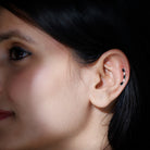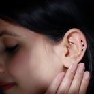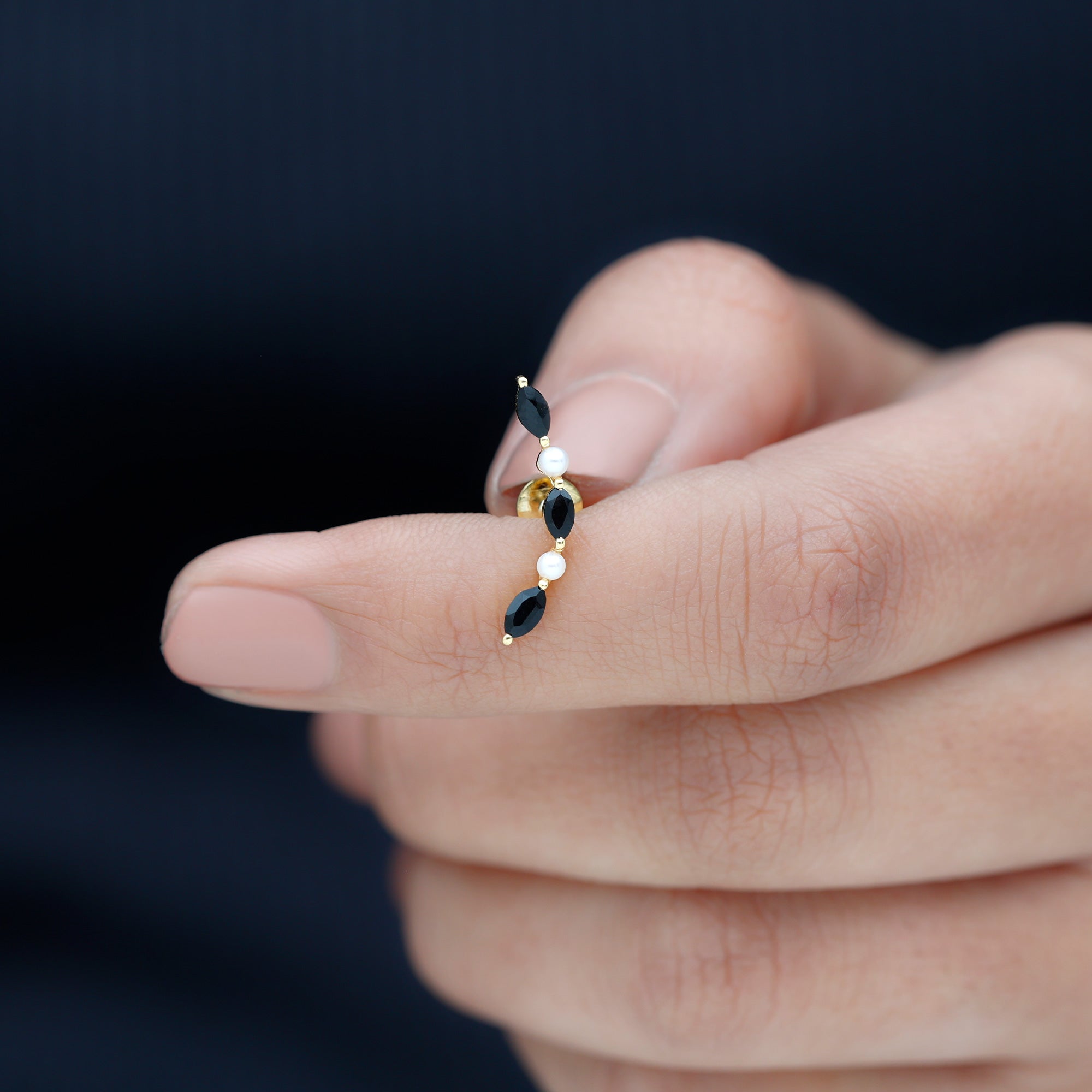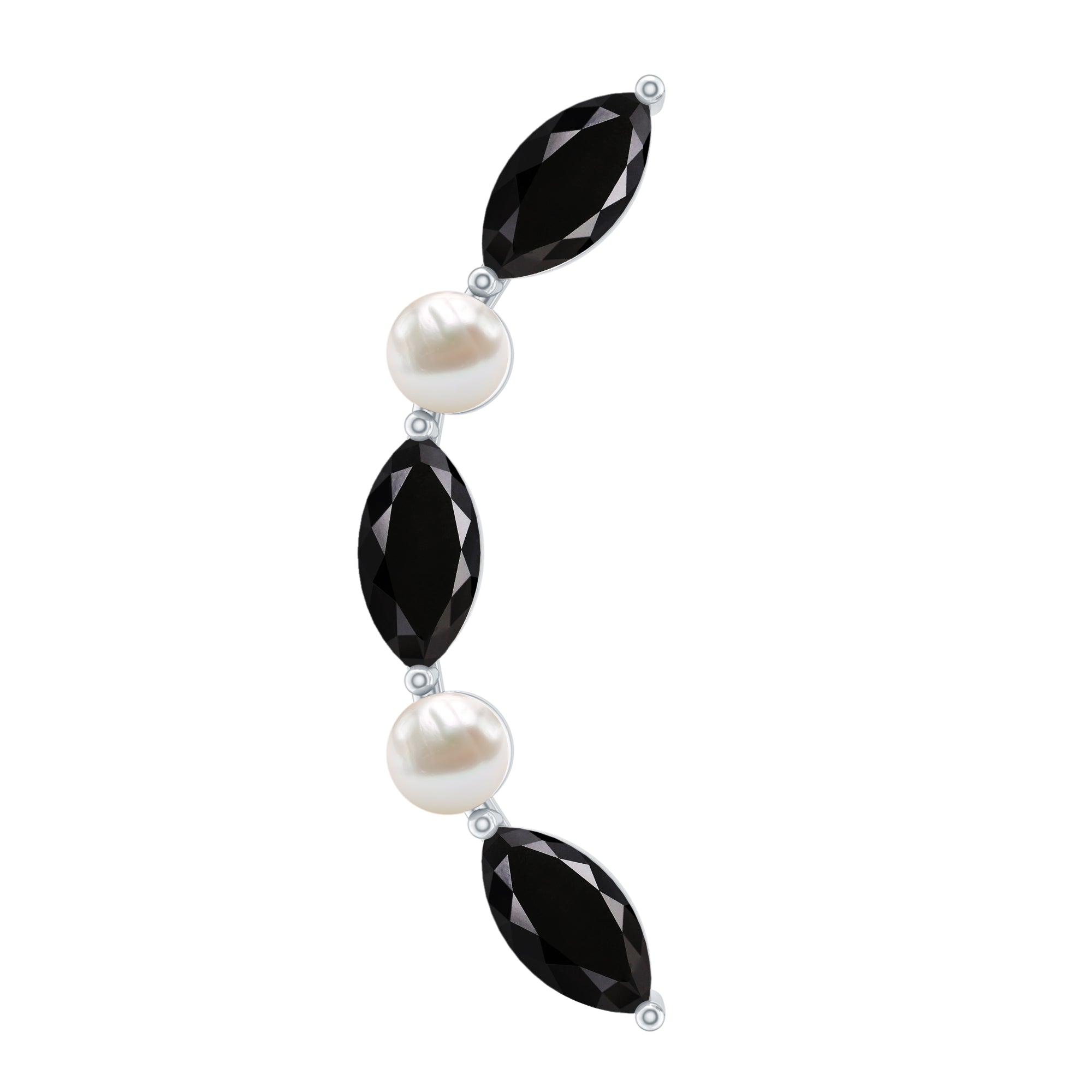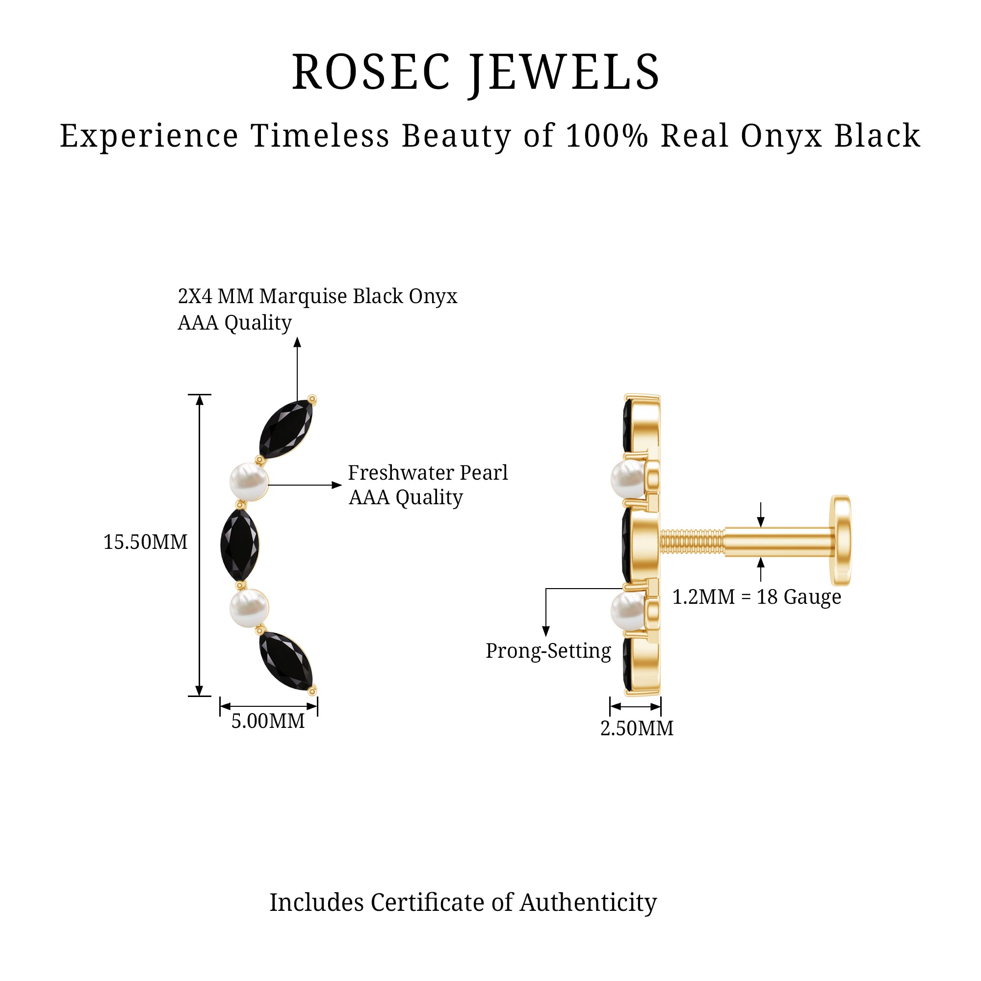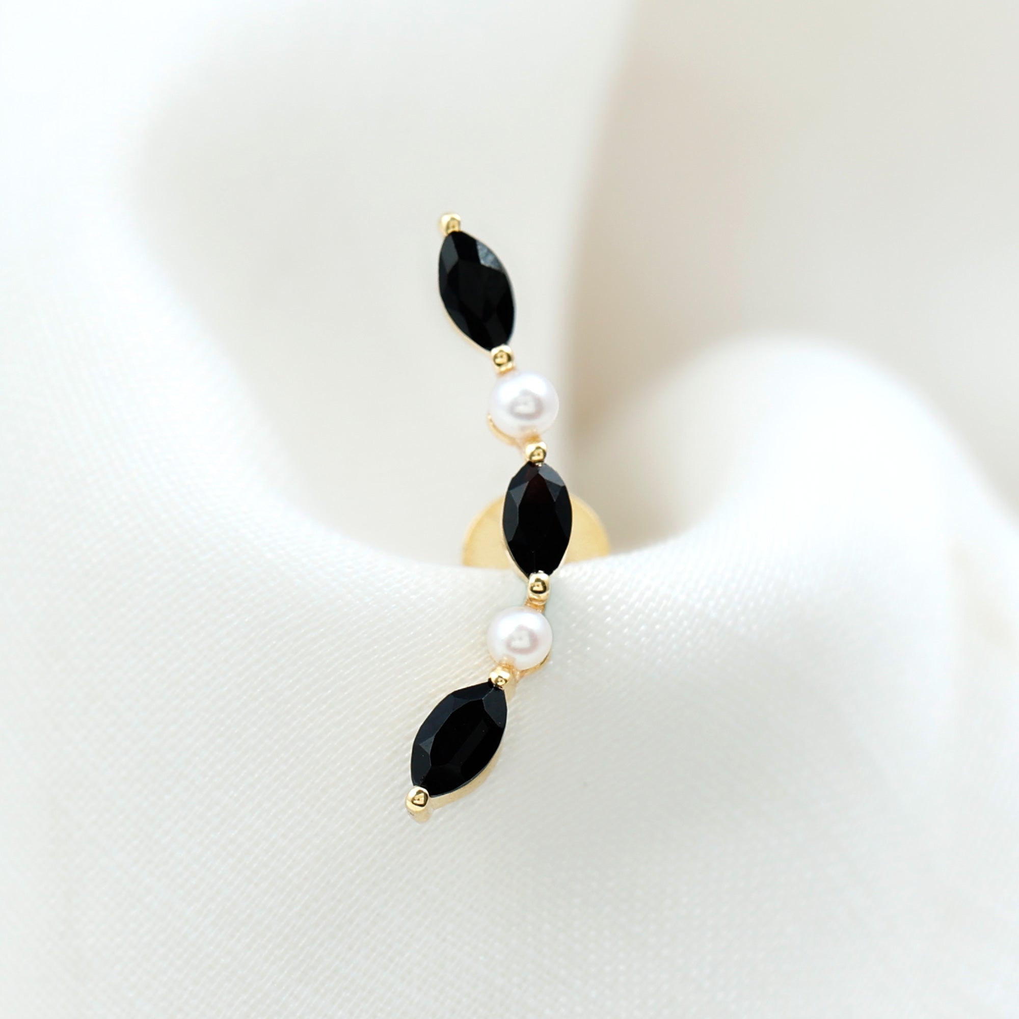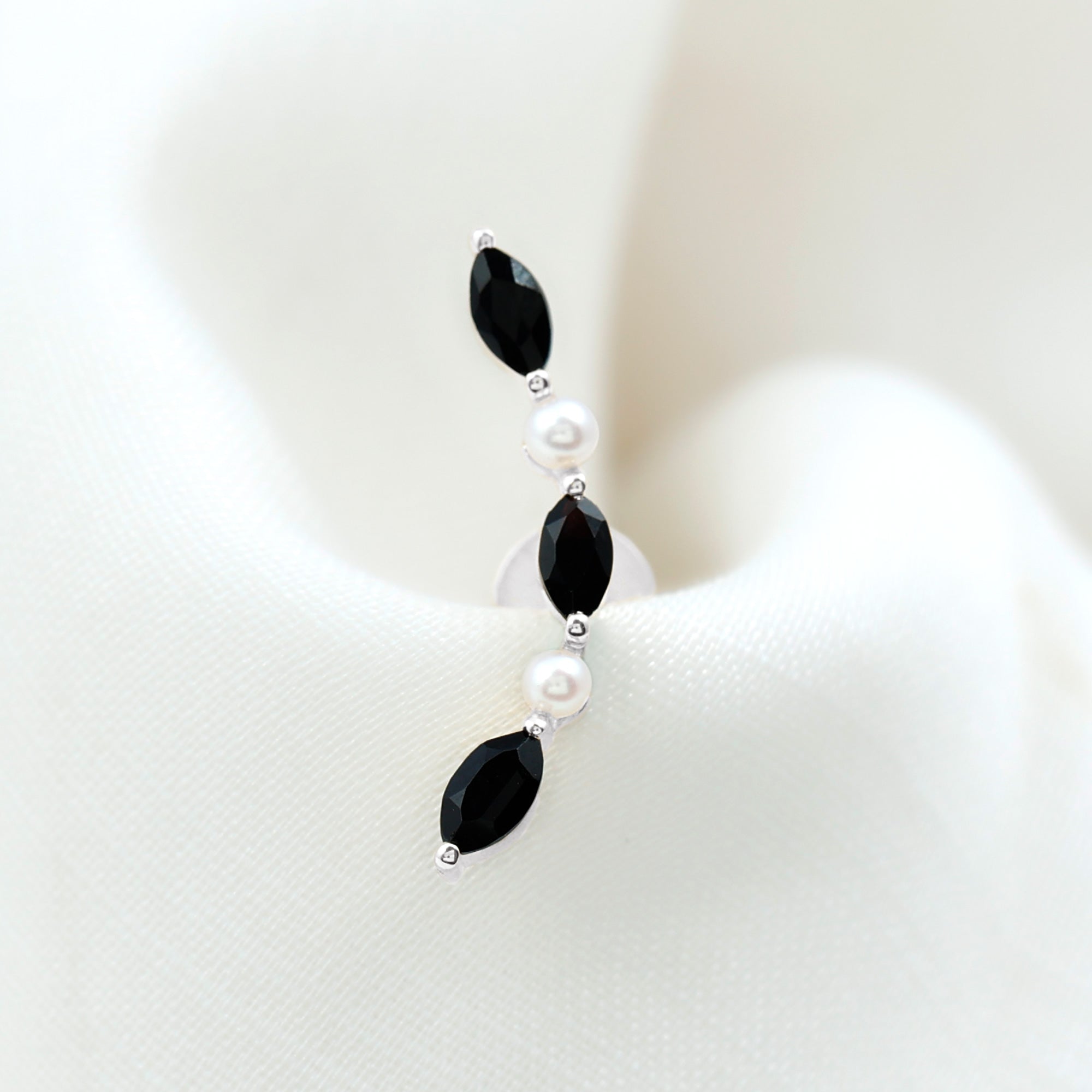 Curves and contrast define this Black Onyx Ear Climber Earring, a striking piece that brings bold elegance to any look. Designed to trace the natural line of the ear, it showcases a curved design that is both modern and captivating. The earring features marquise cut black onyx stones set in secure prongs, their dark tones creating a dramatic and sophisticated appeal. Round freshwater pearls alternate with the onyx, adding classic highlights that enhance the luxurious feel. Engineered for versatility, this Onyx and Pearl Earring can adorn the helix, cartilage, or upper lobe, letting you customize your style with ease. Its graceful curve accentuates the ear, making it a perfect statement piece alone or a stylish complement to other piercings. Ideal for evening events, parties, or elevating everyday outfits, this Ear Crawler Earring is as functional as it is fashionable. Delivered in an elegant jewelry box, it is ready to gift or keep as a standout addition to any collection.
