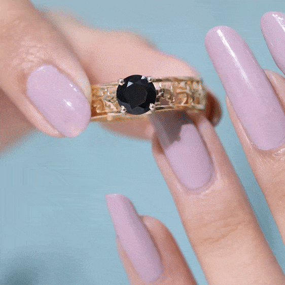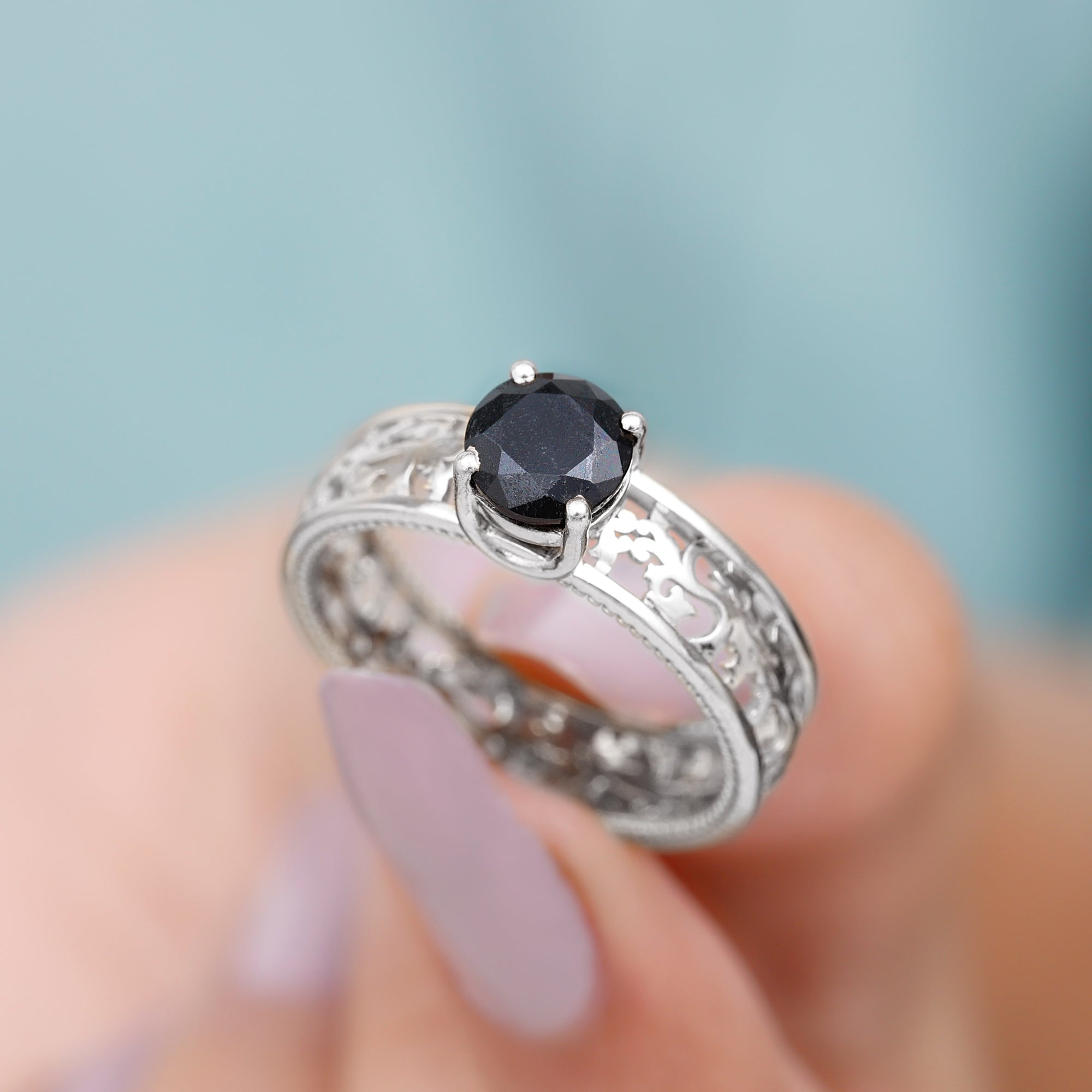 The Band Ring features round shape Black Onyx with Cut Work in Prong Setting. This 7 MM Black Onyx Solitaire Band Ring is a Ring for you to wear with an outfit on your Anniversary.