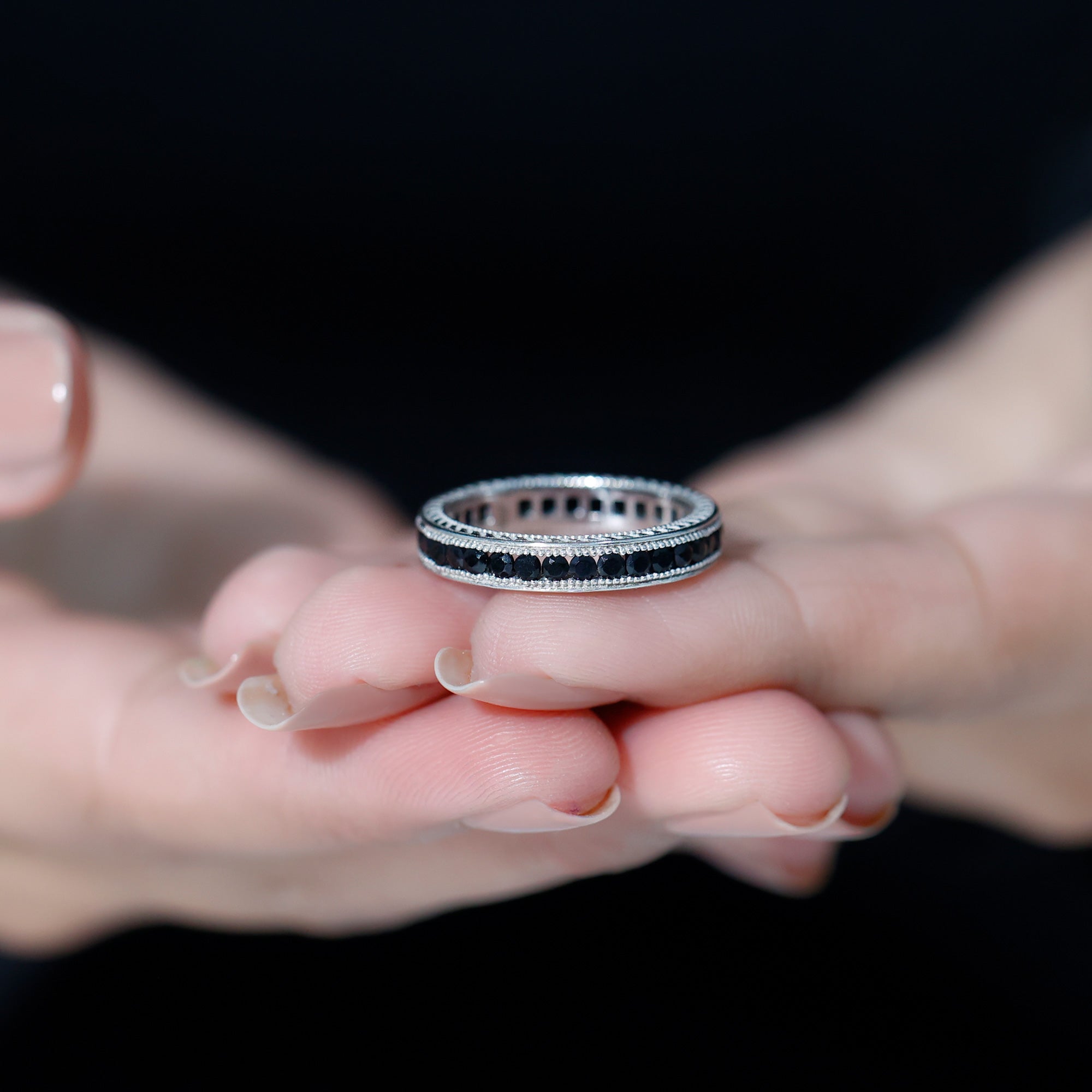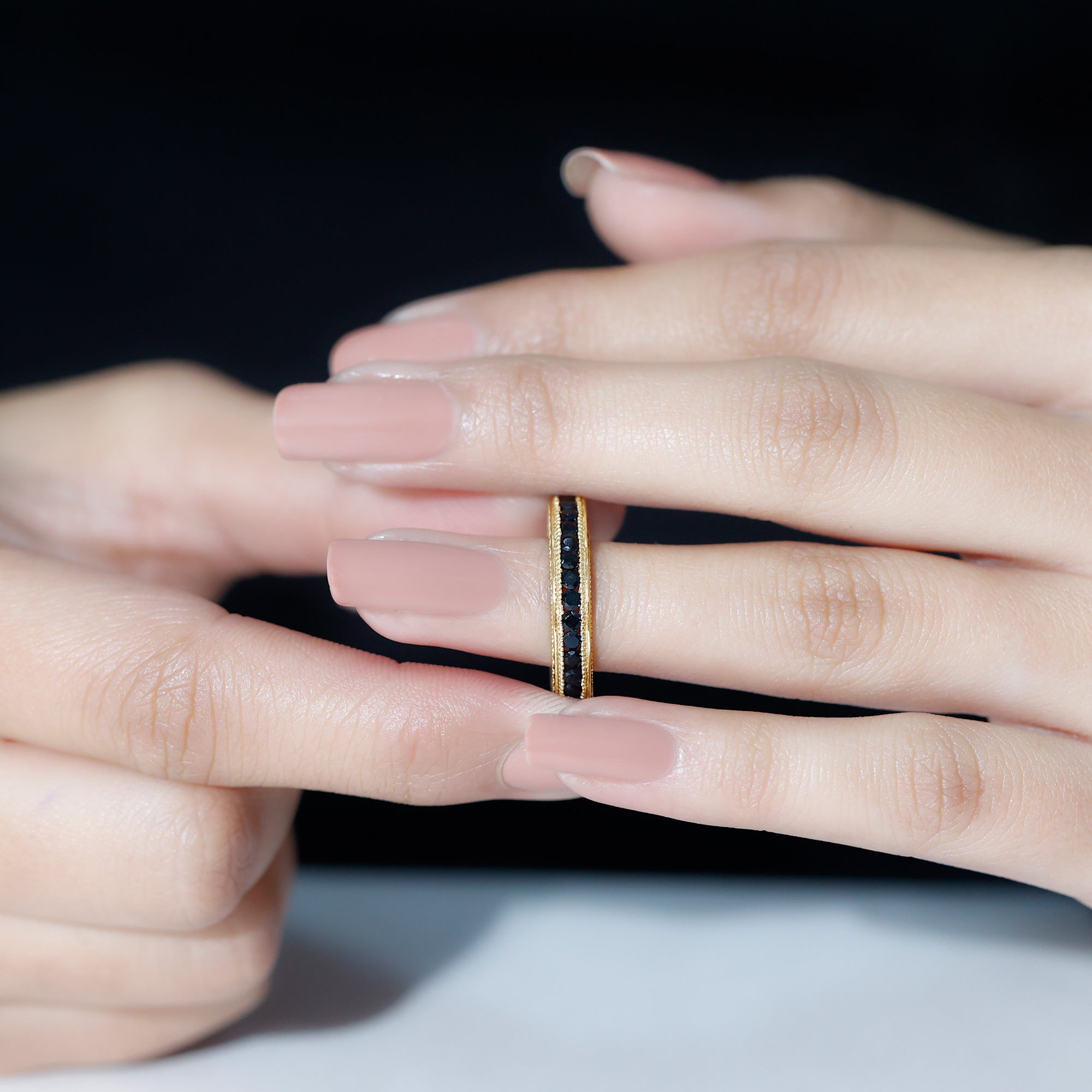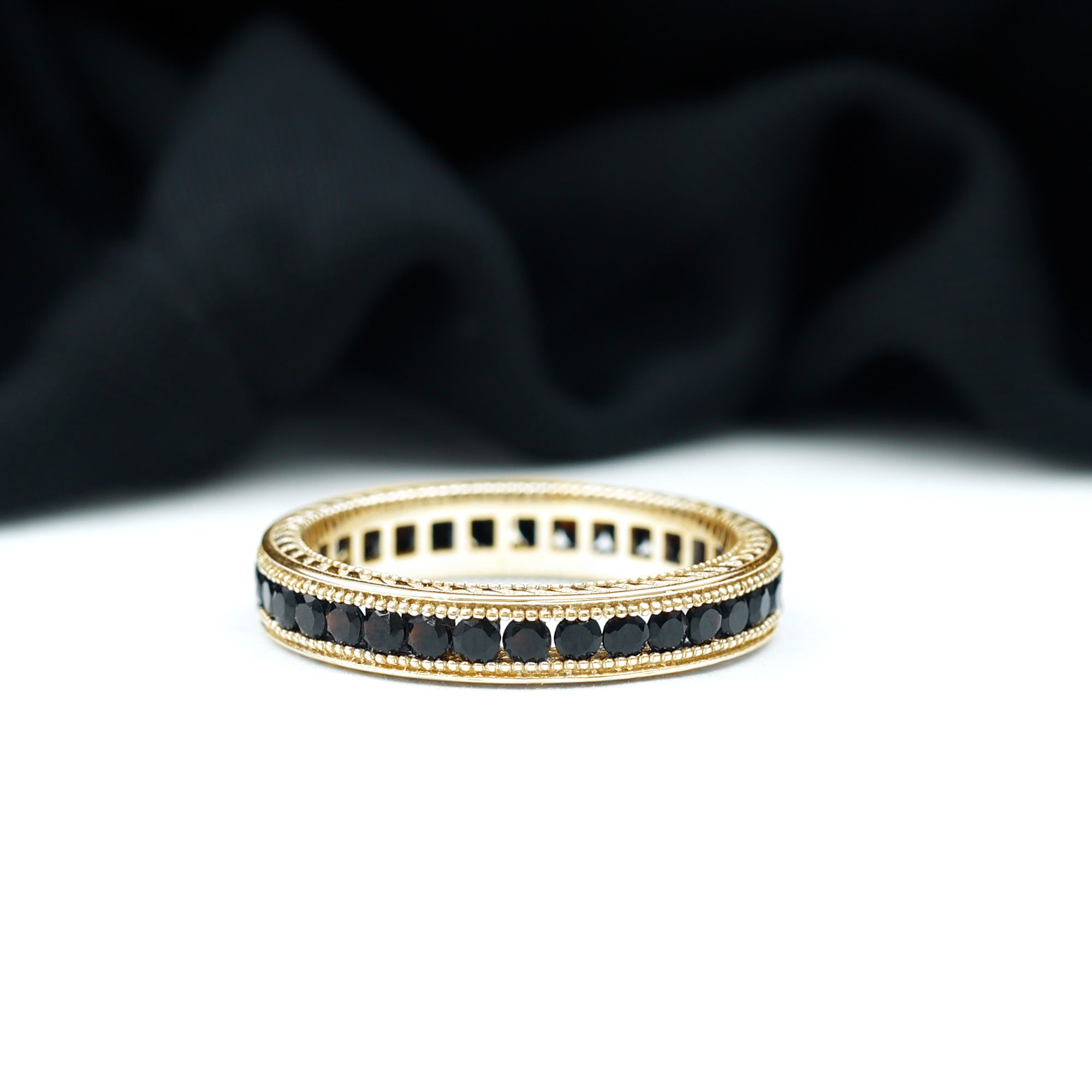 Curves and details come together in perfect harmony with this Onyx Eternity Band, creating a look that is both classic and charming. This Full Eternity Ring features round cut Black Onyx stones that circle the entire band, giving it a continuous flow of dark color. Each black onyx gem is carefully channel set to showcase its natural beauty and shine, making the Eternity Wedding Band a bold yet elegant accessory. Adding to its vintage charm, the edges of the band have delicate beaded detailing, which gives the Black Onyx Wedding Band a unique texture and an old world feel. Perfect for special moments, this Stackable Eternity Ring can be worn alone to make a strong style statement or paired with other rings to create a stacked look. It is a beautiful choice for anniversaries, celebrations, or just to add a touch of timeless elegance to your everyday outfit. Made with AAA quality Black Onyx, the ring is designed to last and maintain its stunning appearance for years to come. Whether you are treating yourself or searching for a thoughtful gift, this Black Onyx Anniversary Band brings a blend of sophistication and classic beauty to any jewelry collection. Its vintage inspired design and careful craftsmanship make it a truly special accessory for anyone who loves jewelry with character and charm.