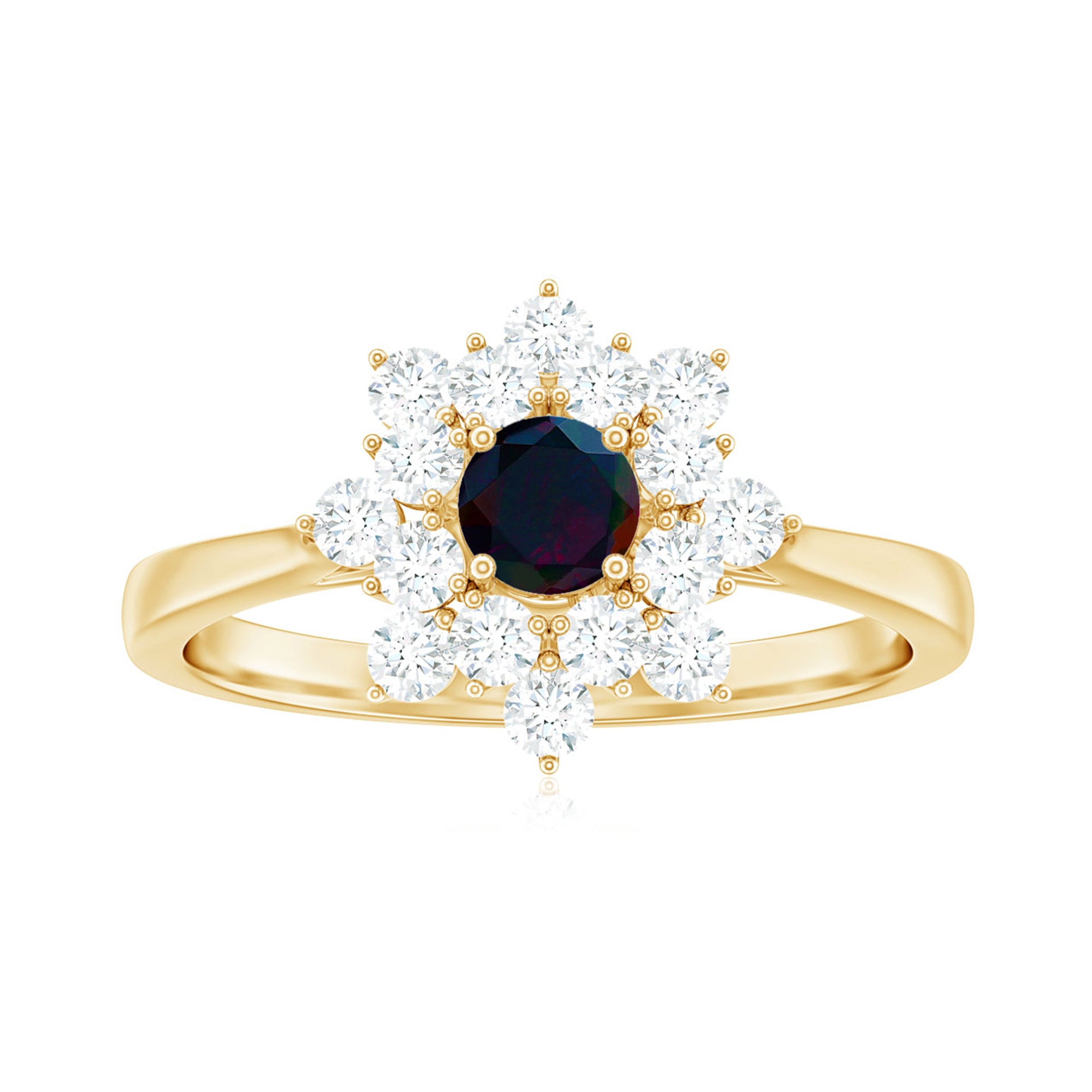 Make heads turn with this mesmerizing Black Opal Engagement Ring, a stunning piece of jewelry for your beloved. Featuring a round-cut Black Opal in a prong setting, surrounded by a halo of Diamond Stones on the engagement ring, this Black Opal Cluster Engagement Ring is crafted from Solid Gold, adding an elegant touch to any outfit.