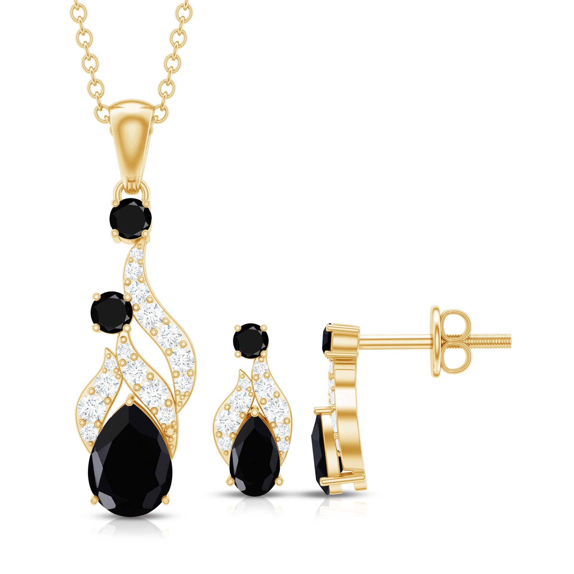 This coordinating jewelry set helps you to make a bold statement while concurrently maintaining a quiet impression. A pear shape black spinel, round shape black spinel, leaf-like motifs, round Diamond and prong setting join together to form an elegant drop design in this bridal jewelry set. Exhibiting a remarkable brilliance, the necklace pendant and earring set are sure to make heads turn in admiration. Dont wait to add an extra sparkle to almost every bridal style with this modish and classic bridal dangle jewelry set.