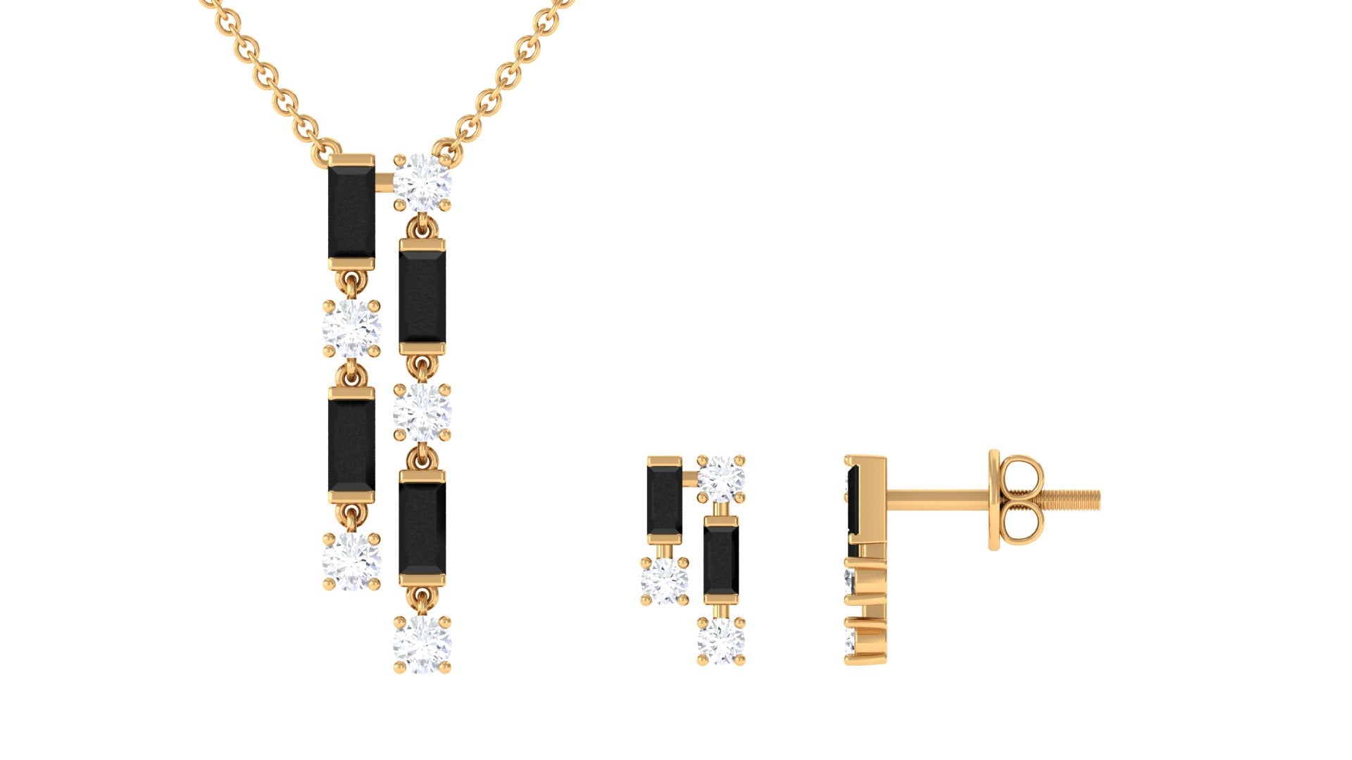 Make a statement with this beautiful Dangle Necklace and Earrings Set, featuring Baguette Cut Black Spinel in a bar setting and round Diamond stones. The intricate design and exquisite craftsmanship of this jewelry set create a stunning contrast, making it a standout piece of jewelry. This Black Spinel necklace set is perfect for adding a touch of luxury to any outfit or special occasion.