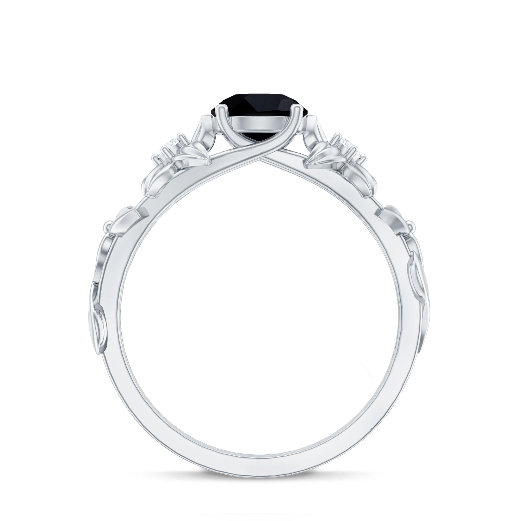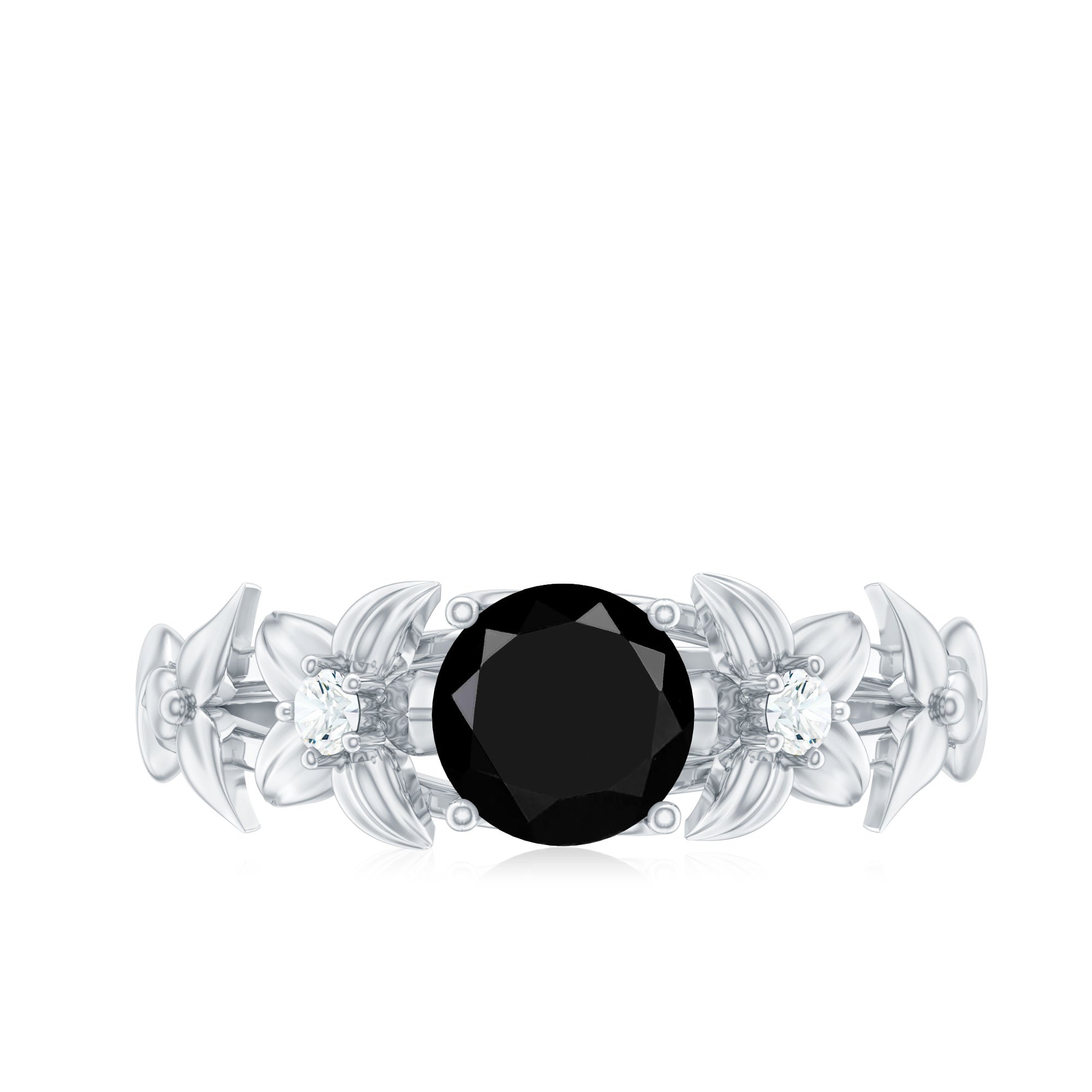 Create a moment shell cherish forever by gifting her this exquisite Flower Engagement Ring on her special day. It features a stunning Round Shape Black Spinel Solitaire at the center, surrounded by the brilliance of Round Shape Diamond stones adorning the floral-inspired shank in a prong setting.