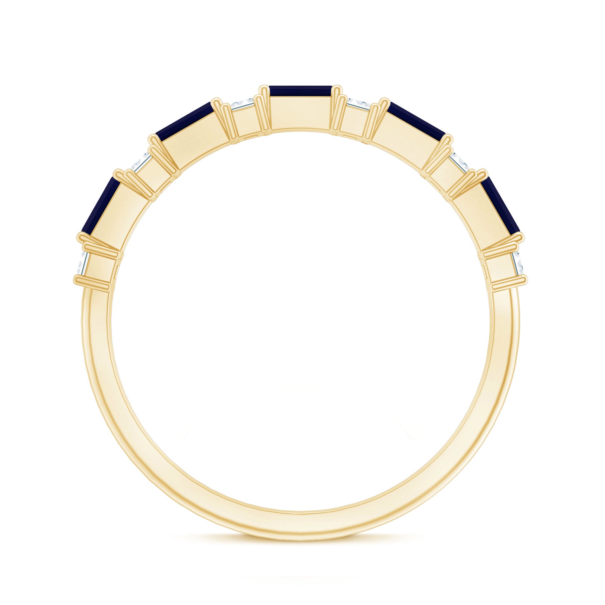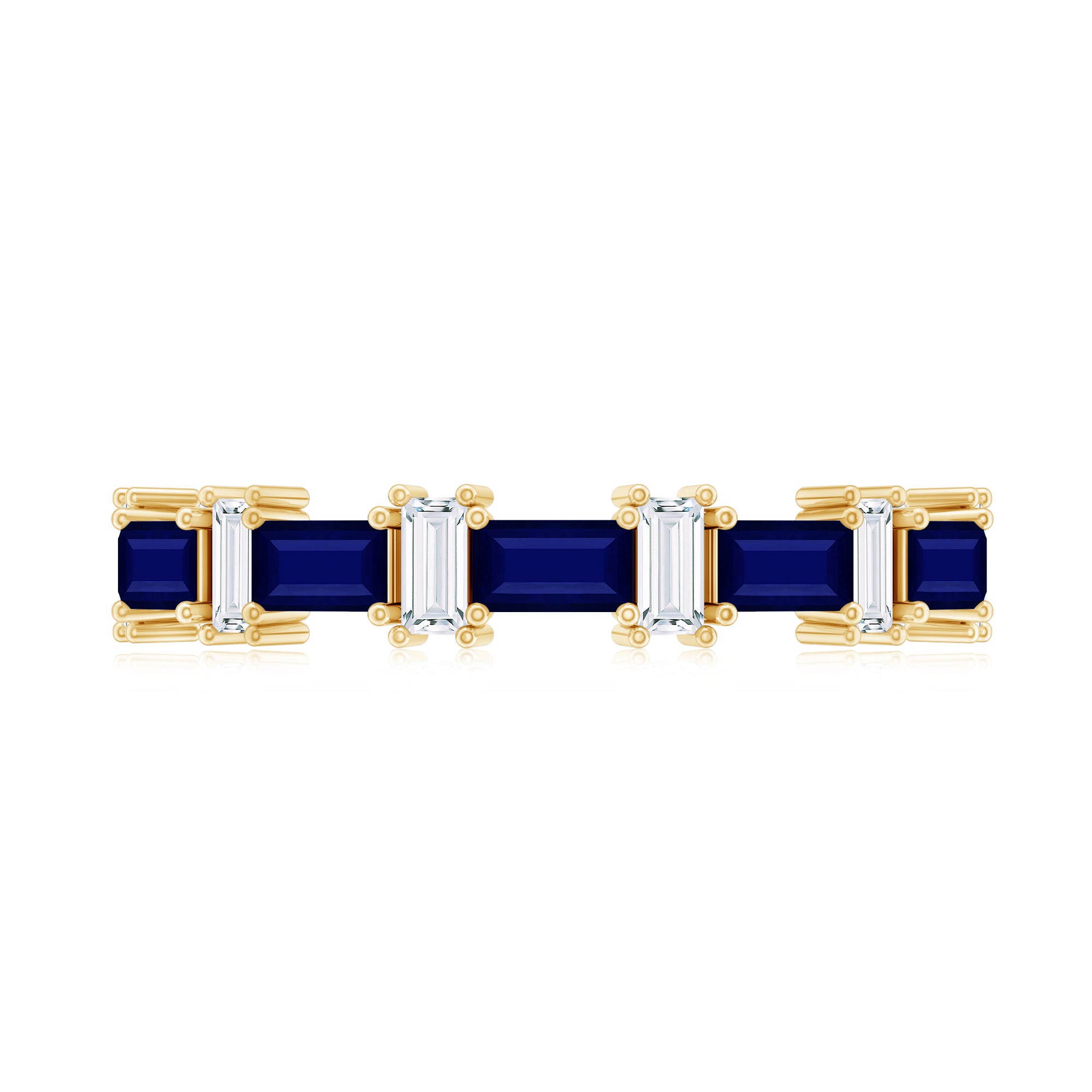 Indulge in the charm and allure of our East West Baguette Half Eternity Band, designed to captivate your ladys heart. Adorned with the timeless beauty of Baguette Cut Blue Sapphires, each securely held in a Prong Setting, and accentuated by Diamonds, this Half Eternity Band Ring is as captivating as it is elegant. A perfect choice for celebrating her special day, its a symbol of your enduring love and the promise of a beautiful future together. Let this Semi Eternity Band be the exquisite token that expresses your affection and devotion.