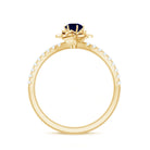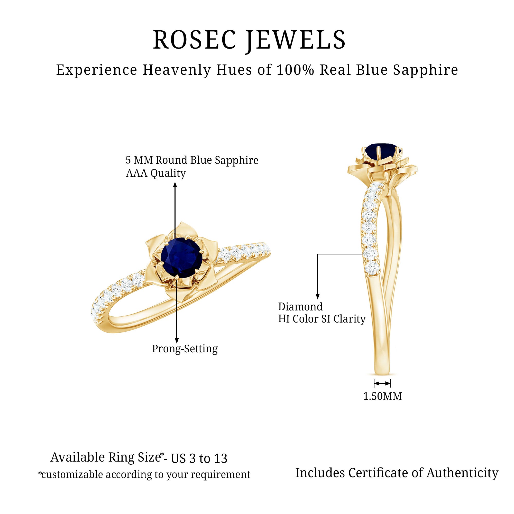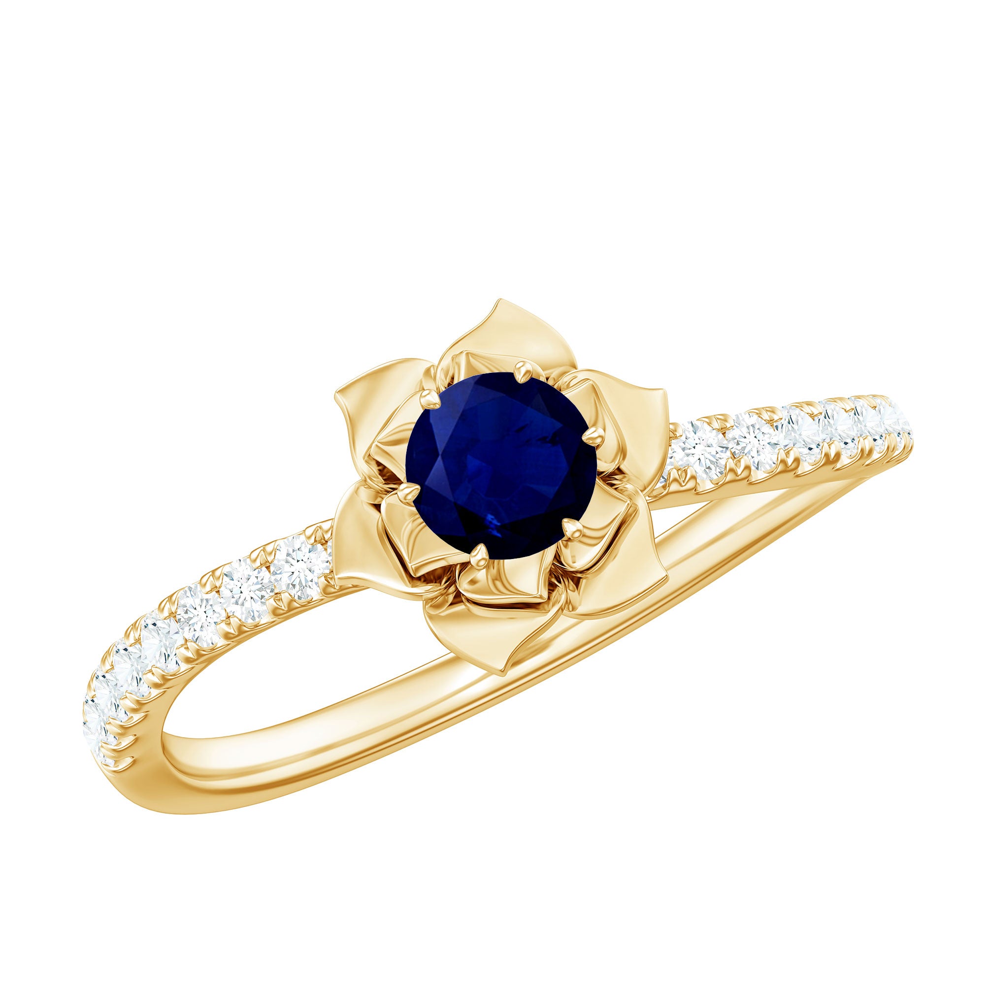 The Perfect Combination of Blue Sapphire and Diamond in this Rose Flower Ring is mesmerizing. The Round Natural Blue Sapphire is set in Centre of a Gold Petals of Rose Flower in the curved shank. Get this Floral Inspired Engagement Ring for your Blooming Lady Love, this Blue Sapphire and Diamond Engagement Ring is a stunning jewelry, which she will cherish her whole life.