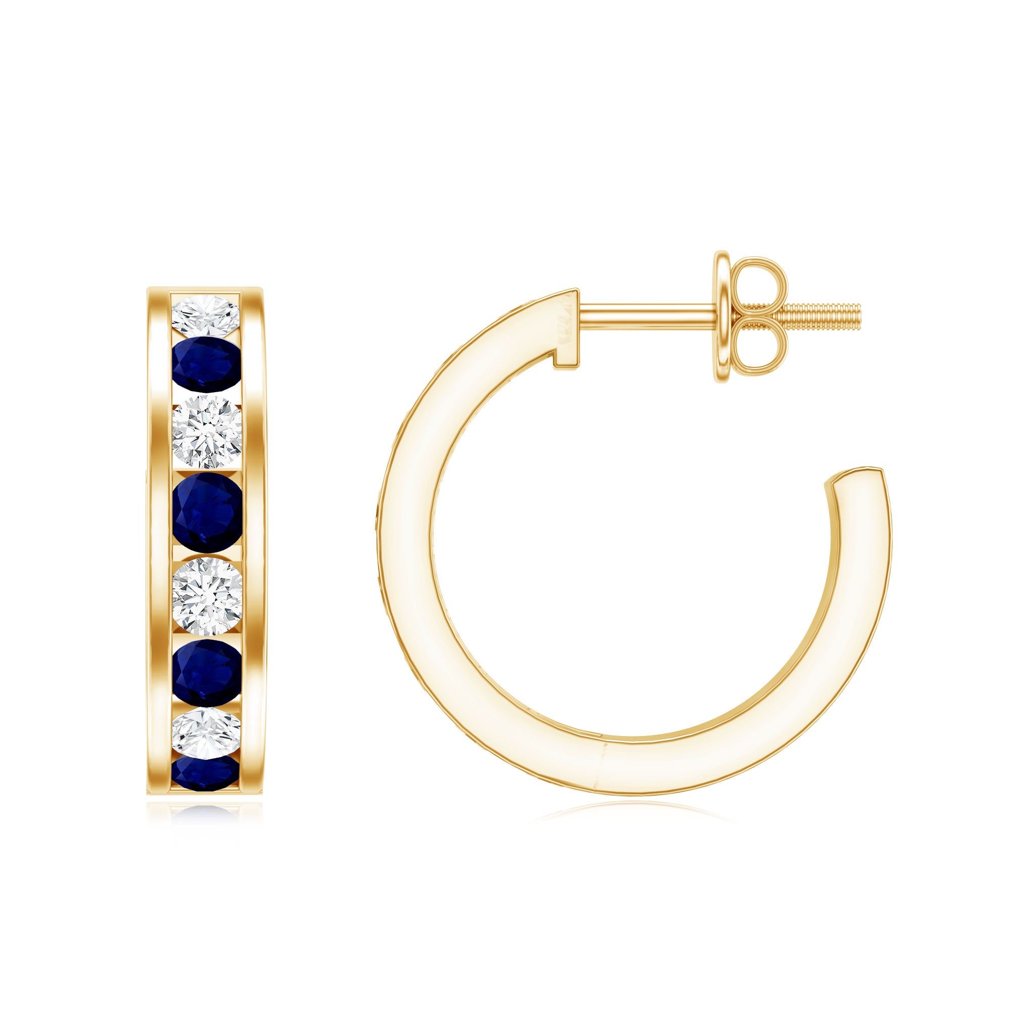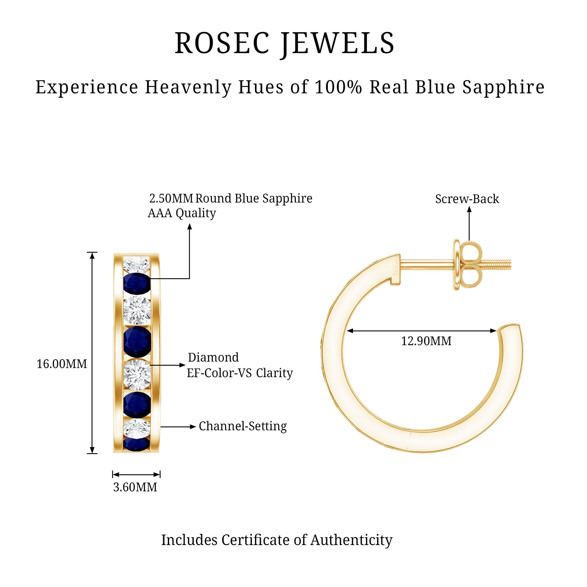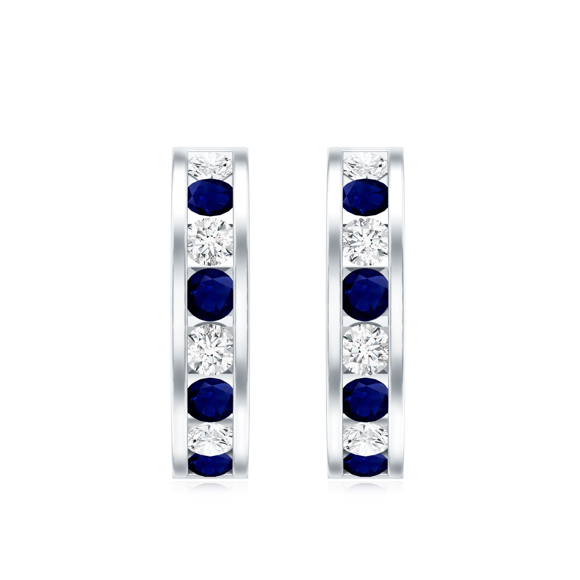 These Real Blue Sapphire Earrings boast a timeless bespoke design that gives them a classic vibe, making them suitable for any event. They feature Round Shape Blue Sapphires set in Channel Setting, alternating with Lab Grown Diamonds, resulting in a truly unique piece. These Sapphire and Diamond Earrings are remarkable and built to last. They are designed with a secure screw back closure, so you wont have to worry about them falling off. The striking contrast between AAA Quality Natural Blue Sapphire and EF-VS Quality Man Made Diamonds exudes elegance with a daring twist that catches the eye. The bold Half Hoop Design adds a sculptural element, making them feel both modern and timeless, like a treasure from a queens collection. These Channel Set Earrings are ideal for transforming a basic outfit into a statement piece, while also radiating confidence, mystery, and a touch of mischief.