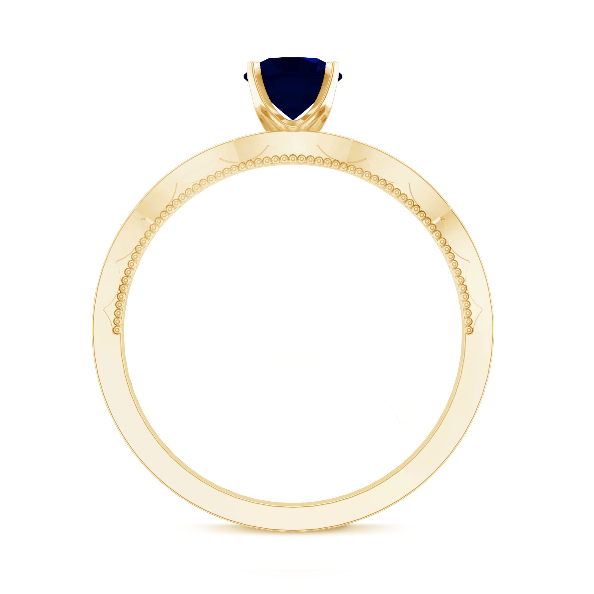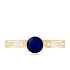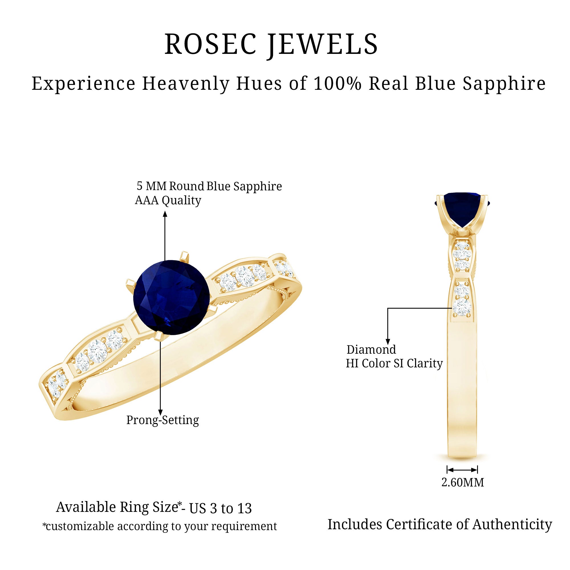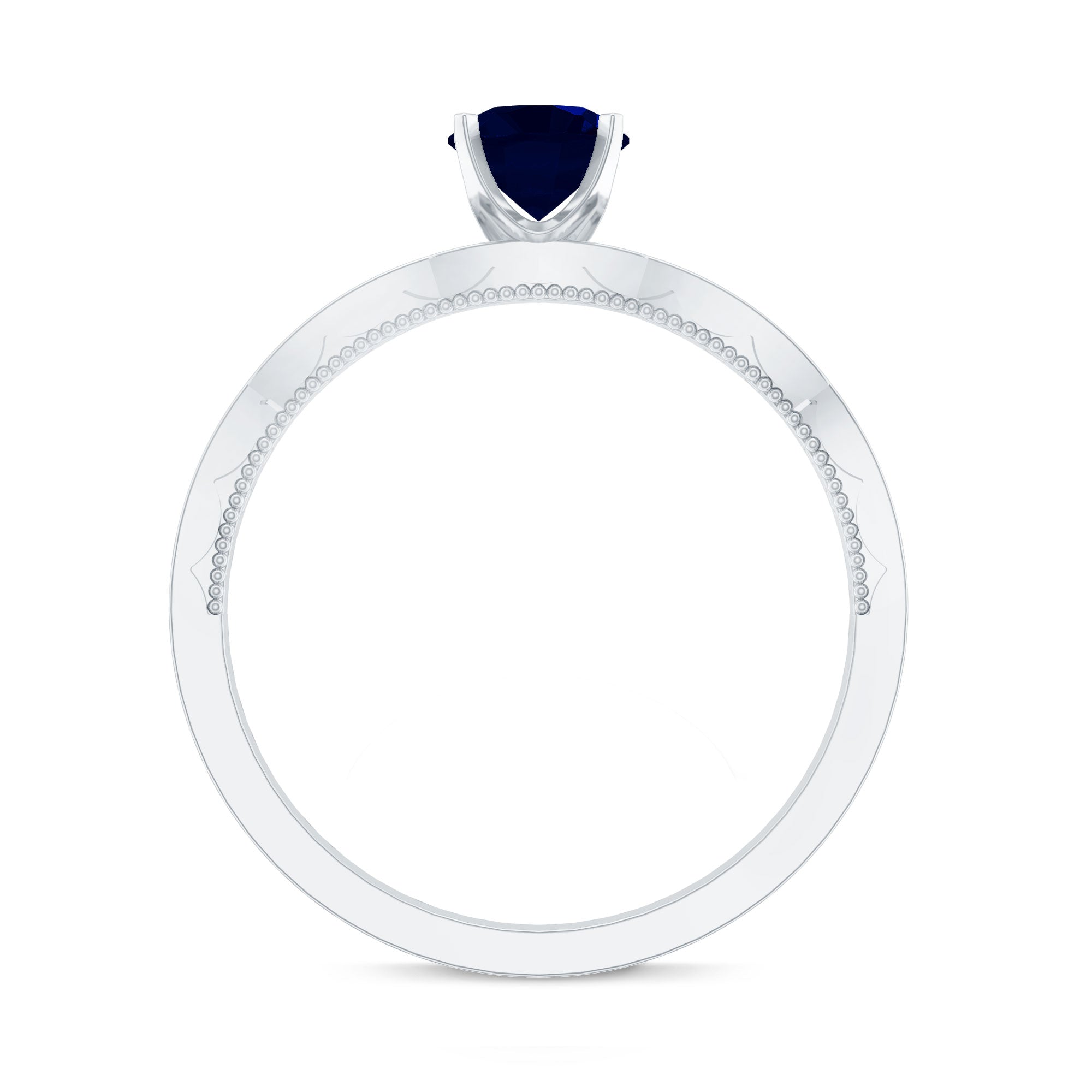 Embark on a journey of everlasting love with this Solitaire Engagement Ring. Embellished with Round Shape Blue Sapphire gemstone set as a center stone with sparkling Diamond Side Stones and Beaded Detailing.