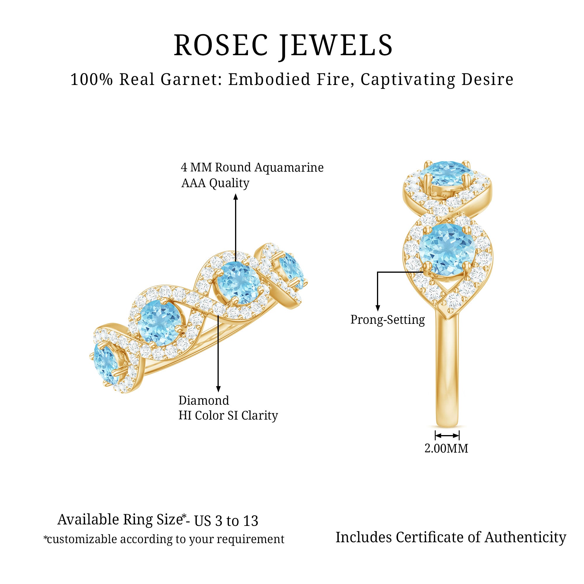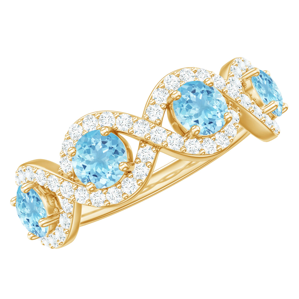 Representing two lives walking through life hand in hand, this Braided Ring creates a constant reminder of an unbreakable connection. This Half Eternity Ring features Round Shape Aquamarine gemstones set in Prong Setting highlighted by Diamond gemstones studded over the braided design. It would be a perfect Anniversary gift for your beloved wife and will be cherished by her for lifetime.